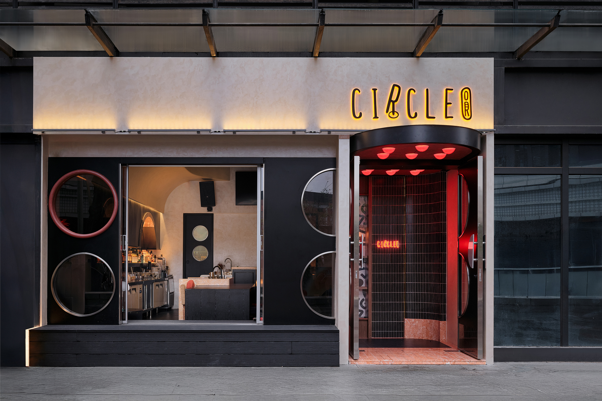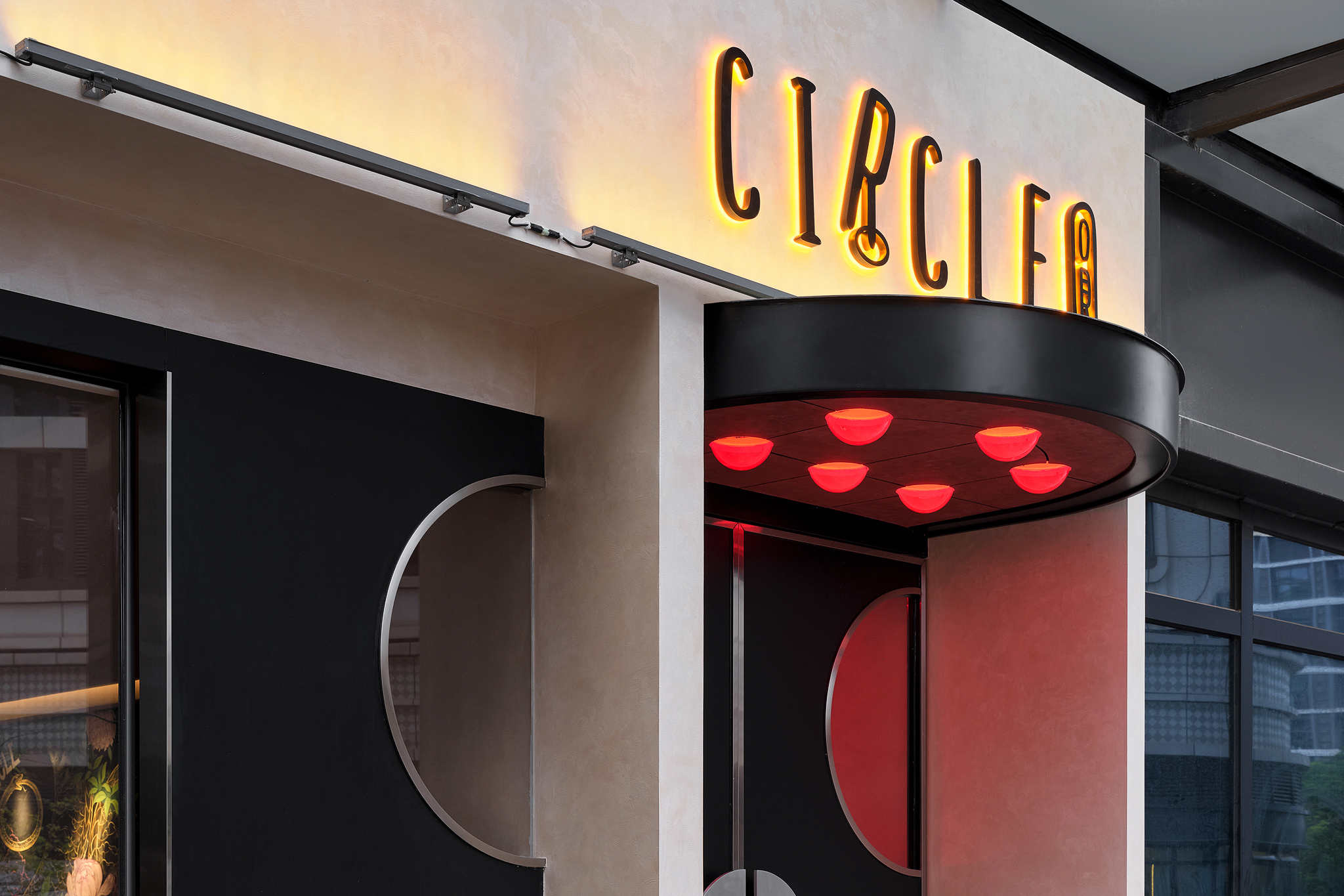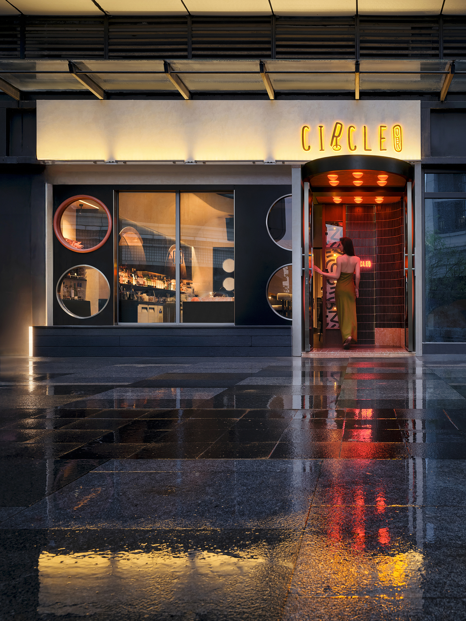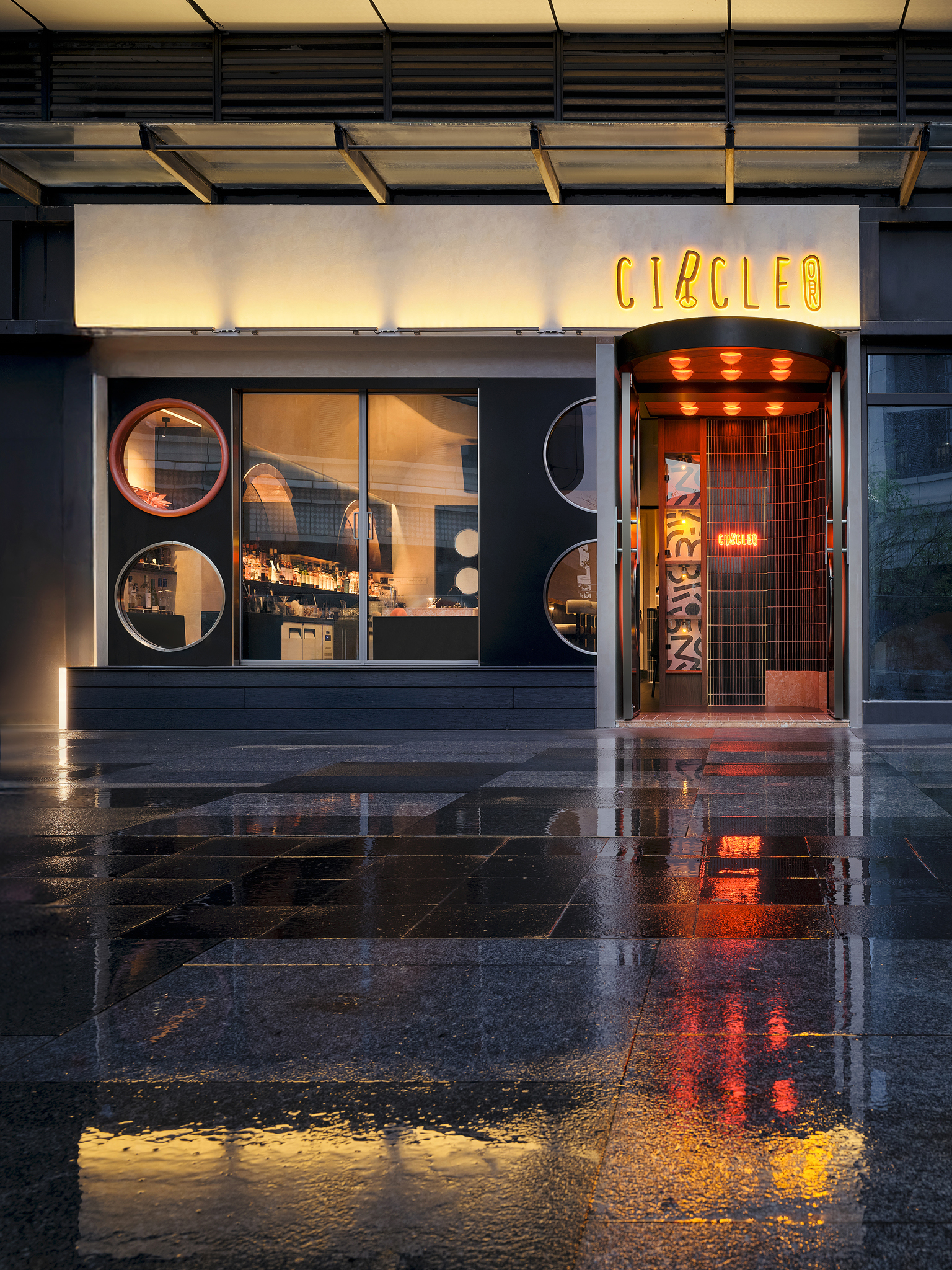 招牌处独特字体搭配暖光灯光,醒目又具有复古未来格调。墙面圆形开窗与入口处圆形元素呼应,黑与红的色彩碰撞,在夜晚营造出神秘热烈氛围。 -