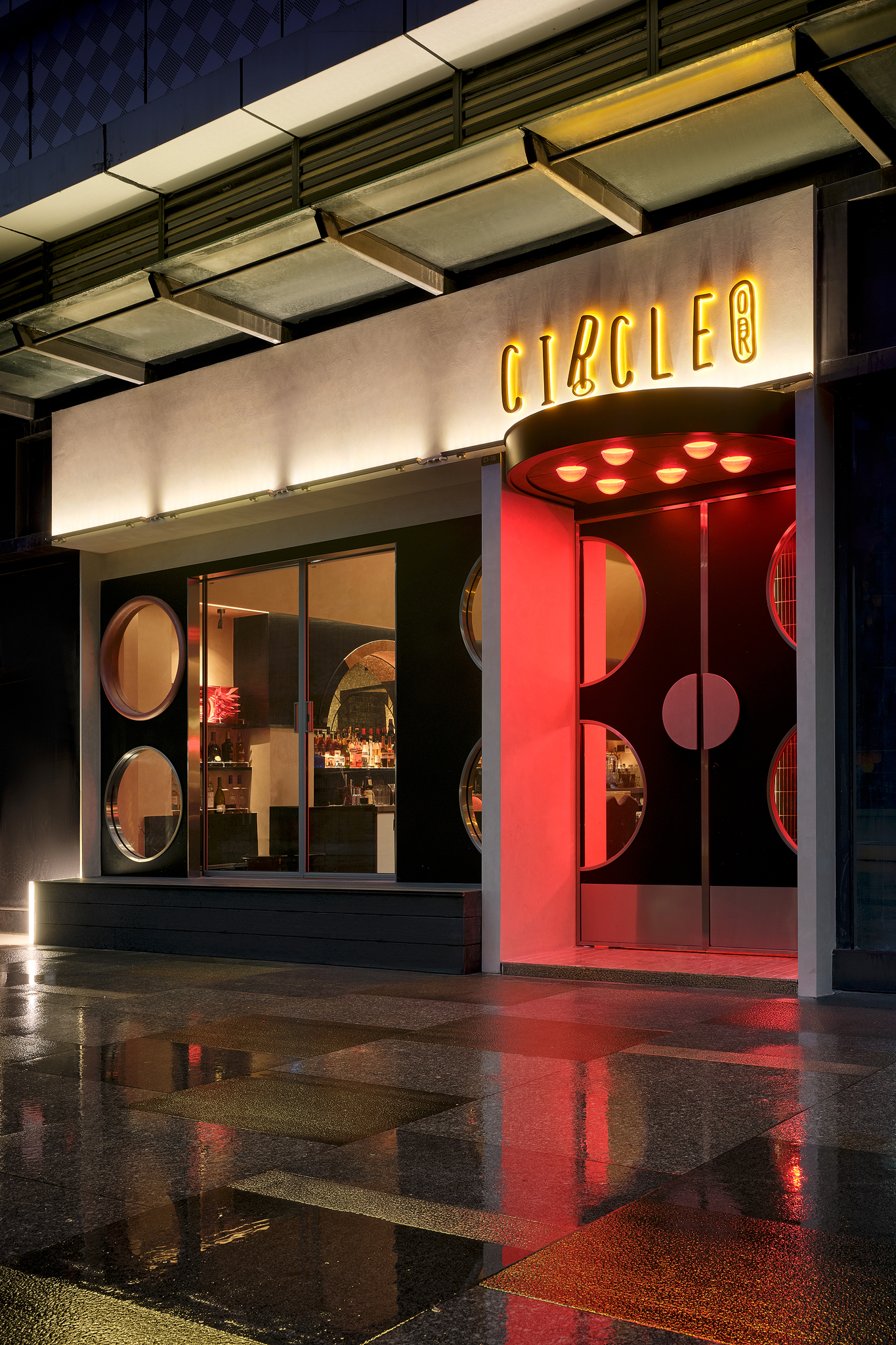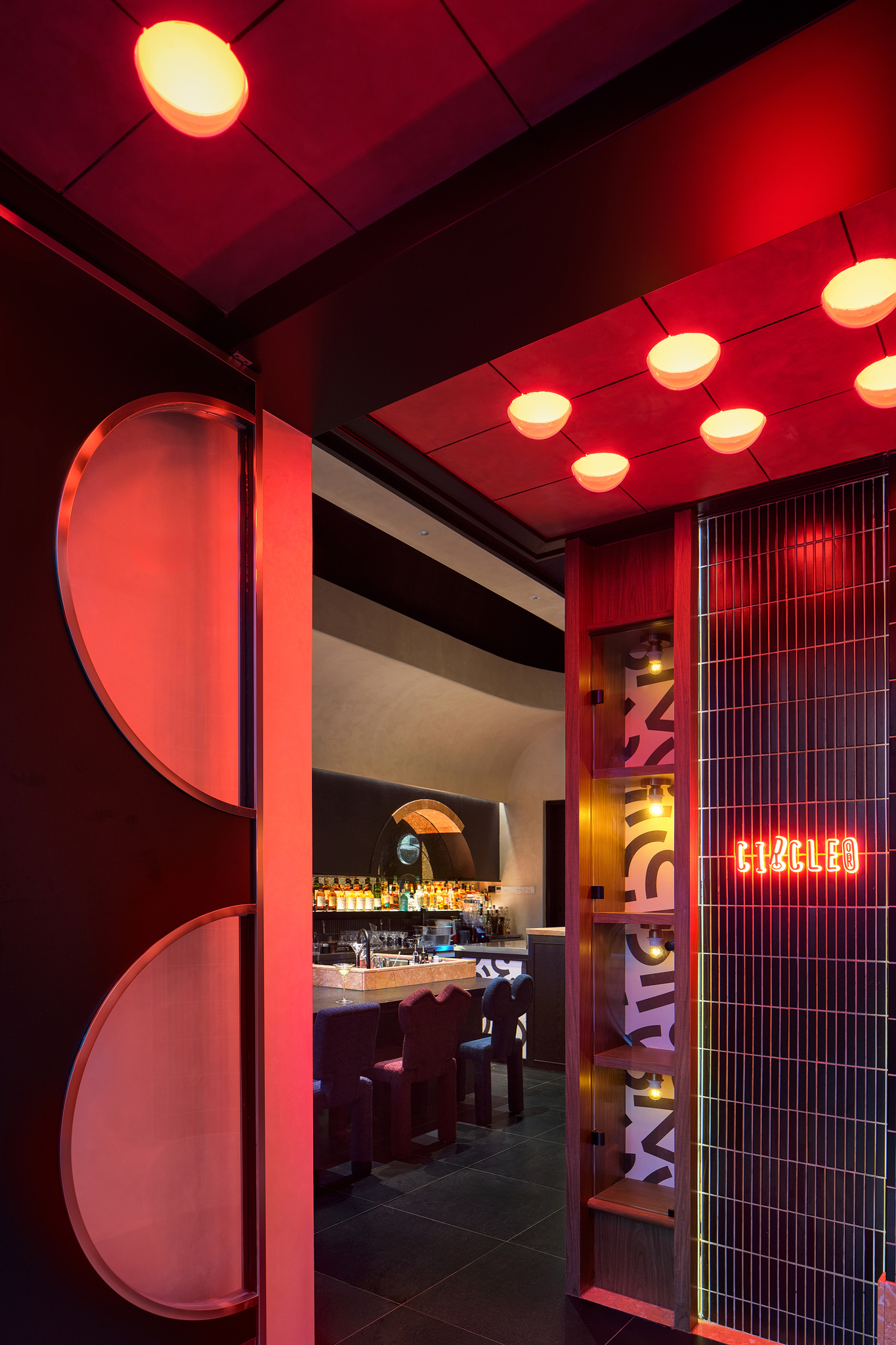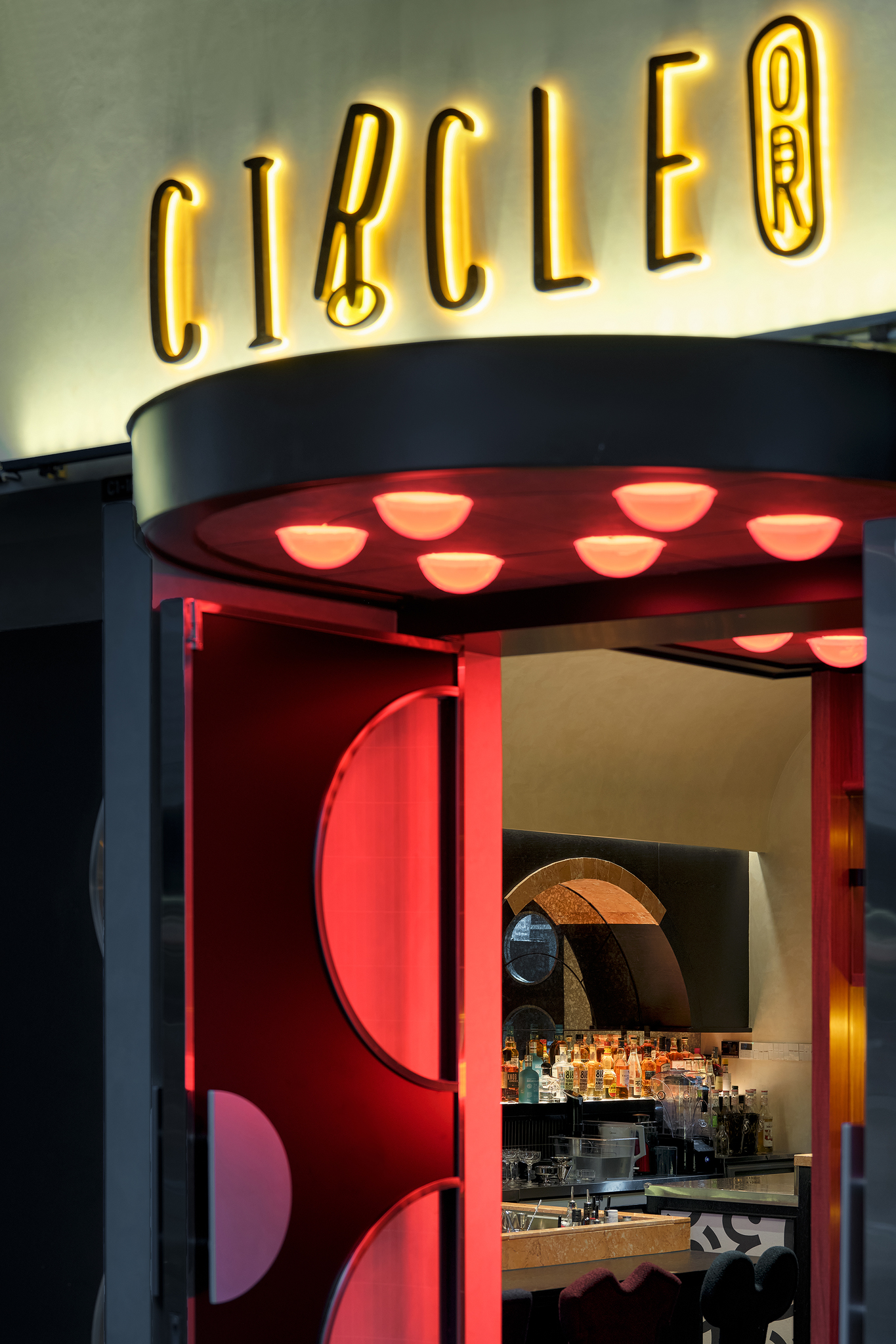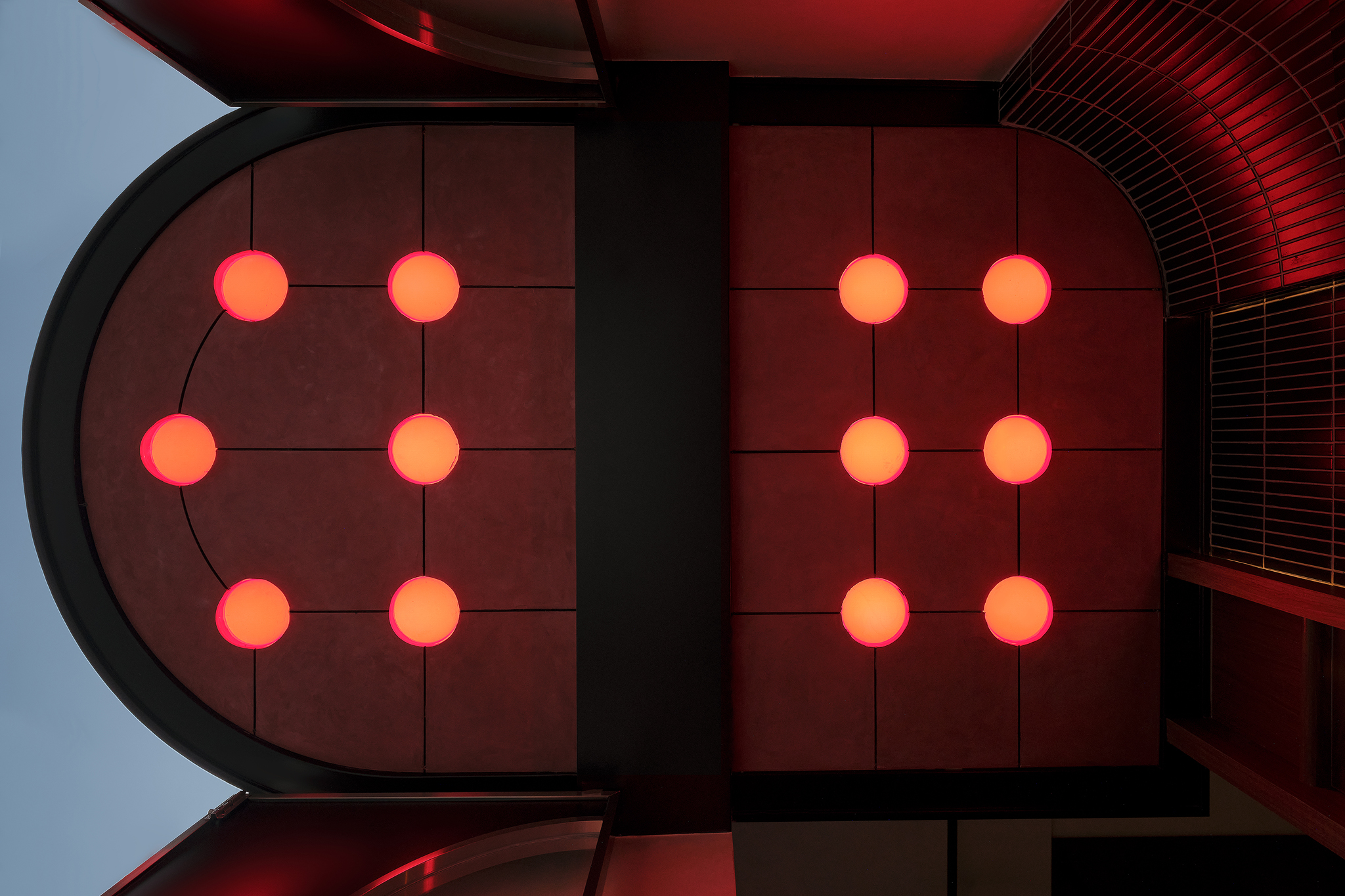 招牌处独特字体搭配暖光灯光,醒目又具有复古未来格调。墙面圆形开窗与入口处圆形元素呼应,黑与红的色彩碰撞,在夜晚营造出神秘热烈氛围。 -