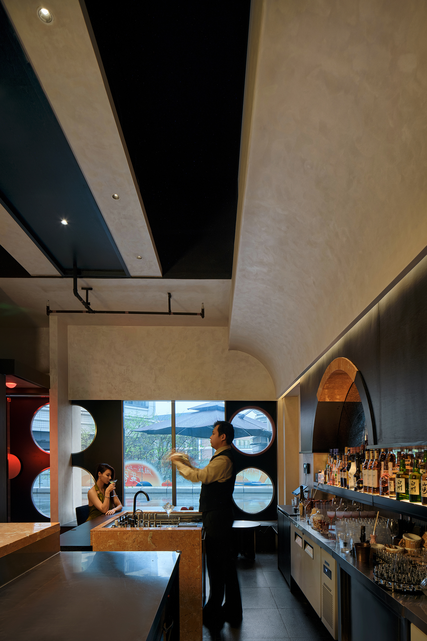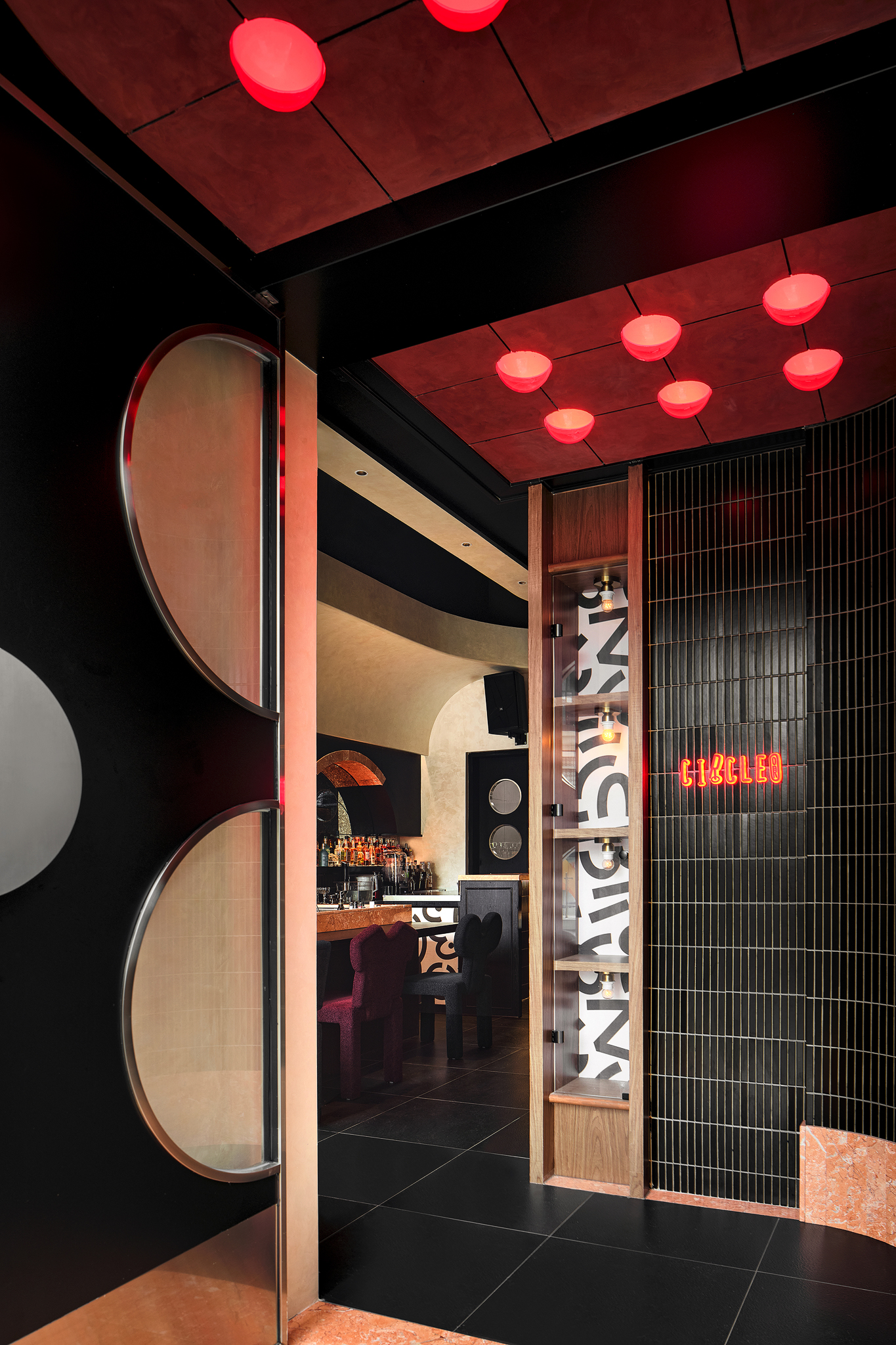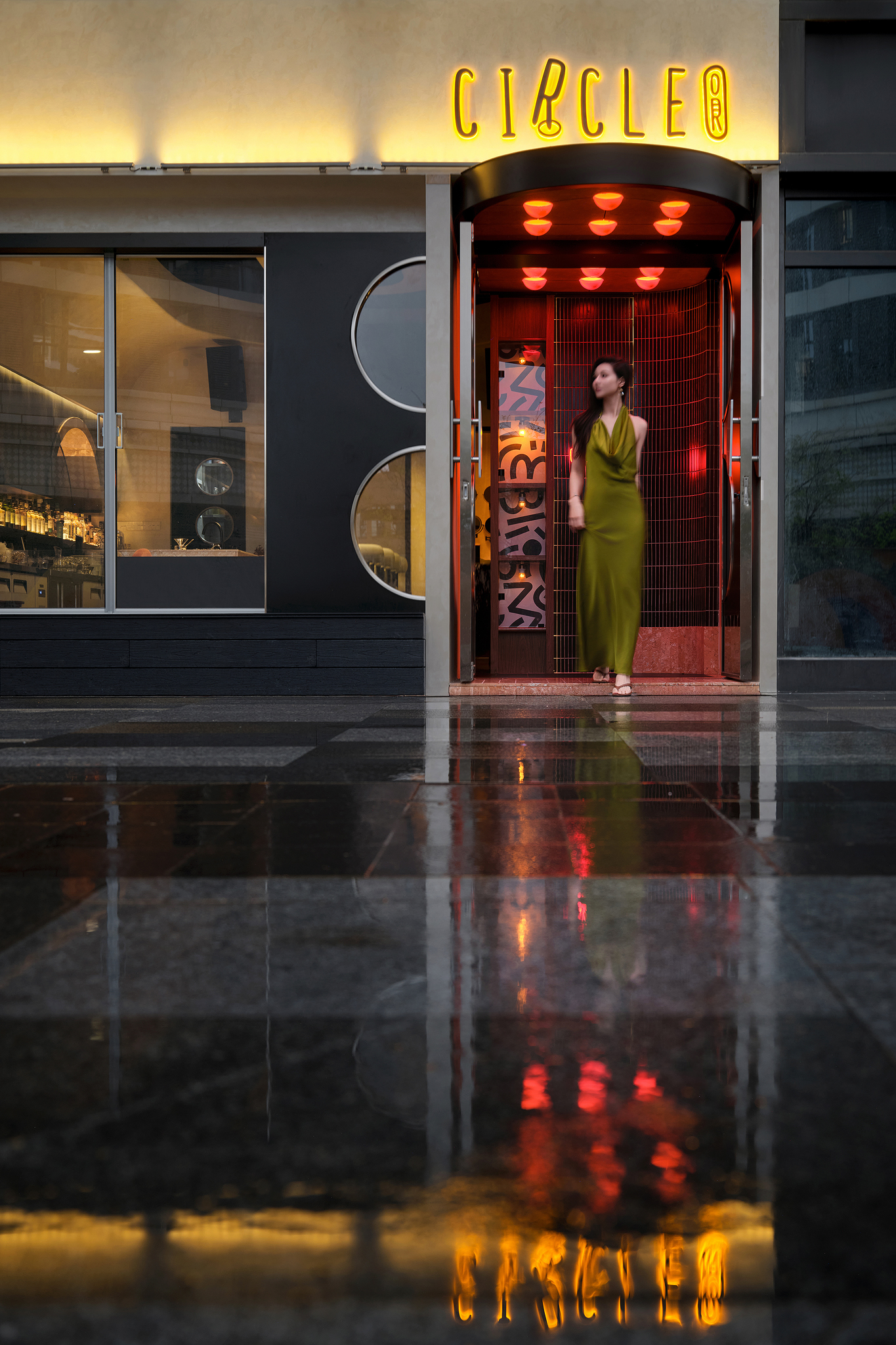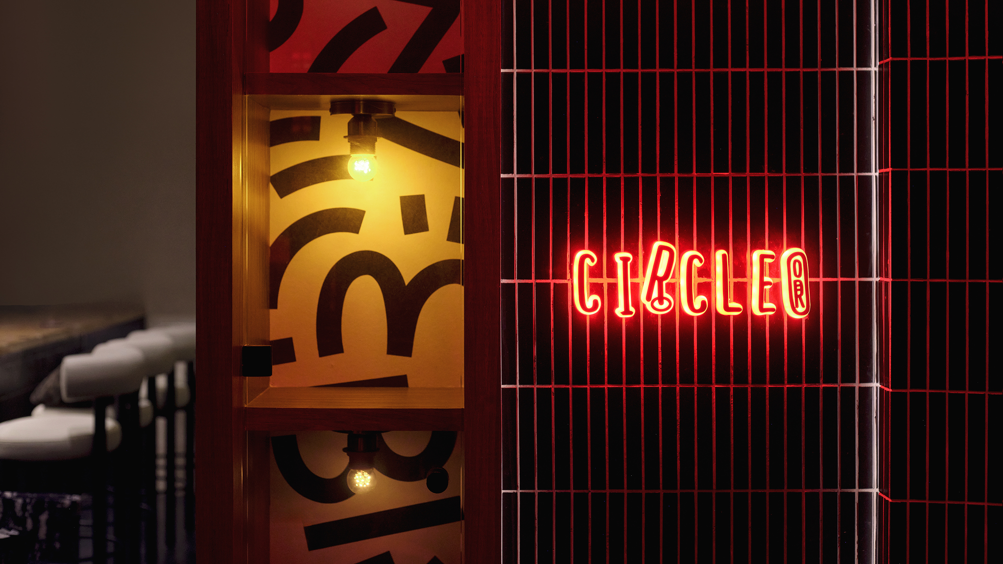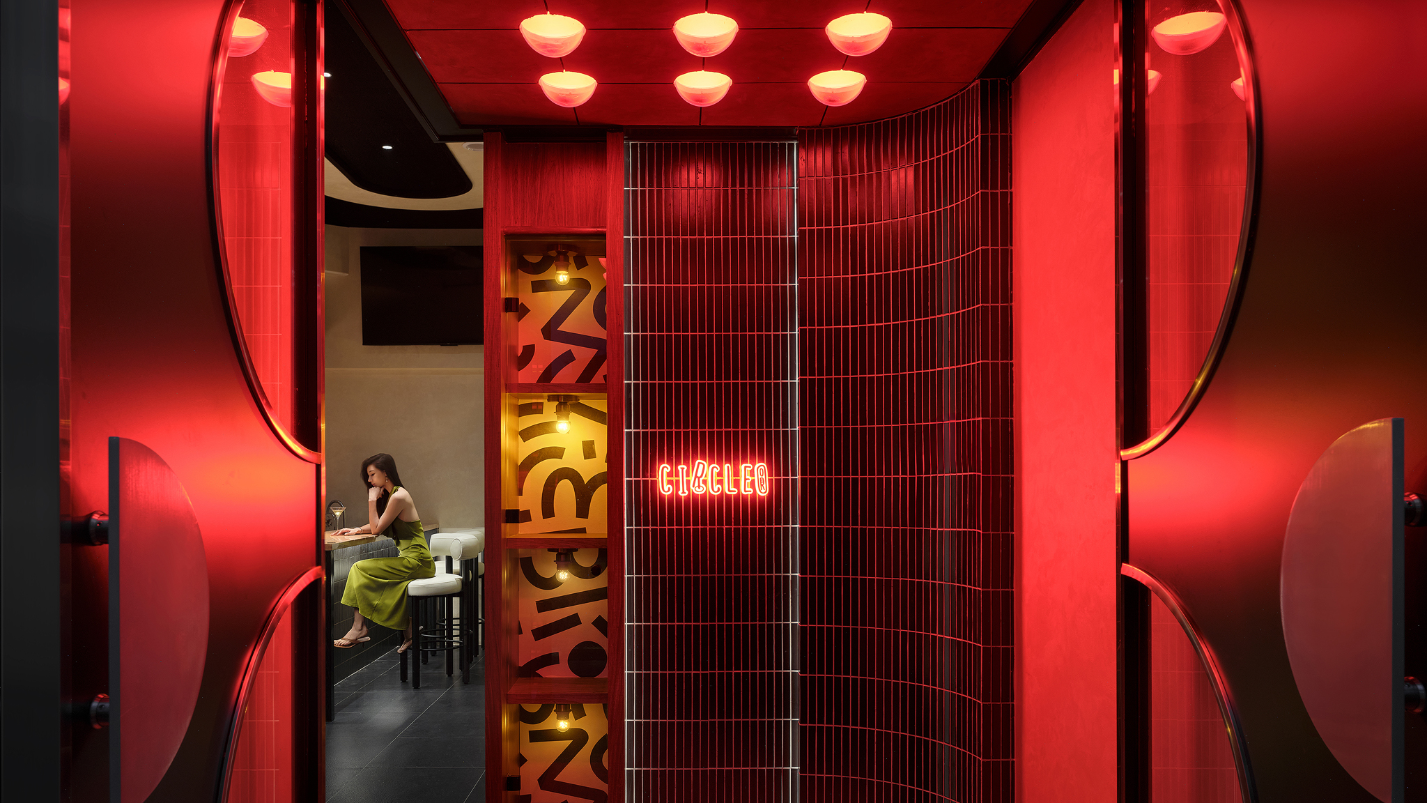 招牌处独特字体搭配暖光灯光,醒目又具有复古未来格调。墙面圆形开窗与入口处圆形元素呼应,黑与红的色彩碰撞,在夜晚营造出神秘热烈氛围。 -