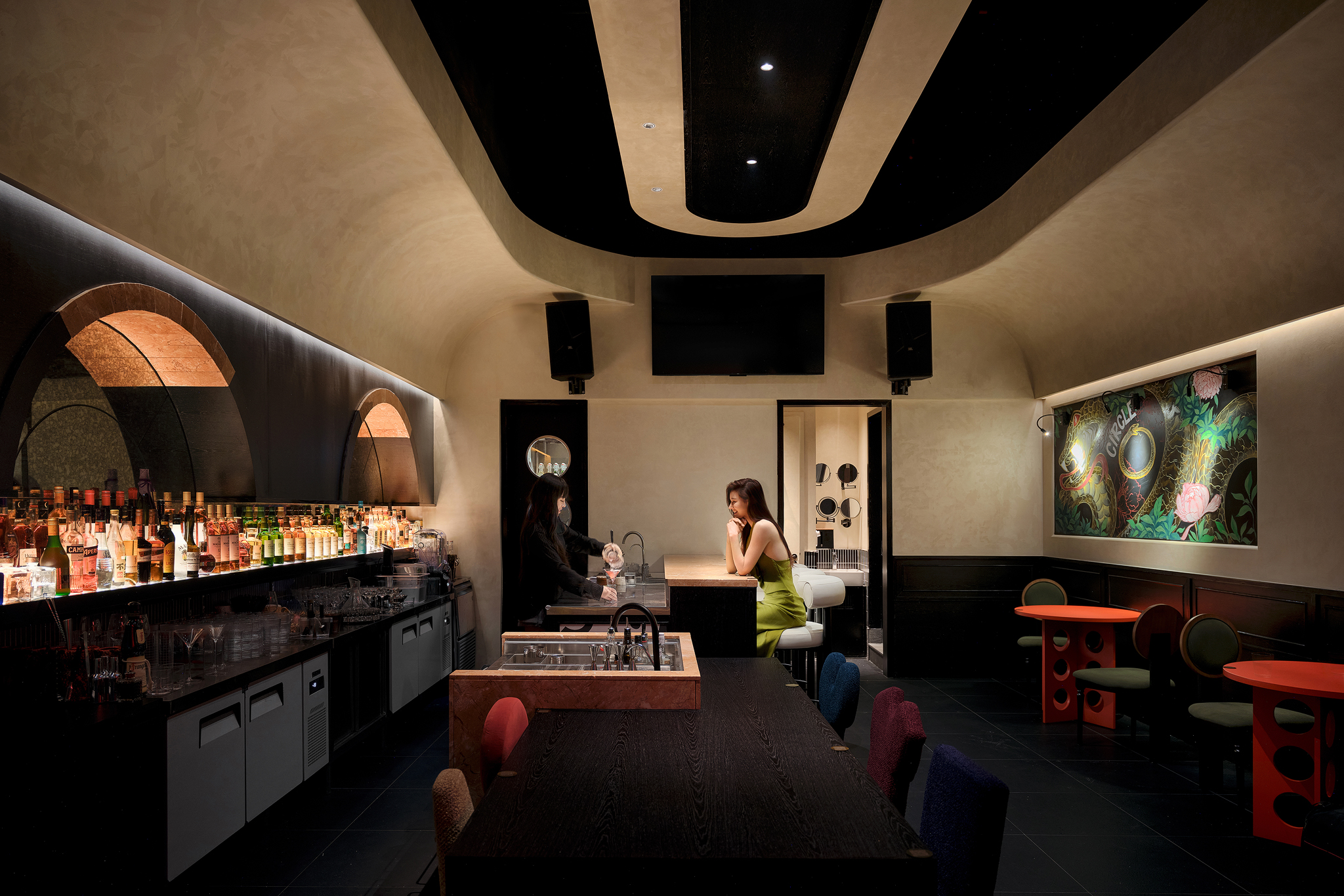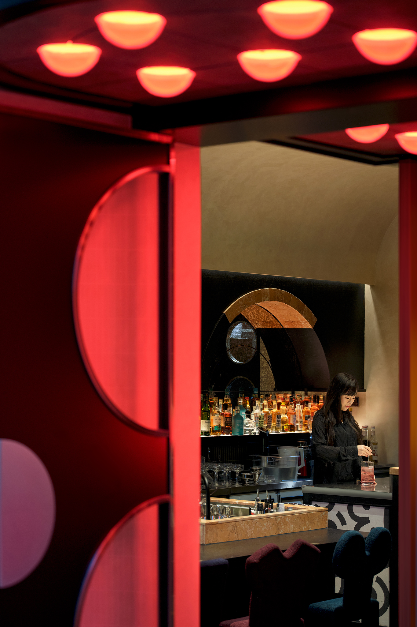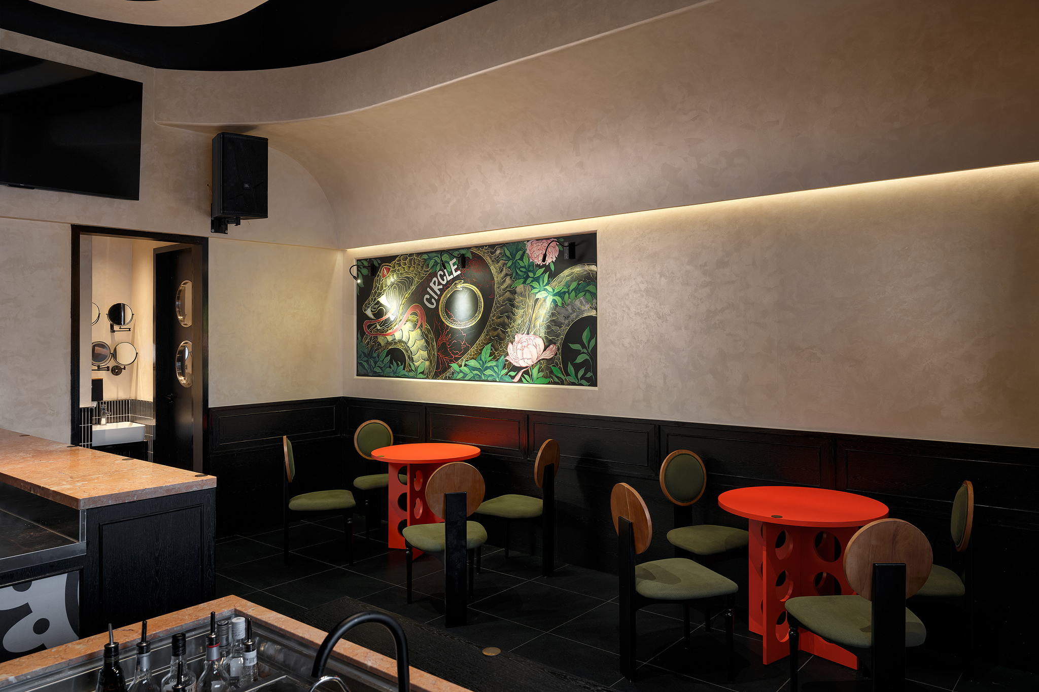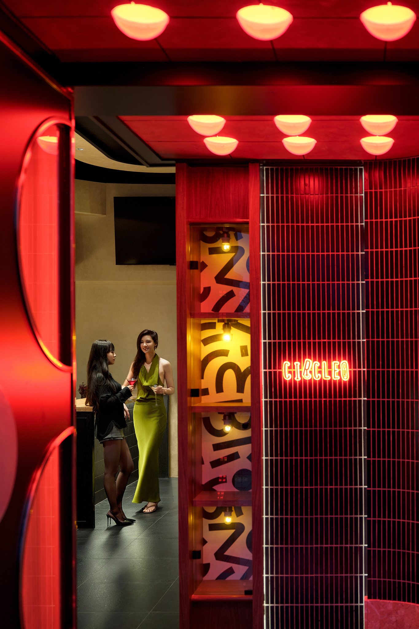 招牌处独特字体搭配暖光灯光,醒目又具有复古未来格调。墙面圆形开窗与入口处圆形元素呼应,黑与红的色彩碰撞,在夜晚营造出神秘热烈氛围。 -