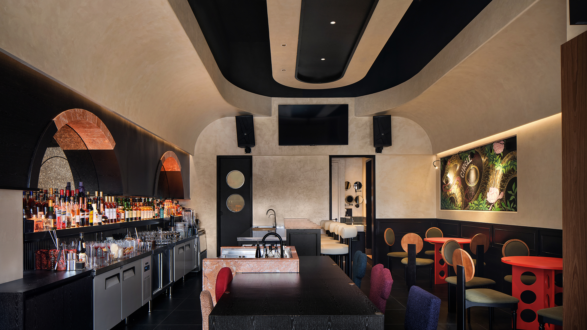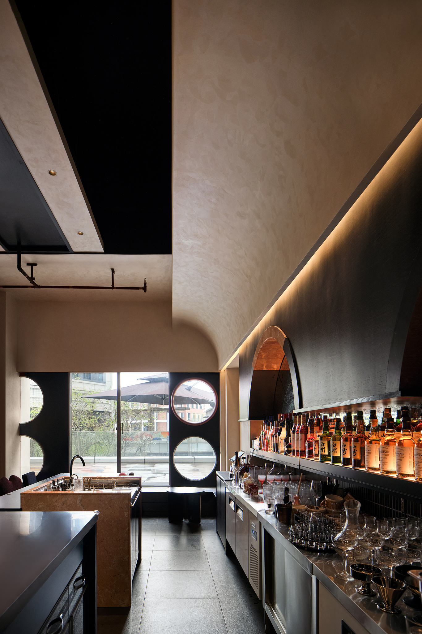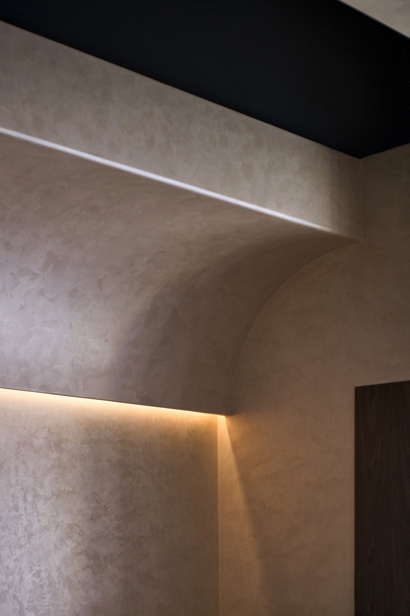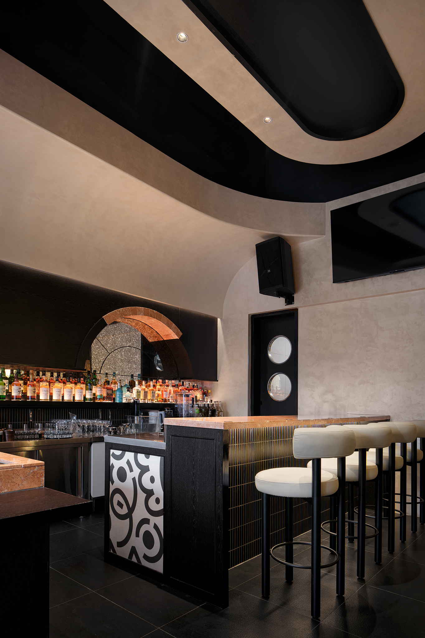 招牌处独特字体搭配暖光灯光,醒目又具有复古未来格调。墙面圆形开窗与入口处圆形元素呼应,黑与红的色彩碰撞,在夜晚营造出神秘热烈氛围。 -