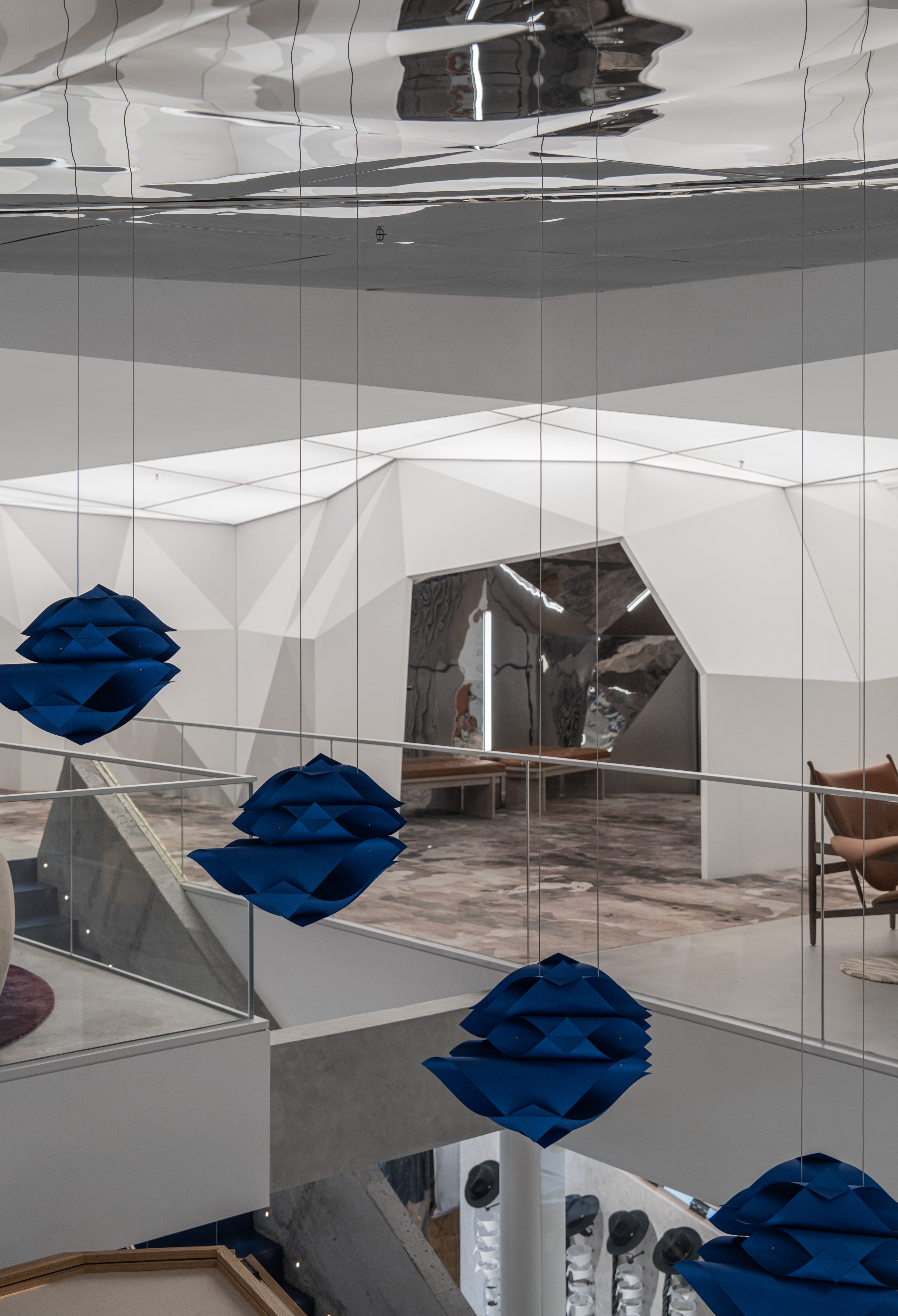 ▲二楼空间 Second Floor ————在二楼的挑空处,我们邀请了一位年轻的艺术家在这里做一件艺术装置。这件作品叫做:深蓝涌动。作品分为八个单元悬挂于中庭空间,采用极简抽象而非写实的造型语言,以程序控制作品规律联动来呼应充满运动感的生命形式,给观众带来更开放的想象空间,不同的观看视角呈现出或圆润饱满,或轻巧空灵的多变形态和多维度空间感受。作品内部透出莹莹的微光按呼吸的节奏明灭变化,当有观众走到作品下方区域时,灯光变为快速闪动,似是对观众到来的雀跃回应。作品外表材质采用富有丝绸般温润光泽的综合材料,致敬精湛制衣剪裁工艺,用简单利落的组合方式形成自然而然的丰富细节和质感。作品通体深蓝,携带者来自海洋的气息从山海之间飞临此地,前行涌动,生生不息。 In the void area of the second floor, we invited a young artist to create an art installation. This piece is titled: Deep Blue Surge. The work consists of eight units suspended in the atrium space, employing minimalist abstract rather than realistic formal language. Program-controlled regular movements of the pieces echo dynamic life forms, offering viewers a more open imagination. Different viewing angles present ever-changing forms and multidimensional spatial experiences, ranging from rounded and full to light and ethereal. The piece emits a faint glow that pulses like breathing—when a viewer steps beneath it, the light flickers rapidly, as if joyfully responding to their presence. The exterior material has a silky, warm luster, paying homage to exquisite garment tailoring craftsmanship. Simple and clean combinations create natural, rich details and textures. The entire piece is deep blue, carrying the essence of the ocean, as if flying from the mountains and seas to this place, surging forward with endless vitality.