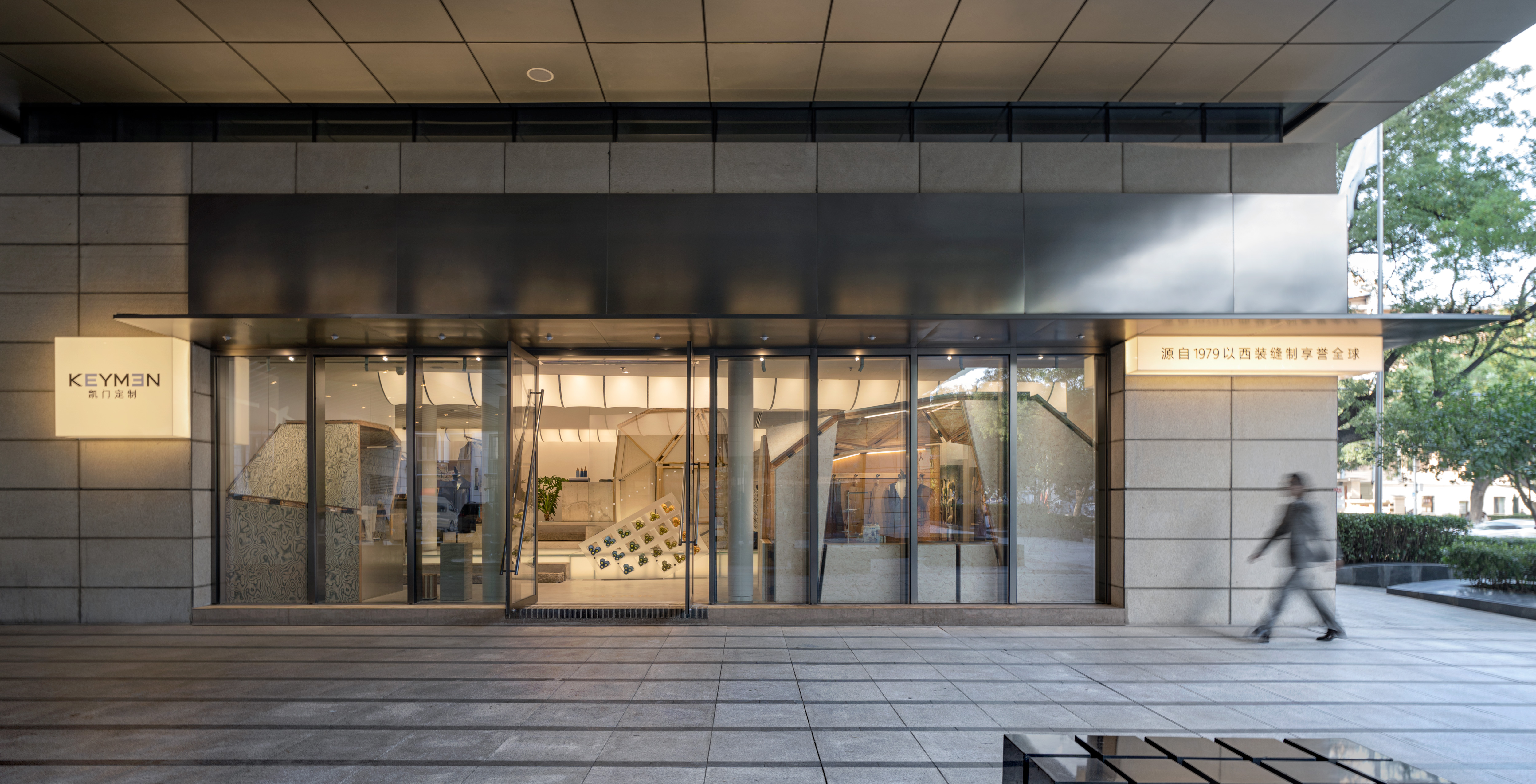 ▲外立面 Facade ————同时在橱窗的设计上,我们也希望有突破传统的空间叙事逻辑。首先我们在橱窗中展示的不是一组静物,而是“工作室”,我们把定制店的修改间展示出来,工匠师傅在“后场”默默无闻、日复一日的日常看似普通,但这才是一个定制品牌的灵魂体现。我们以一个半开放的“小木屋”为载体,折线的造型就像一个创作中的“纸团”,工匠沉浸在这个“纸团”中忘我工作,就像记忆的片段、似真似幻的舞台,展示着坚持却又平凡的工匠精神。 In designing the display window, we also sought to break away from traditional spatial narrative logic. First, what we display in the window is not a set of still objects but a “workshop.” We showcased the alteration room of the tailoring store. The craftsman’s daily routine, though seemingly ordinary and repetitive, embodies the soul of a custom tailoring brand. We used a semi-open “small wooden house” as a vehicle, with its folded form resembling a “crumpled paper” in the midst of creation. The craftsman, immersed in this “paper ball,” works self-forgetfully, like a fragment of memory or a dreamlike stage, showcasing a persistent yet humble spirit of craftsmanship.