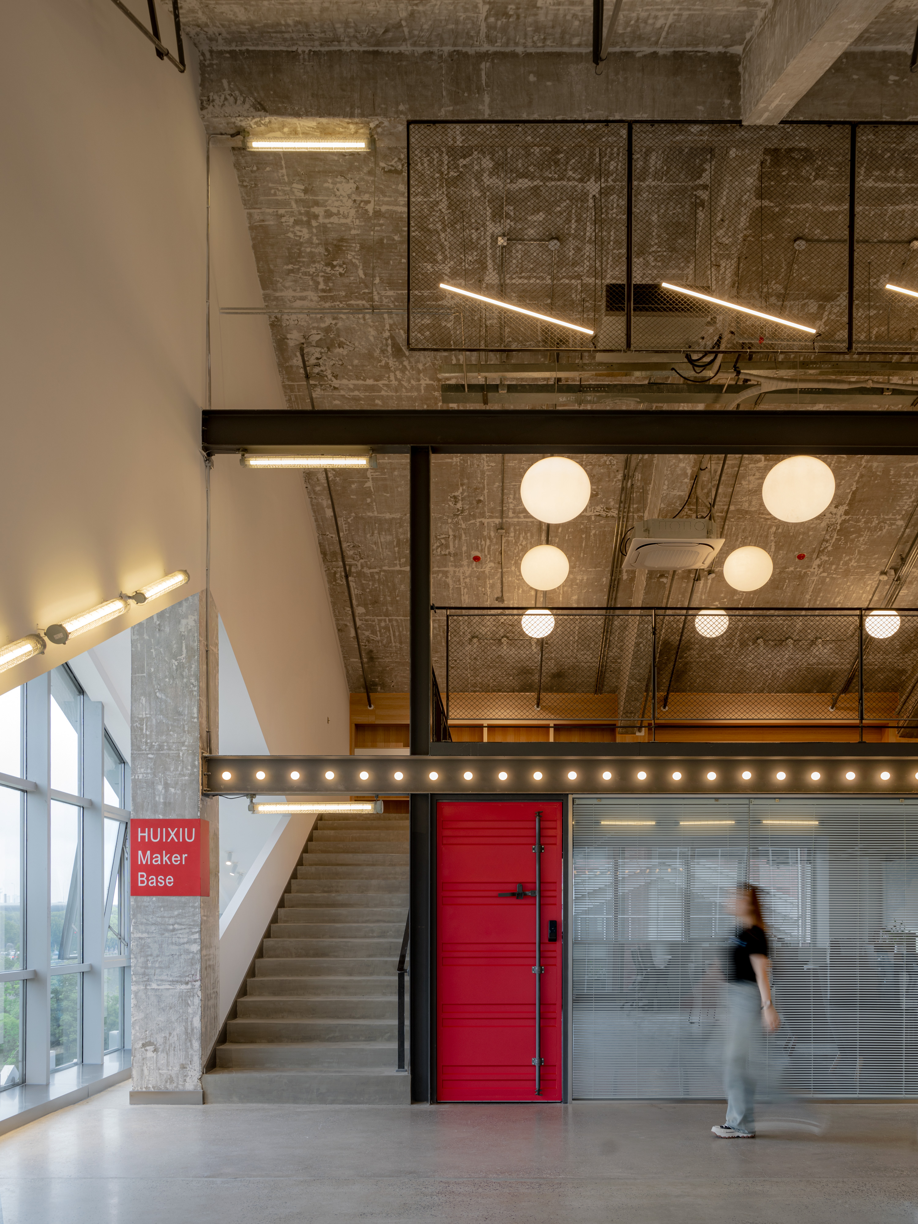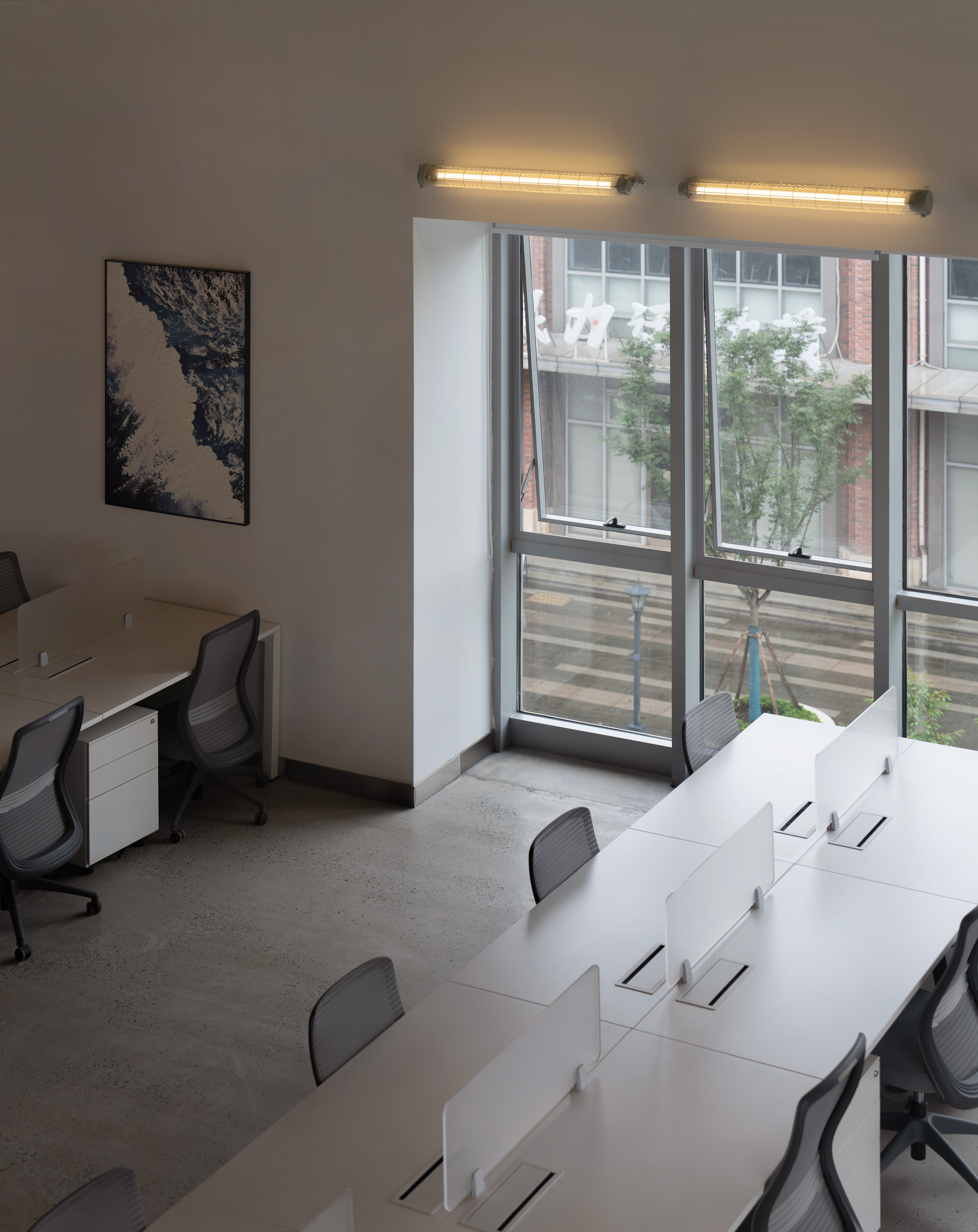 ▲路演空间 Roadshow Area ————我们把开放办公区设置在建筑坡顶内的挑空区域,这里的空间更高挑,光线也更好。比较素净的办公区与活力元素满满的共享区形成一定的对比,为处于该空间内的人们以心理上的功能区分支持,这样更有利于专注的工作。 We placed the open office area in a lift area inside the slope of the building, where the space is higher and the light is better. The comparison between the plain office area and the fancy shared area forms a certain contrast, which supports the psychological function of the people in the space, which is more conducive to focused work.
