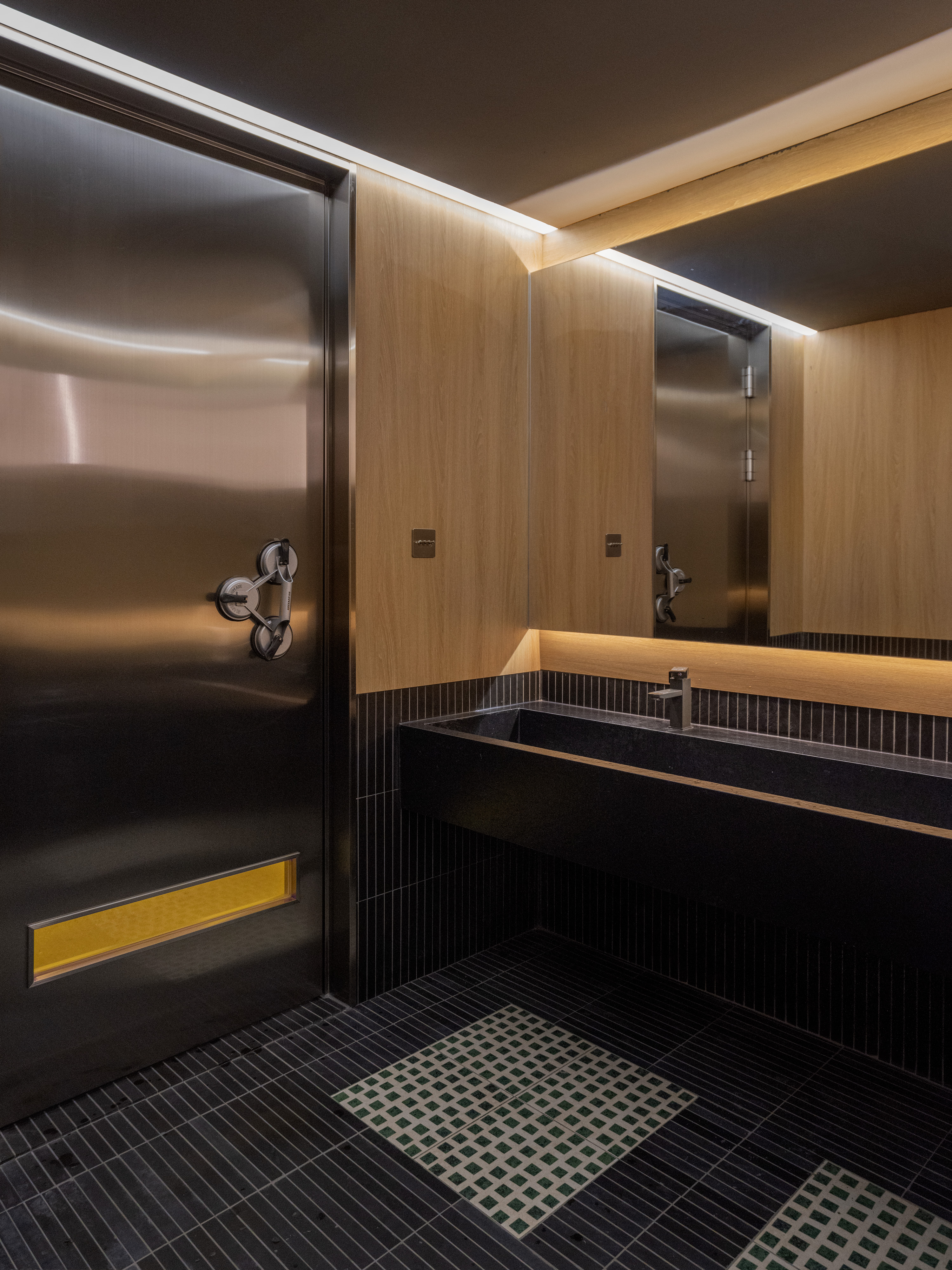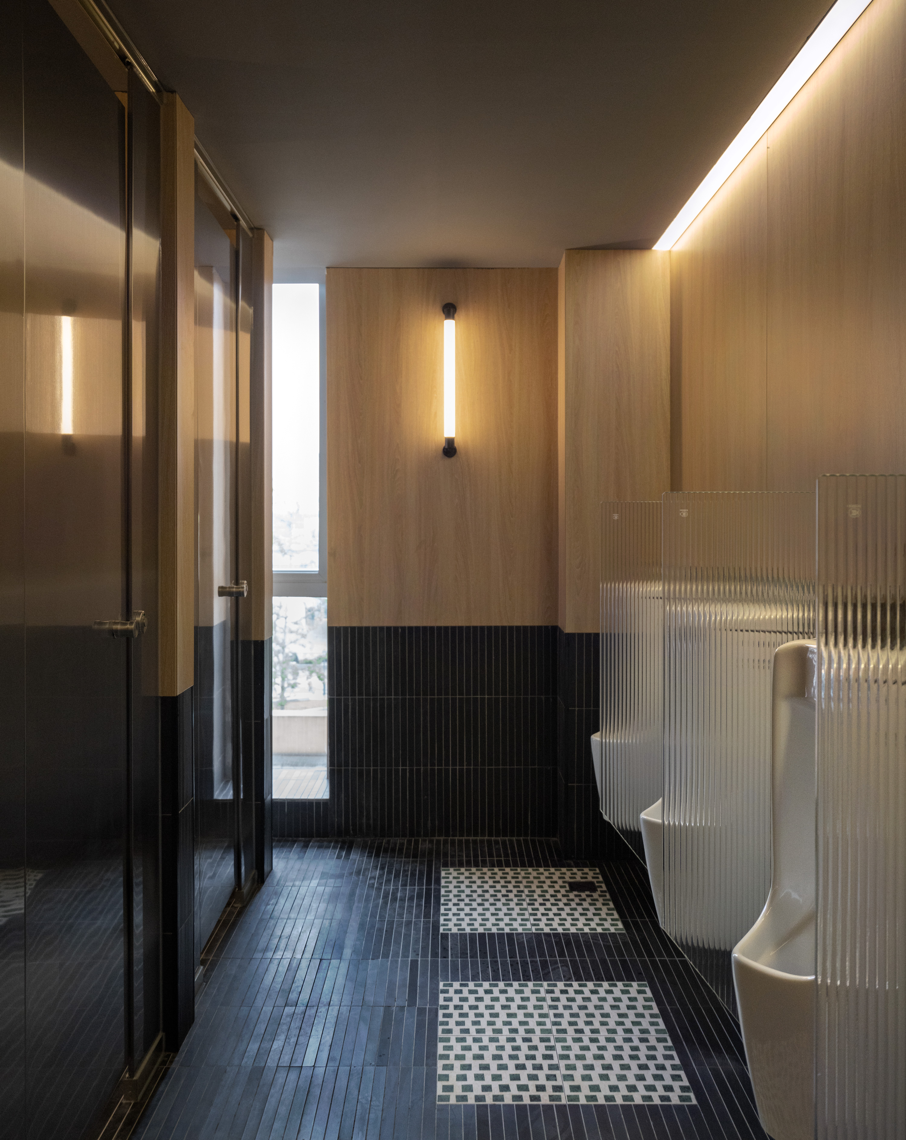 ▲开放办公区 Open Office Area ————卫生间是一个空间品质的重点体现部分,在这个共享办公项目中,我们利用不同颜色质感的瓷砖拼贴与灯光装饰元素打造了更加静谧但却有趣的环境,是工作人员能在紧张的工作中拥有片刻的喘息。 The toilet is a key part of the quality of the space. In this shared co-working project, we use different color texture tile collage and lighting decorative elements to create a more quiet but interesting environment, so that people can have a moment of respite in the tense work.