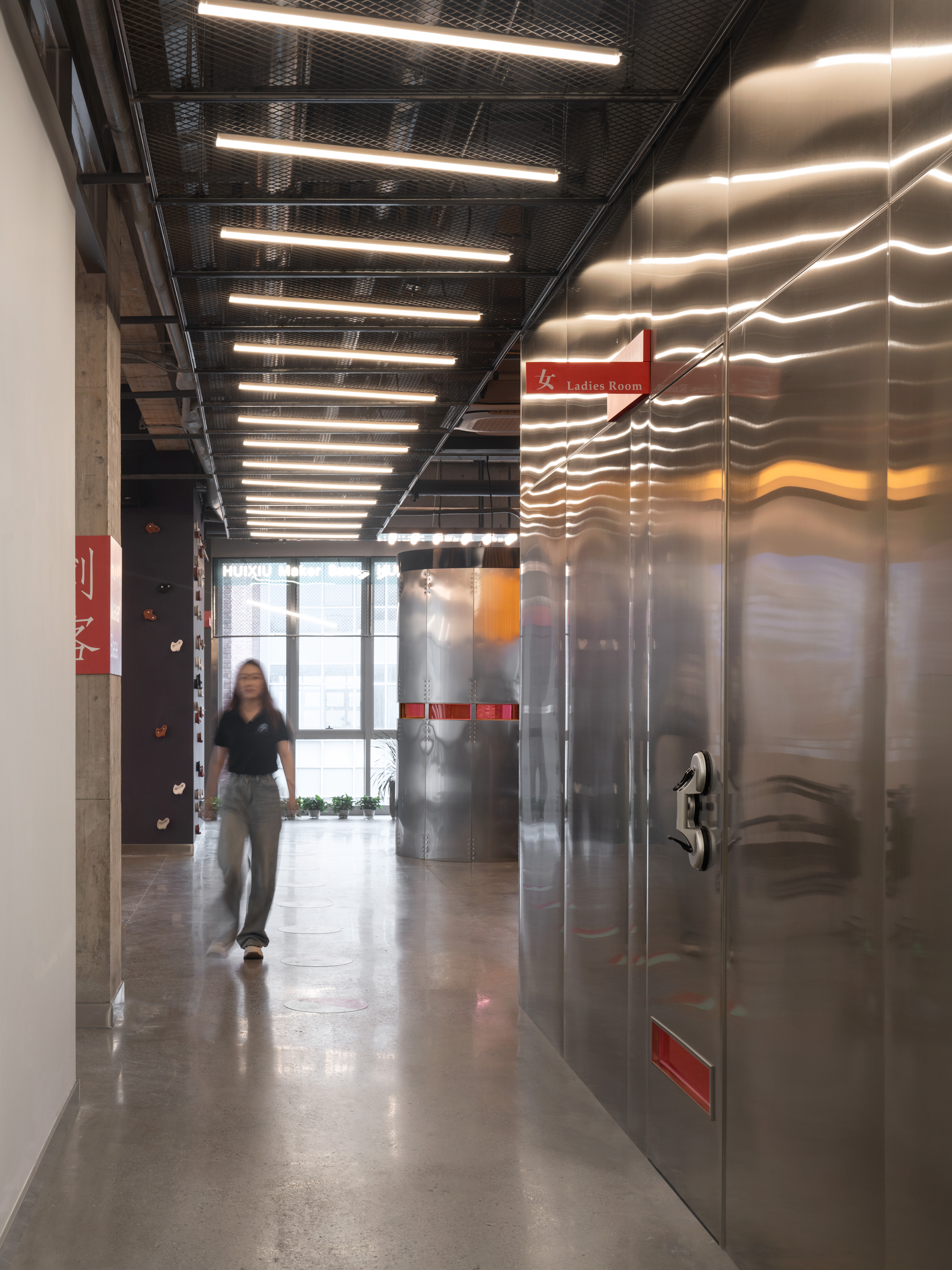 空间布局:在一层的入口区,我们希望这里就能给人一种混搭感,我们给不同的立面赋予不同的材质,天花、地面、前台等都是不同风格。拉丝不锈钢的墙面会把灯光反射出横向的“火纹”,这也让办公空间有了一些温馨感。In the entrance area of the first floor, the rational gray tone is the main theme of this area, under this tone, we give different facades with different textures, unity and rich level of detail. The brushed stainless steel wall will reflect the high color temperature light into the horizontal “fire pattern”, which also gives the cool office space a warm feeling.