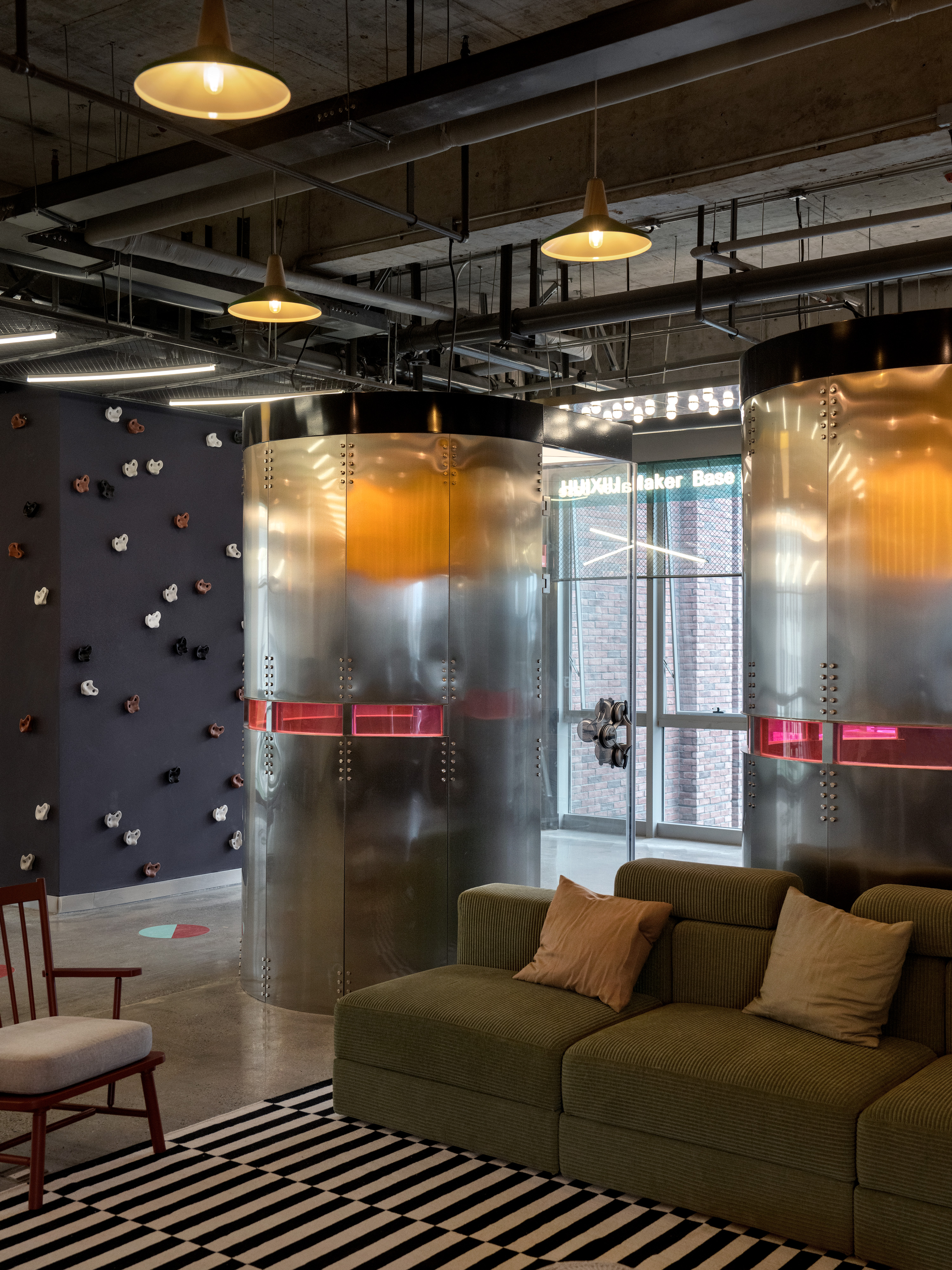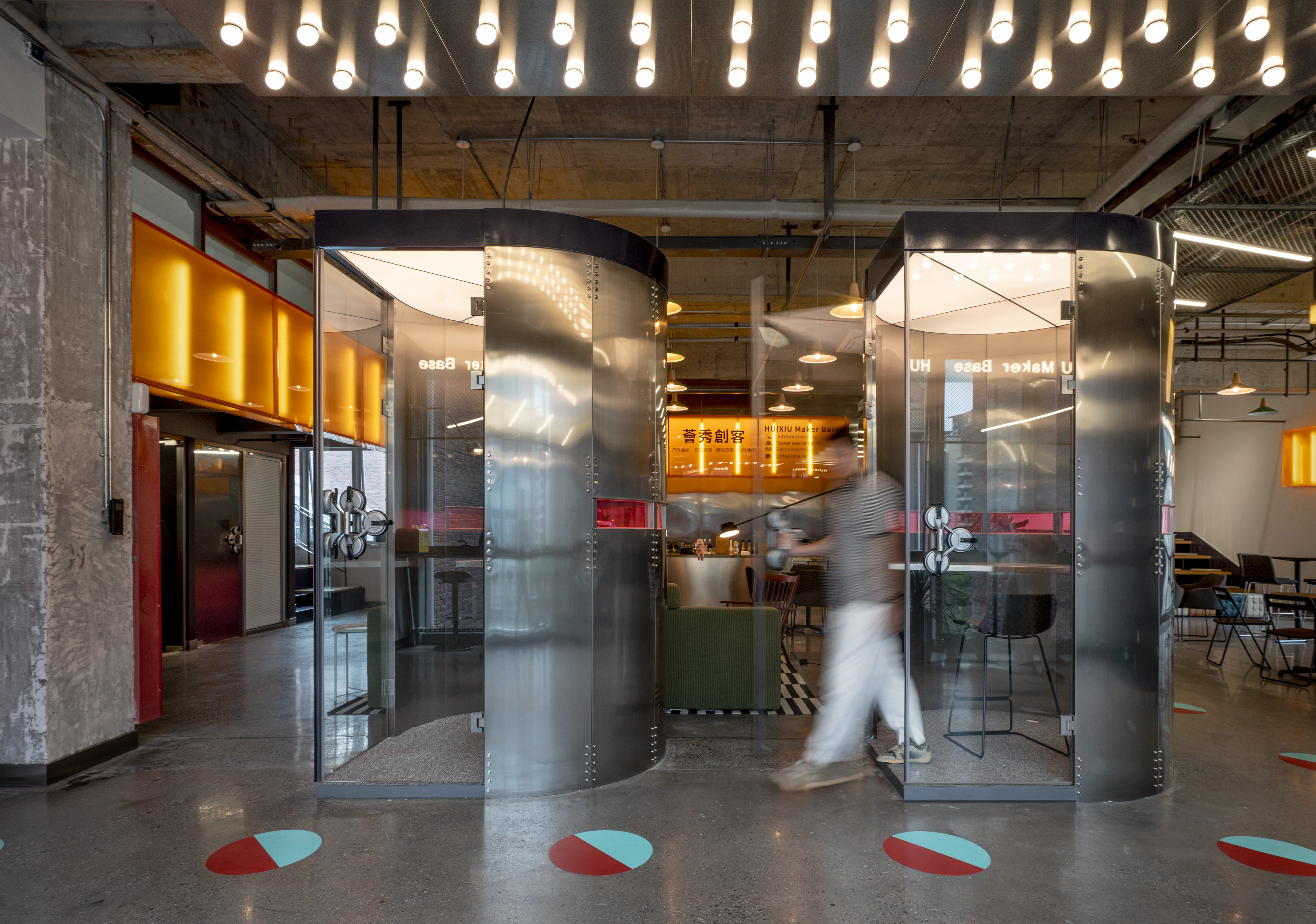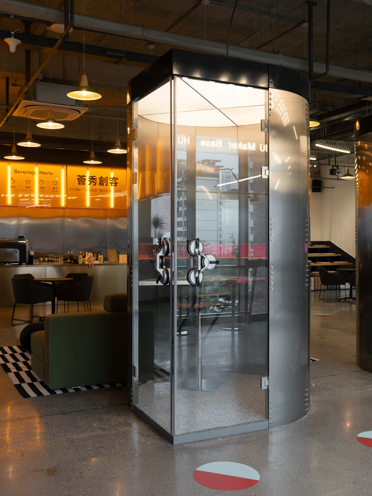 ▲空间细节 Details ————上到三楼的办公区,一出电梯是开放的共享空间,我们希望这里依然是混搭的效果。在入口处,我们设立了两个有趣的“电话亭”,让公共空间中有一些安静的沟通环境满足不同的办公需求。 Up to the office area on the third floor, the elevator lobby is an open shared space, we hope that this is still a mix and match effect. At the entrance, we set up two interesting “telephone booths” to allow some quiet communication environment in the public space to meet different office needs.