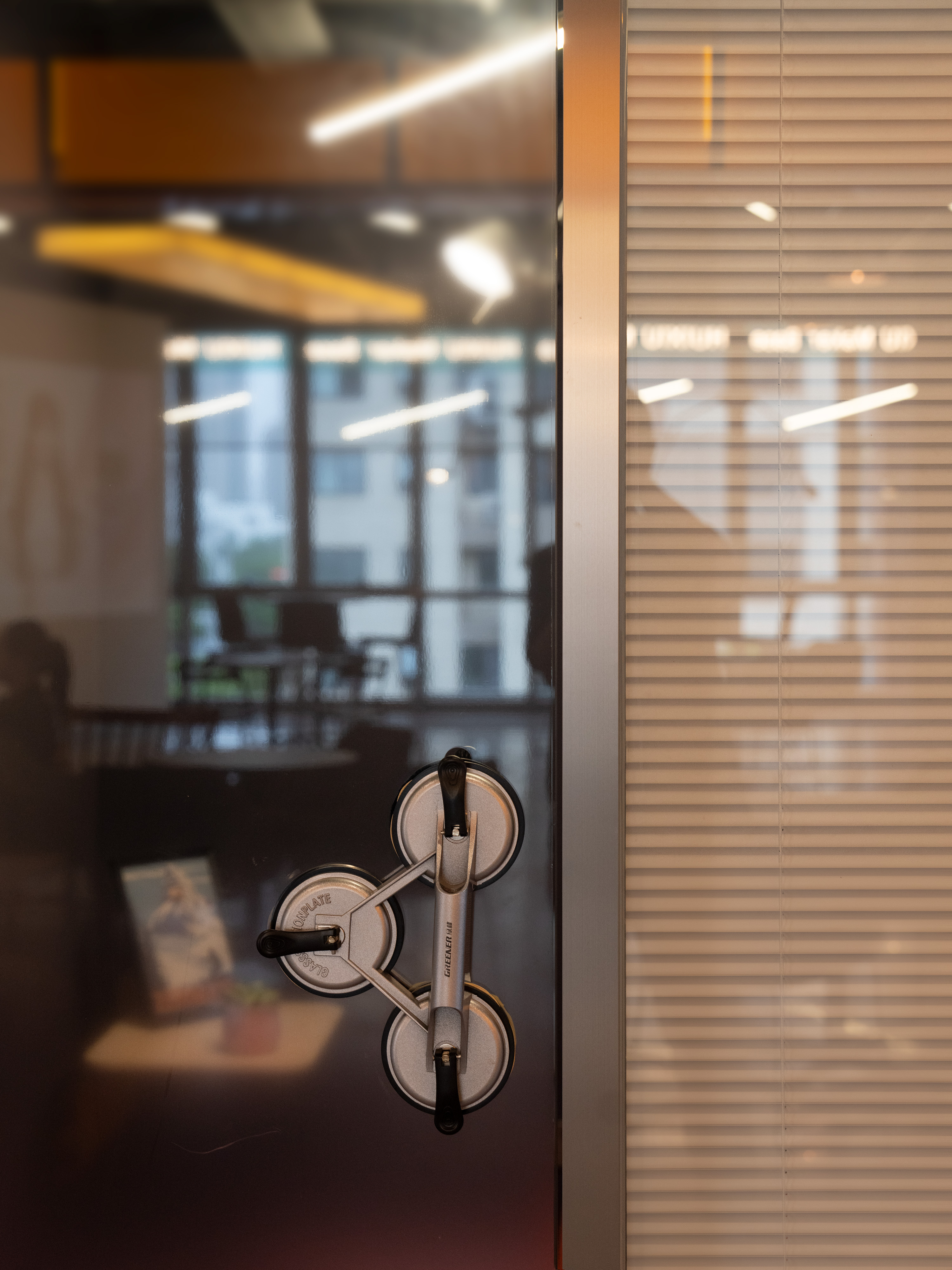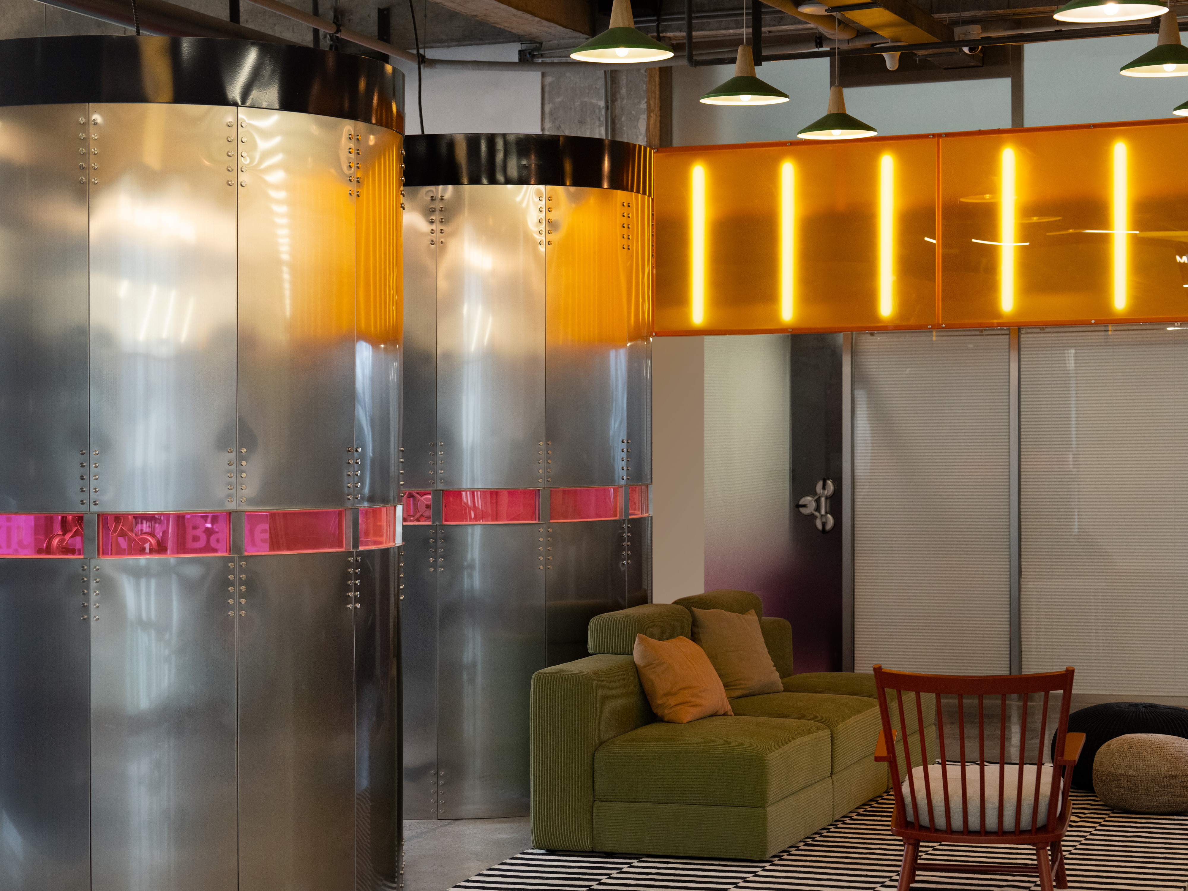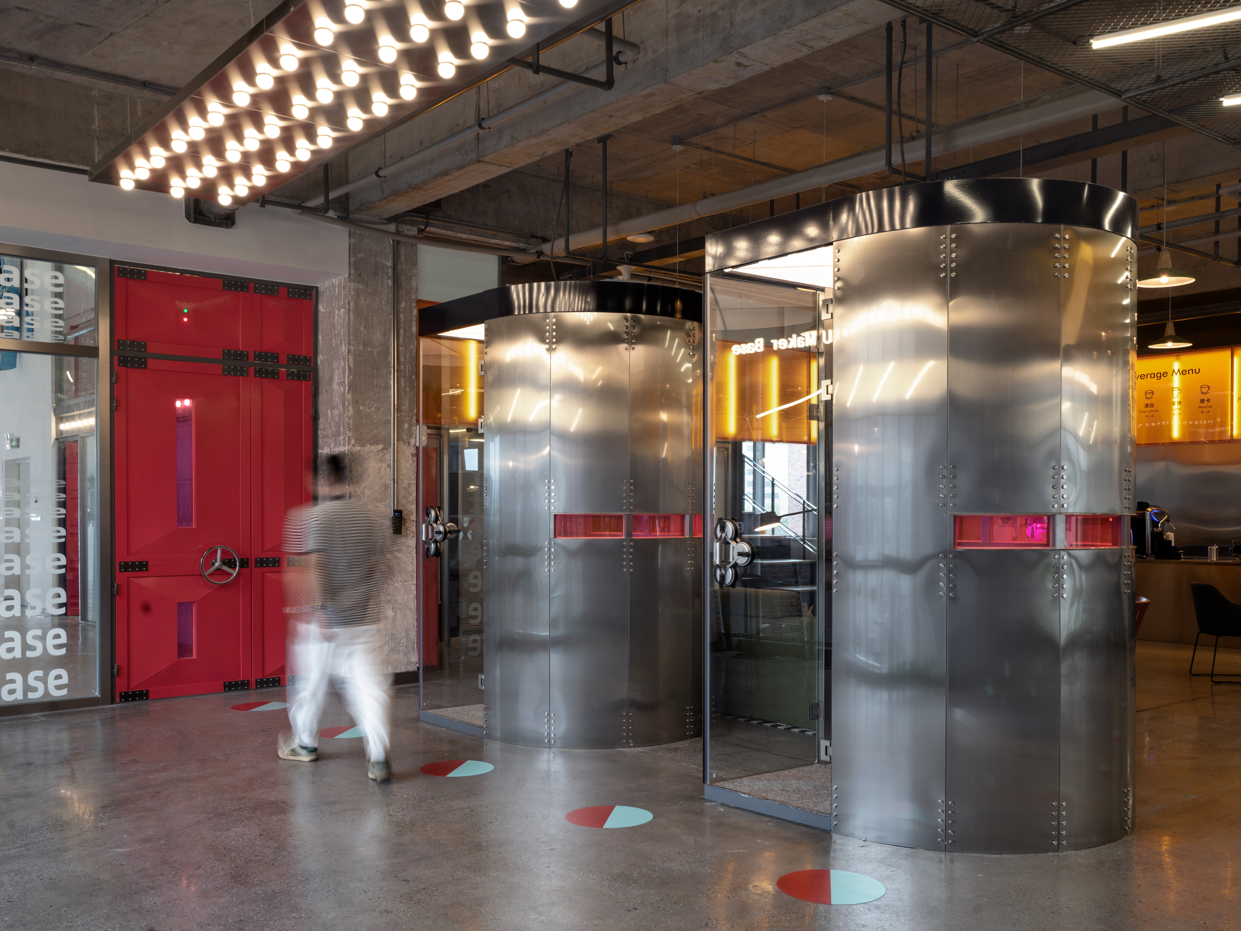 ▲空间细节 Details ————上到三楼的办公区,一出电梯是开放的共享空间,我们希望这里依然是混搭的效果。在入口处,我们设立了两个有趣的“电话亭”,让公共空间中有一些安静的沟通环境满足不同的办公需求。 Up to the office area on the third floor, the elevator lobby is an open shared space, we hope that this is still a mix and match effect. At the entrance, we set up two interesting “telephone booths” to allow some quiet communication environment in the public space to meet different office needs.