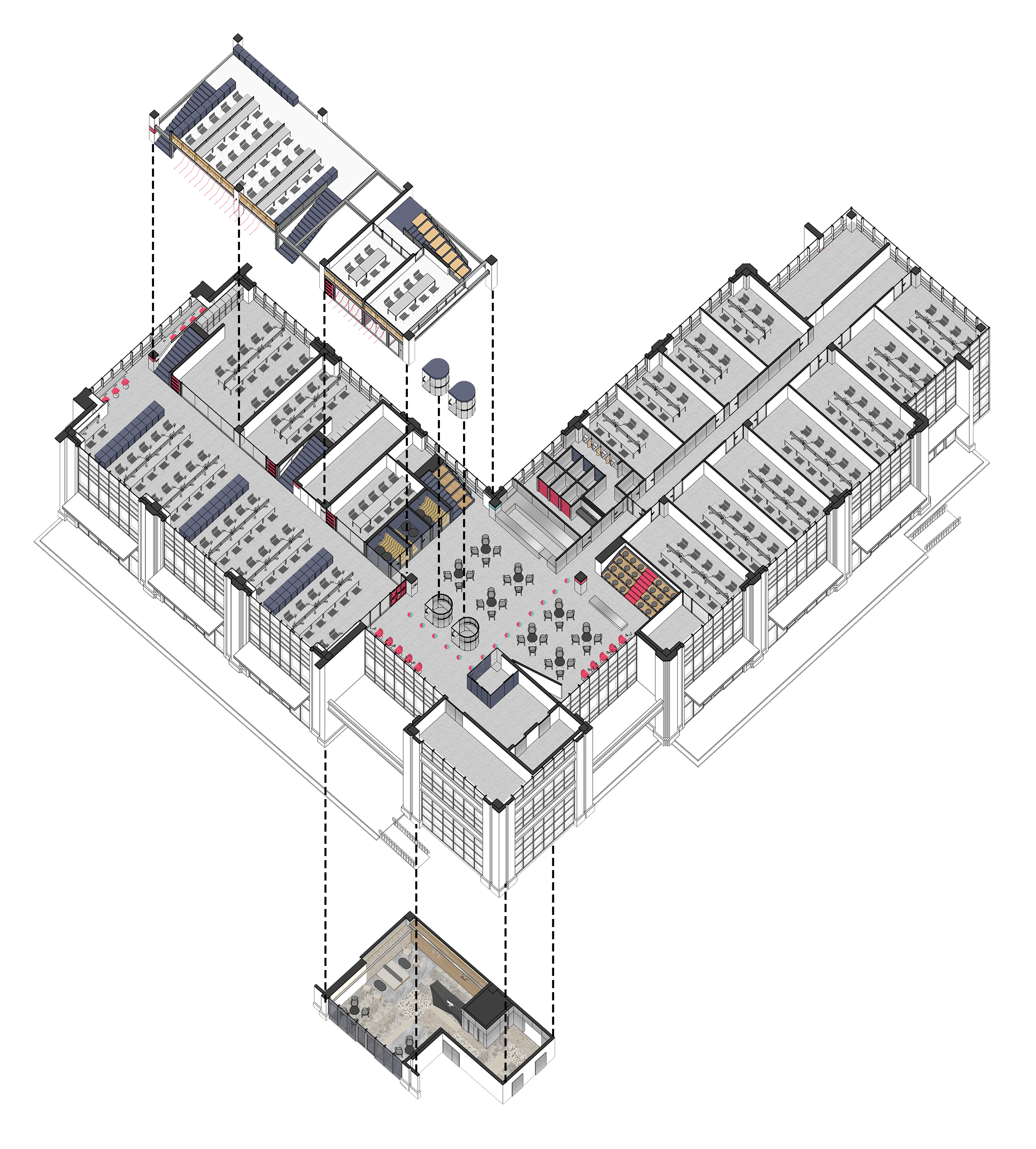 空间意境:本项目主要服务于社区中的中小型公司以及一些自由职业者,他们有自己各自的定位和特点。我们希望打造一个包容性比较强的共享空间,让各个行业的不同个性都能够兼容,形成一种混搭的美感。