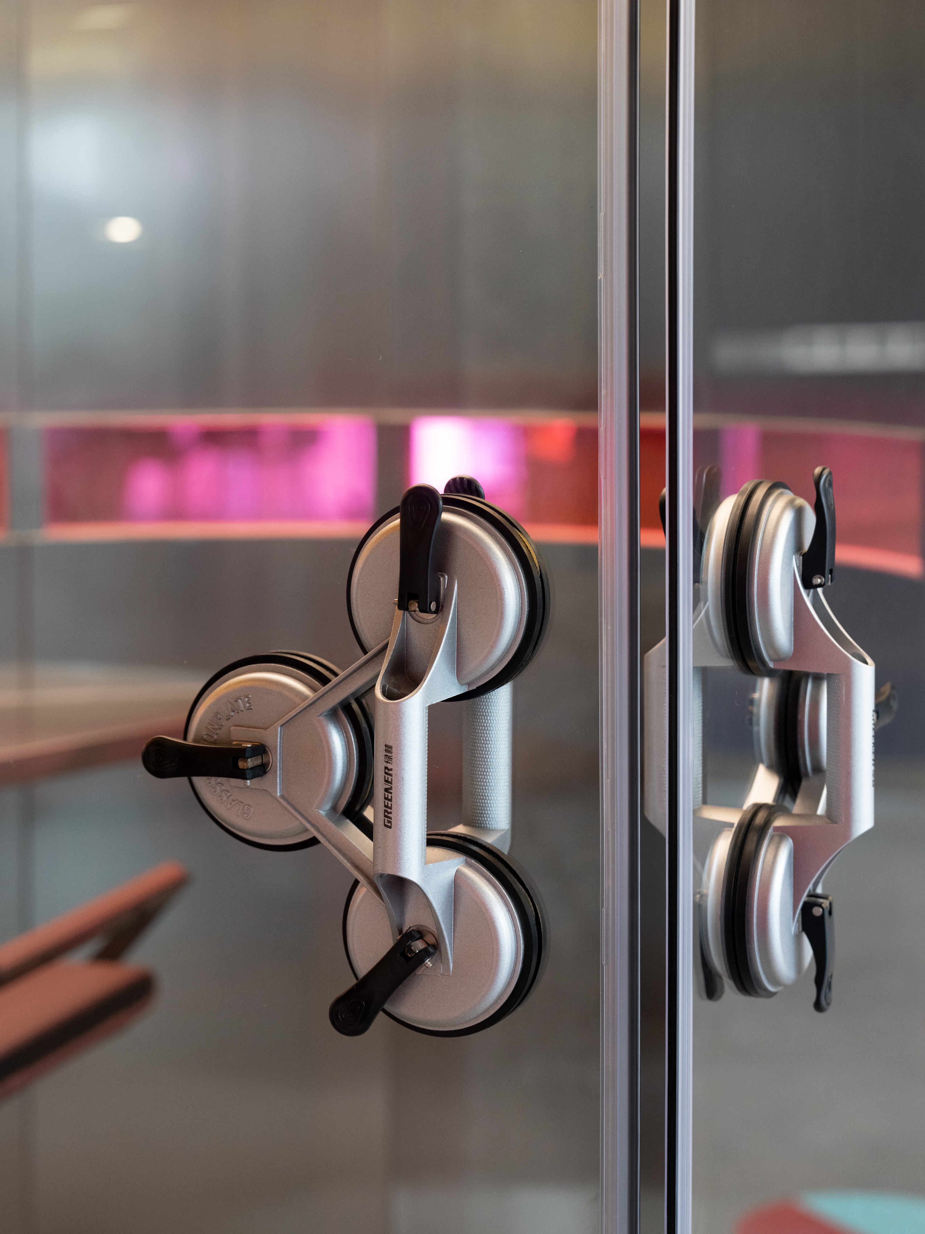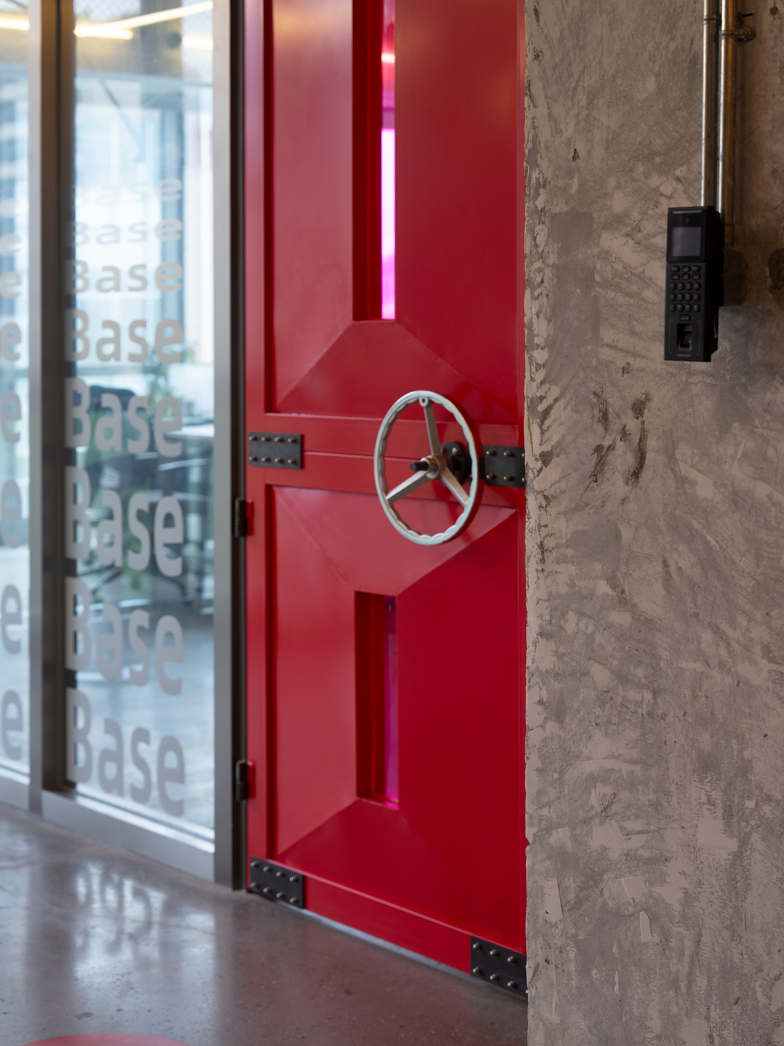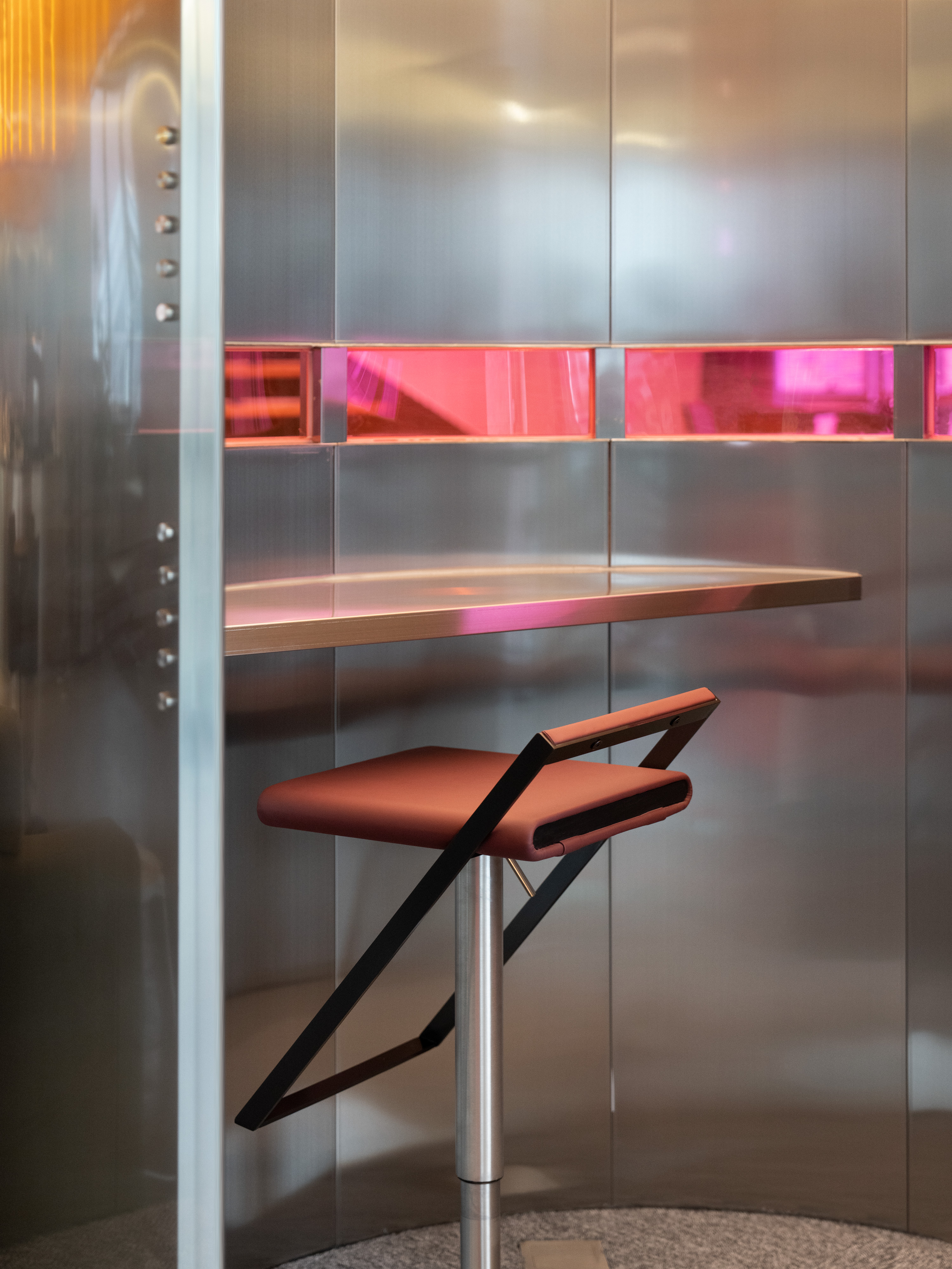 ▲电话亭 Telephone Booth ————此处的“电话亭”无疑是这一层的视觉中心,我们希望它的使用体验能更加有趣一些。比如它能转角开门,并且门把手不是常规的把手而是吸盘,再比如它后面有一处长条的粉色小窗,仿佛置身于复古未来主义的太空小艇。 The “phone booth” here is undoubtedly the visual center of this floor, and we hope that its use experience will be more interesting. For example, it can open doors at corners, and the door handle is not a regular handle but a suction cup, and it has a long pink window behind it, like being in a spaceship of retro-futurism.