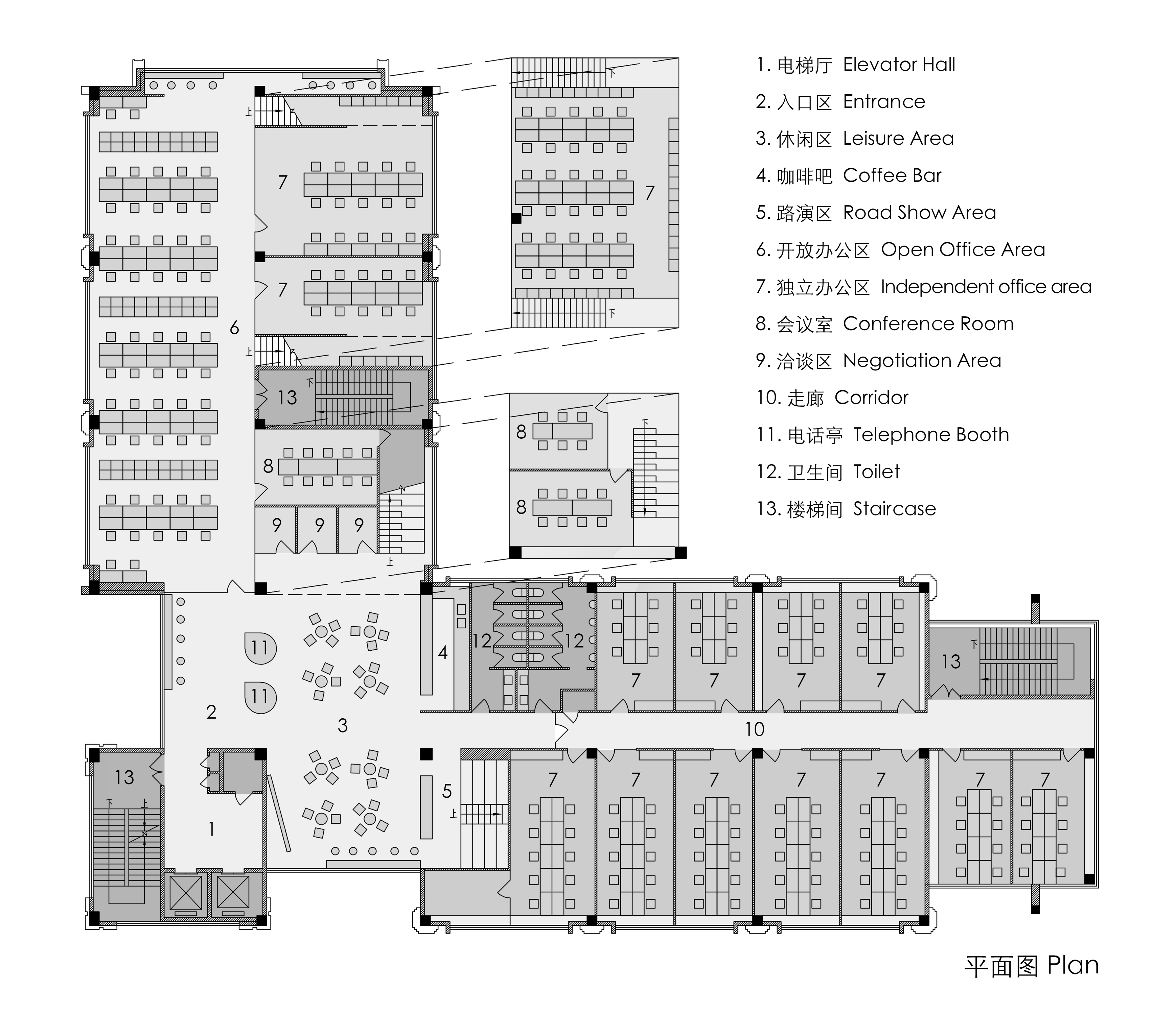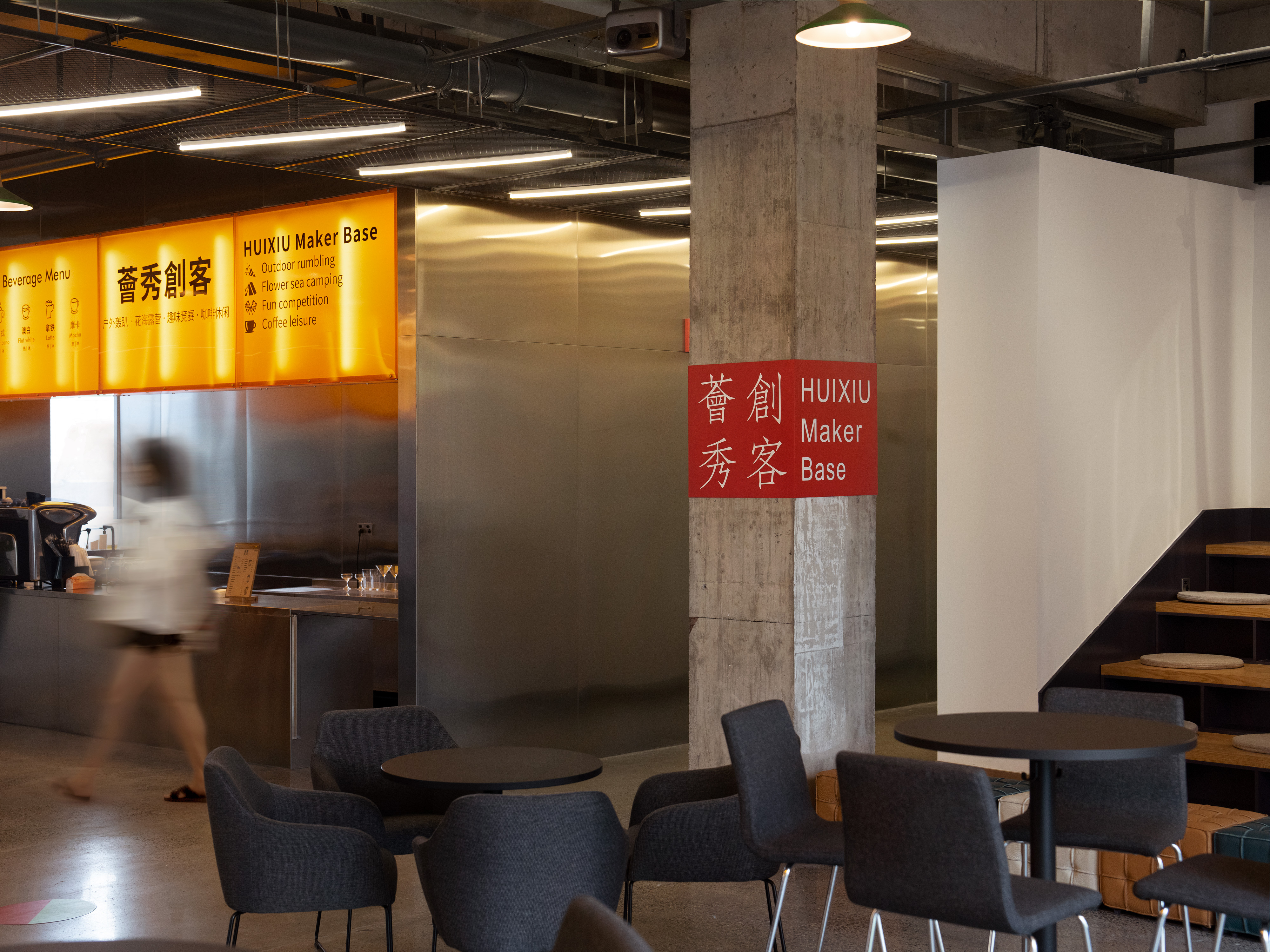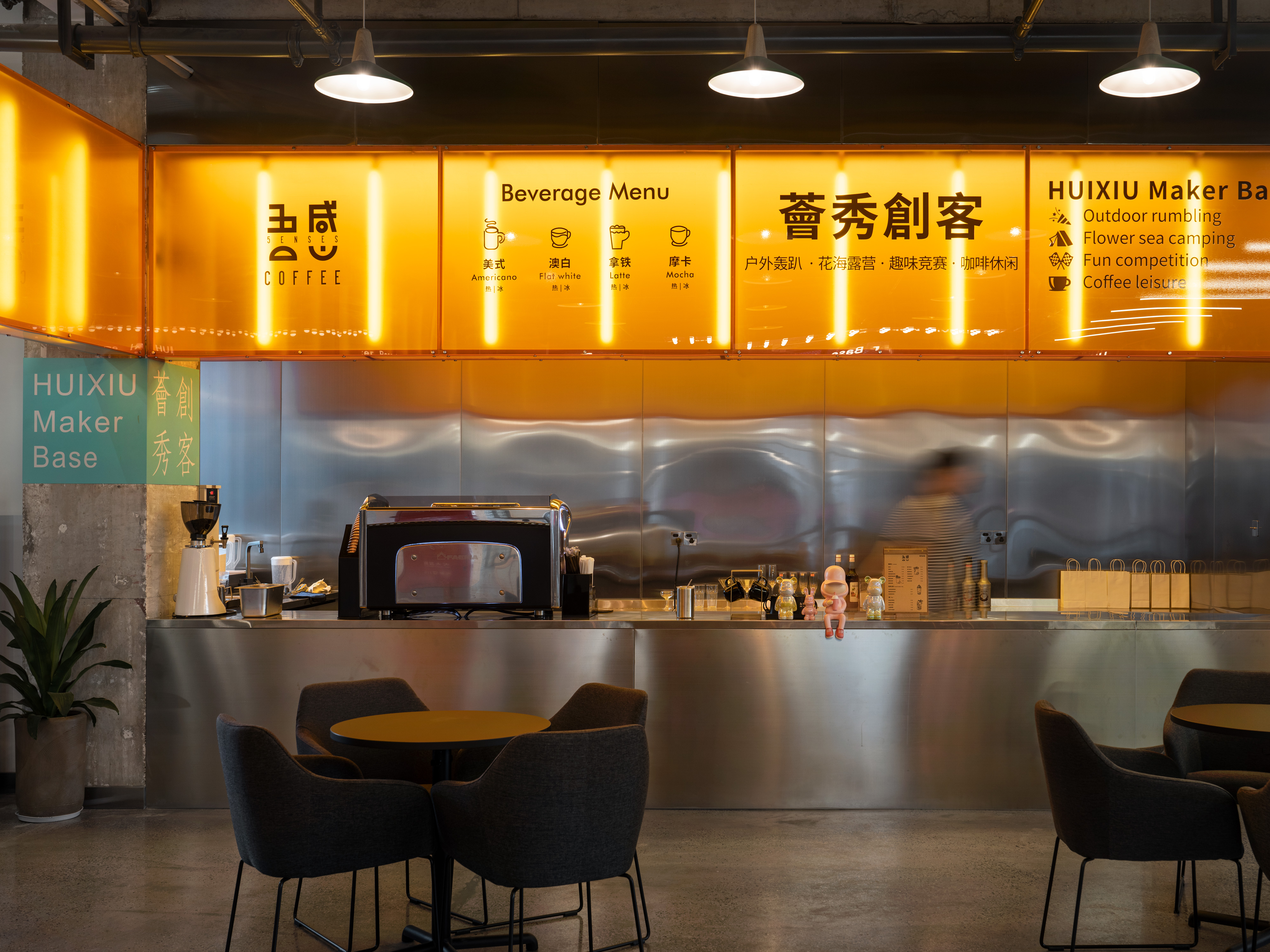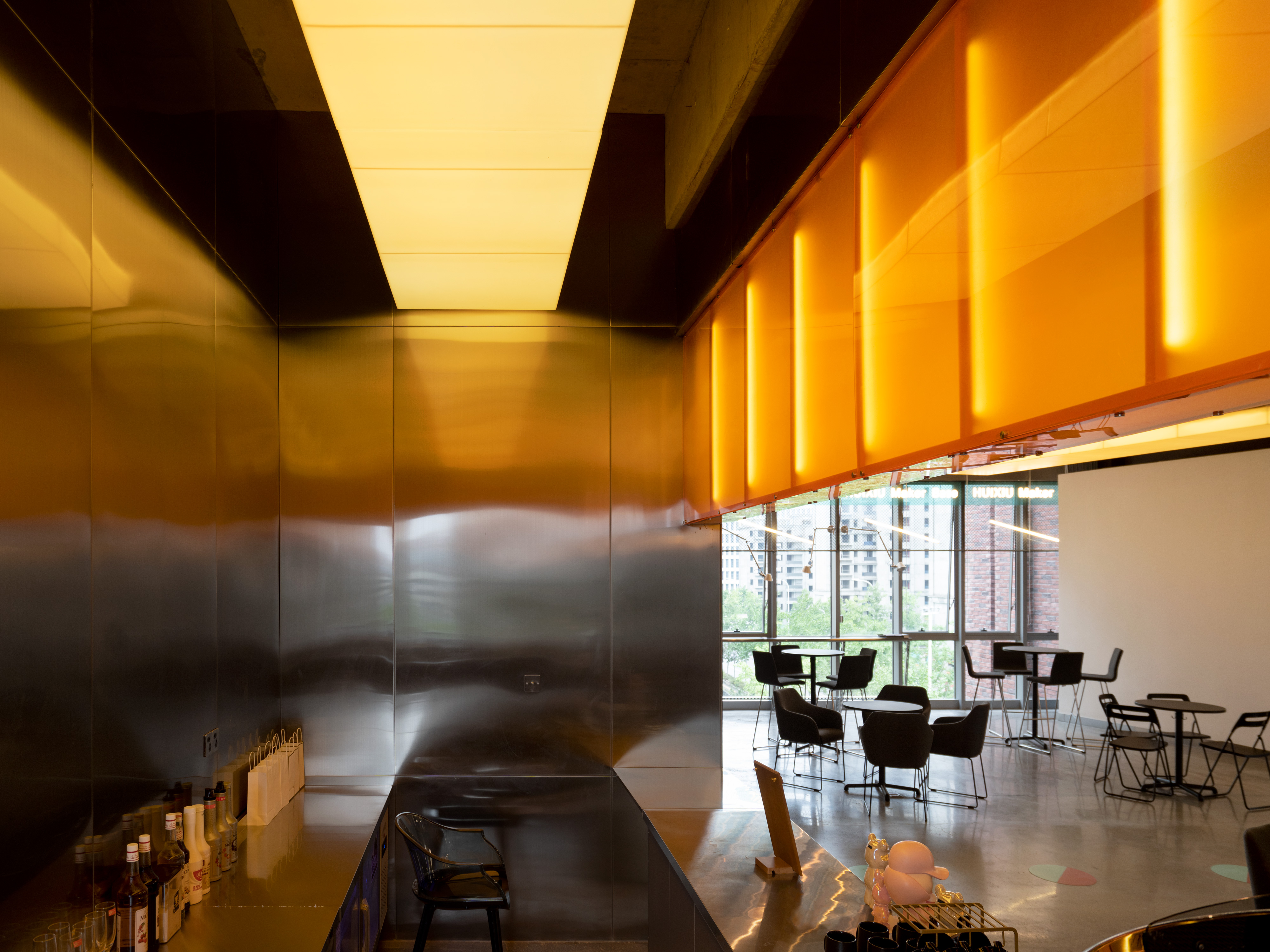 ▲电话亭细节 Details Of Telephone Booth ————根据业态需求,我们在共享空间中设置了一处咖啡吧,提供饮品和简单的点心。在咖啡吧旁是开放的路演空间,这里承载了主要的公共活动功能。 According to the business requirements, we set up a coffee bar in the shared space, serving drinks and simple snacks. Next to the bar is the open roadshow space, which hosts the main public event functions.