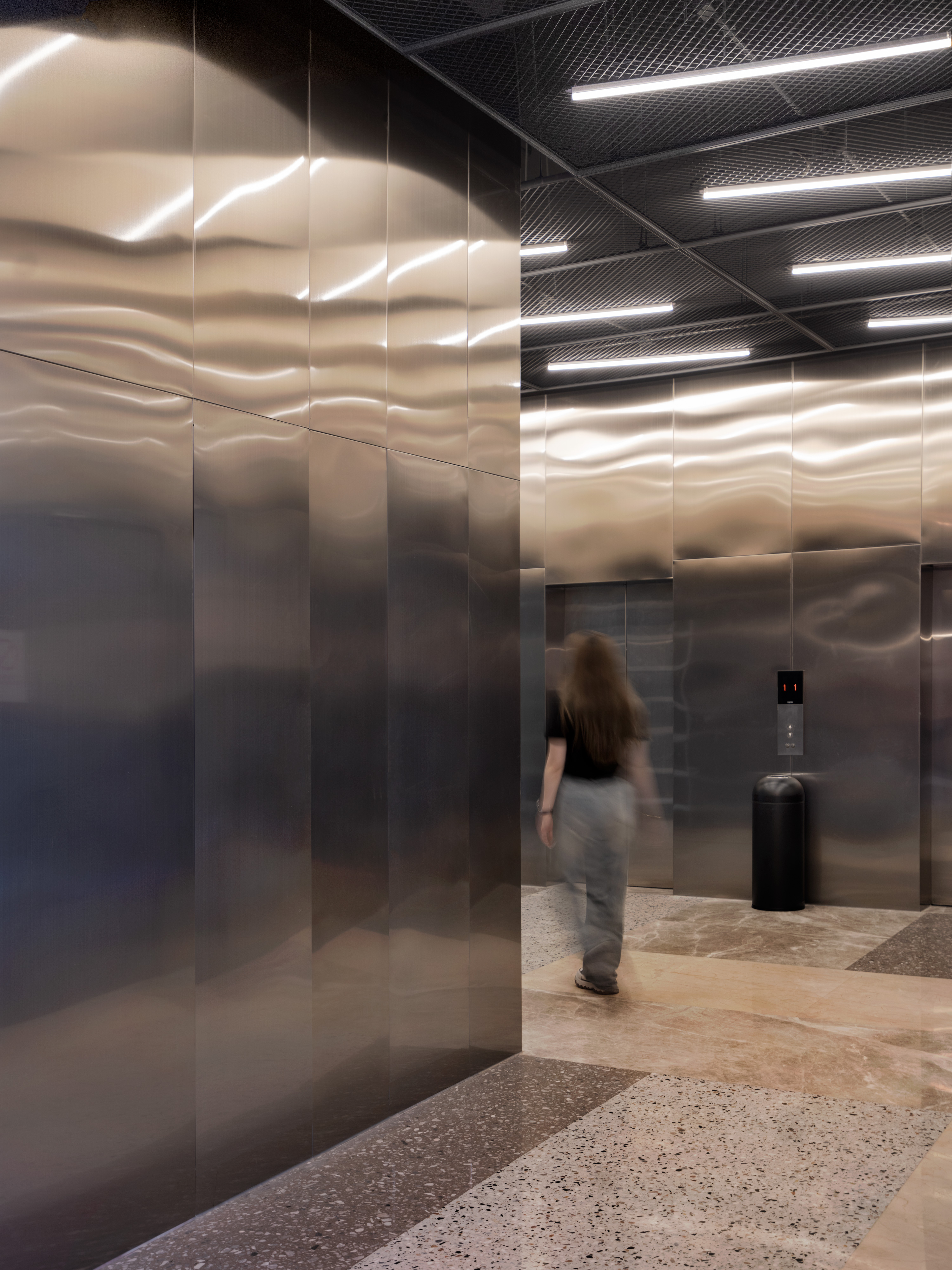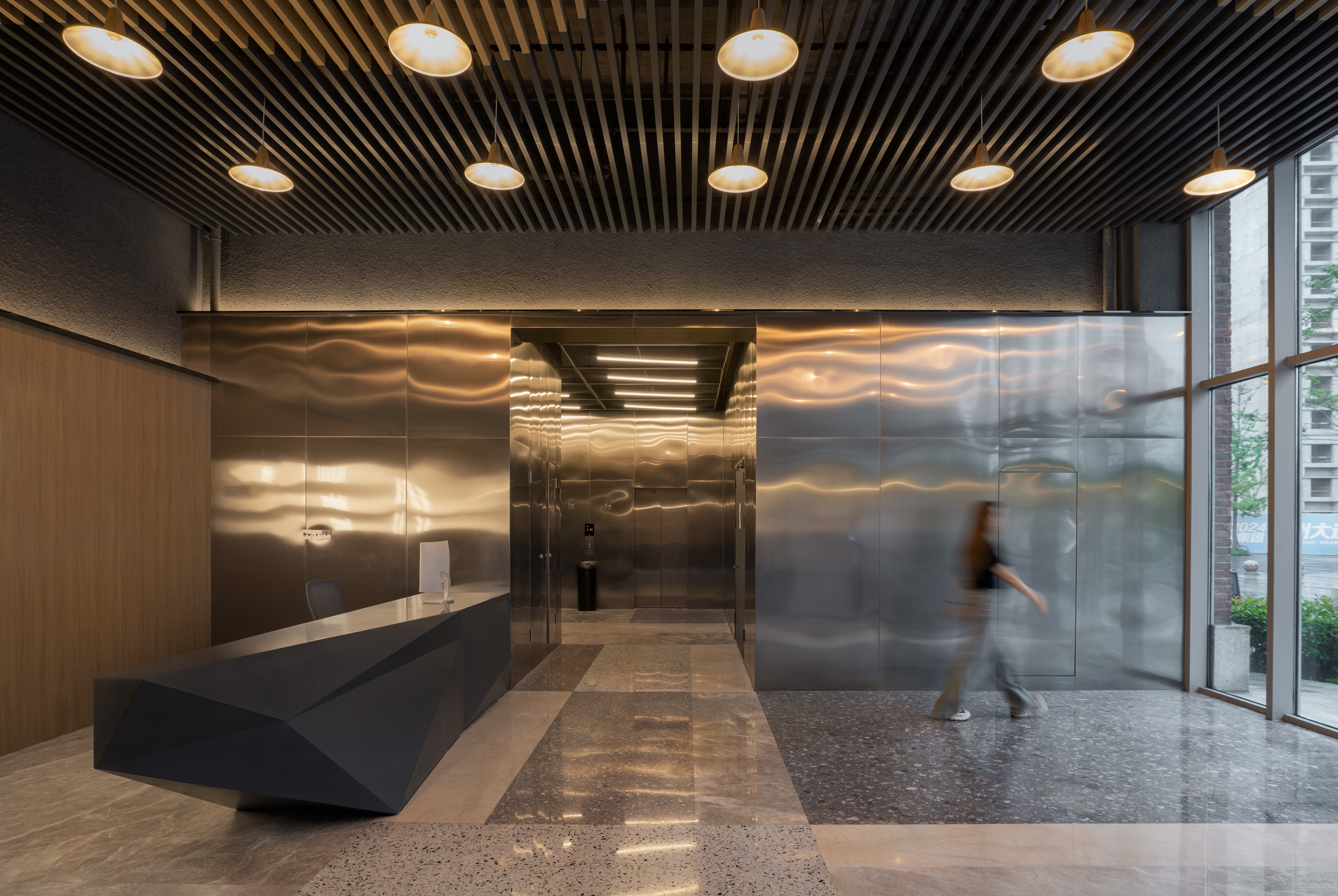▲入口厅 Entrance ————在一层的入口区,理性的灰色调是这一区域的主旋律,在此基调下,我们赋予不同立面以不同的质感,统一而富有细节层次。拉丝不锈钢的墙面会把高色温灯光反射出横向的“火纹”,这也让酷酷的办公空间有了一些温馨感。In the entrance area of the first floor, the rational gray tone is the main theme of this area, under this tone, we give different facades with different textures, unity and rich level of detail. The brushed stainless steel wall will reflect the high color temperature light into the horizontal “fire pattern”, which also gives the cool office space a warm feeling.