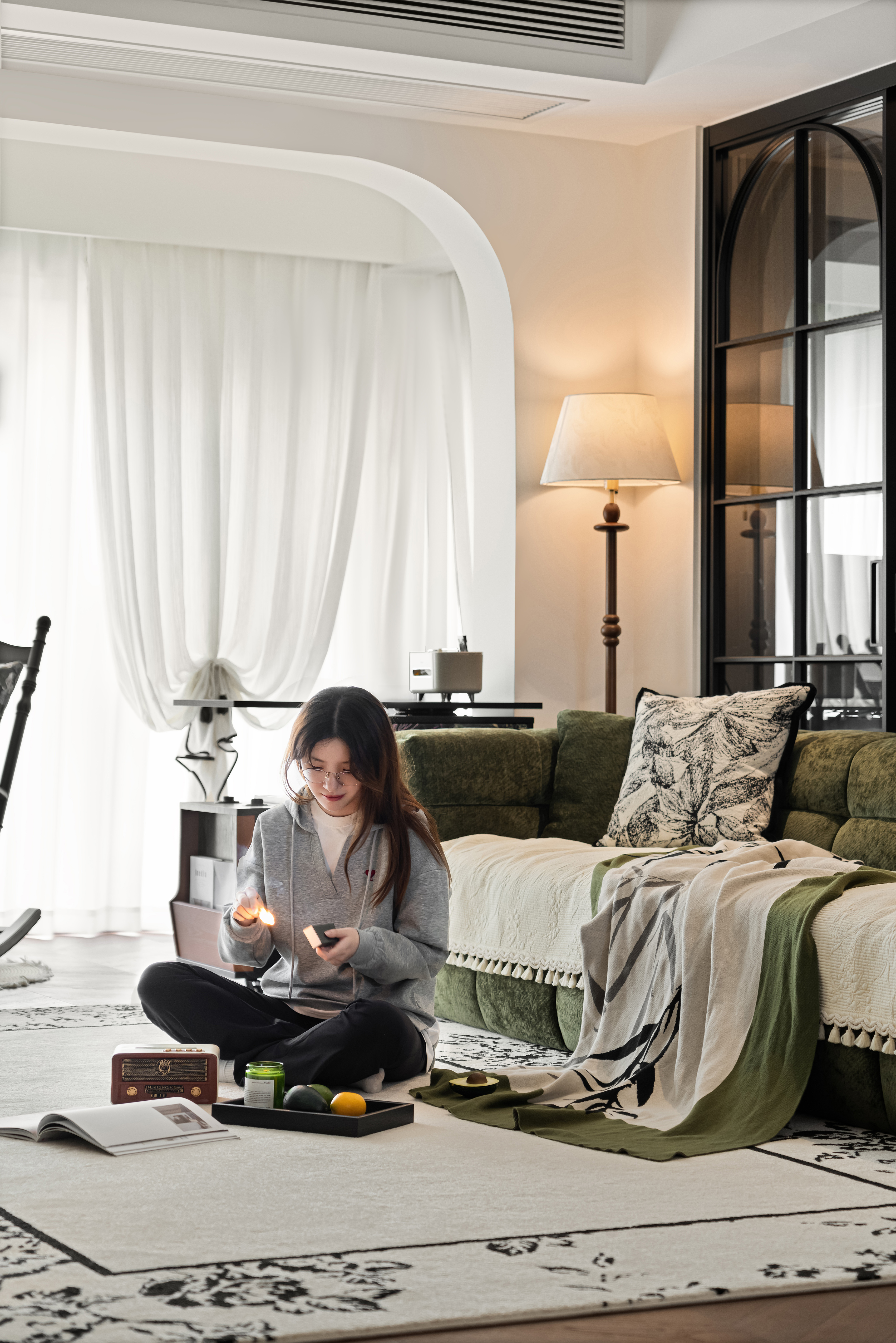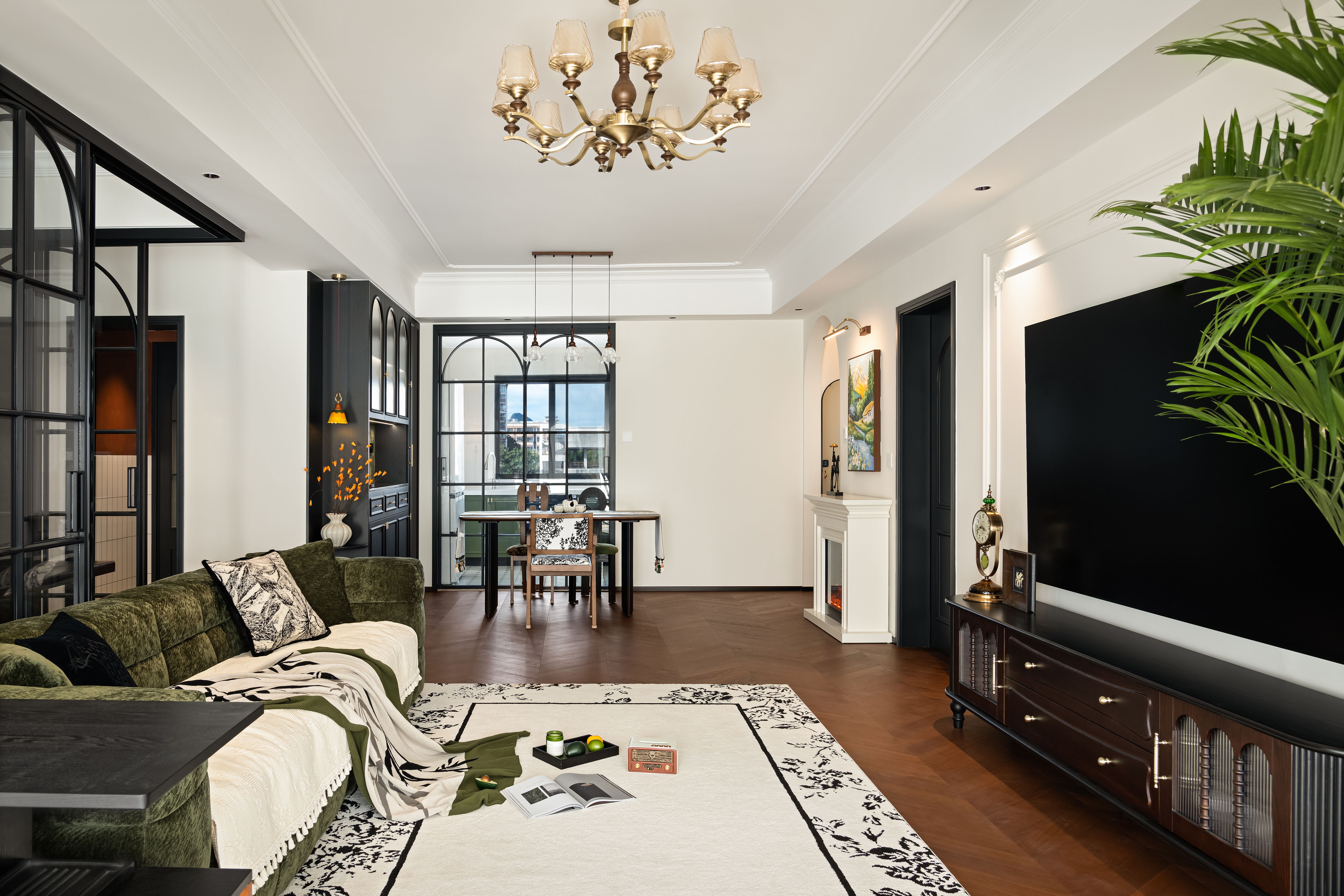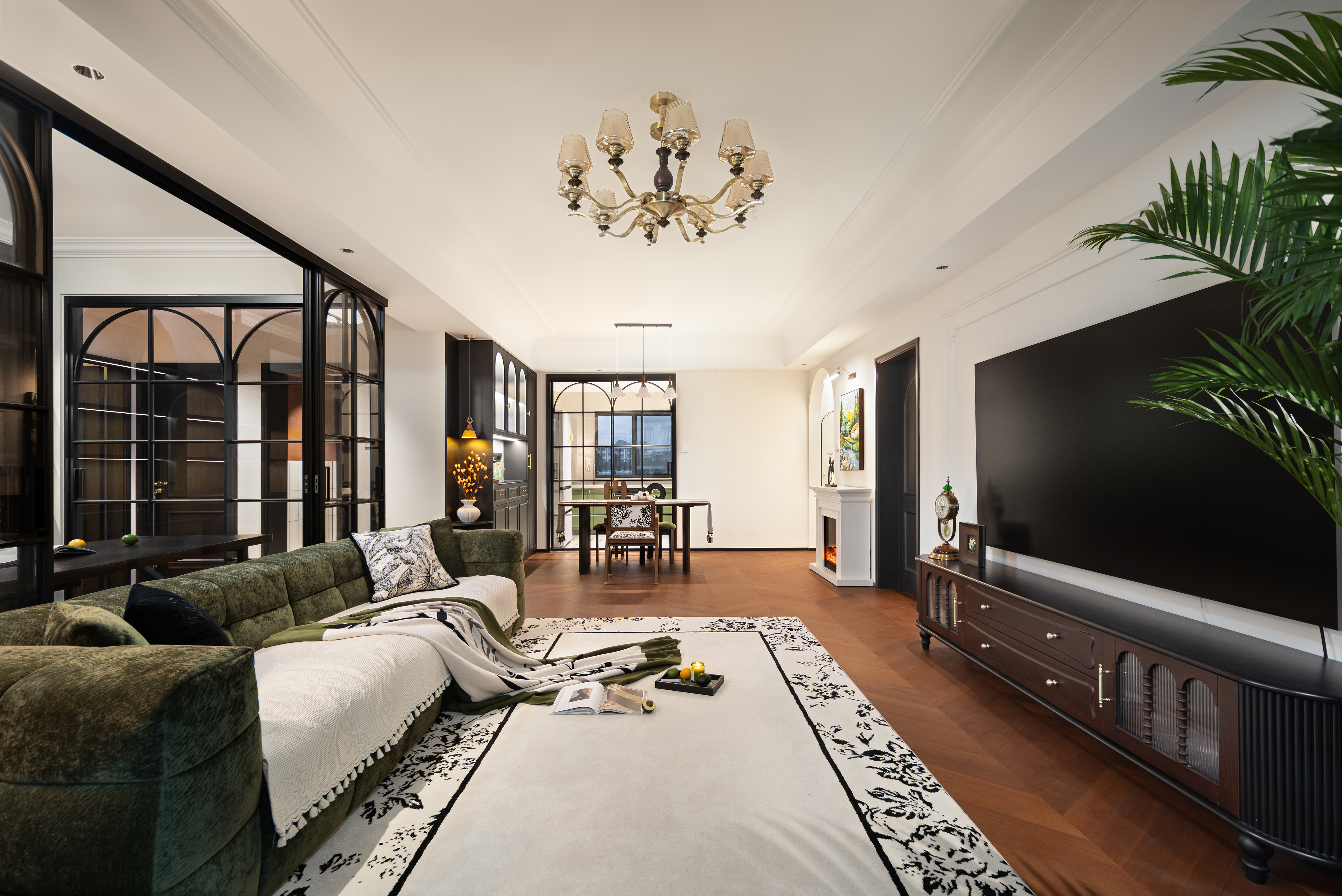 移步客厅,这里无疑是家中的社交中心,绿色的沙发散发着浪漫且优雅的气息,仿佛一位历经岁月的智者,静静诉说着往昔故事。一株散尾葵野蛮生长,绿意冲破深褐主调,为空间注入热带的生命力,这里不仅是待客之地,更是一场设计对生活的温柔策展。