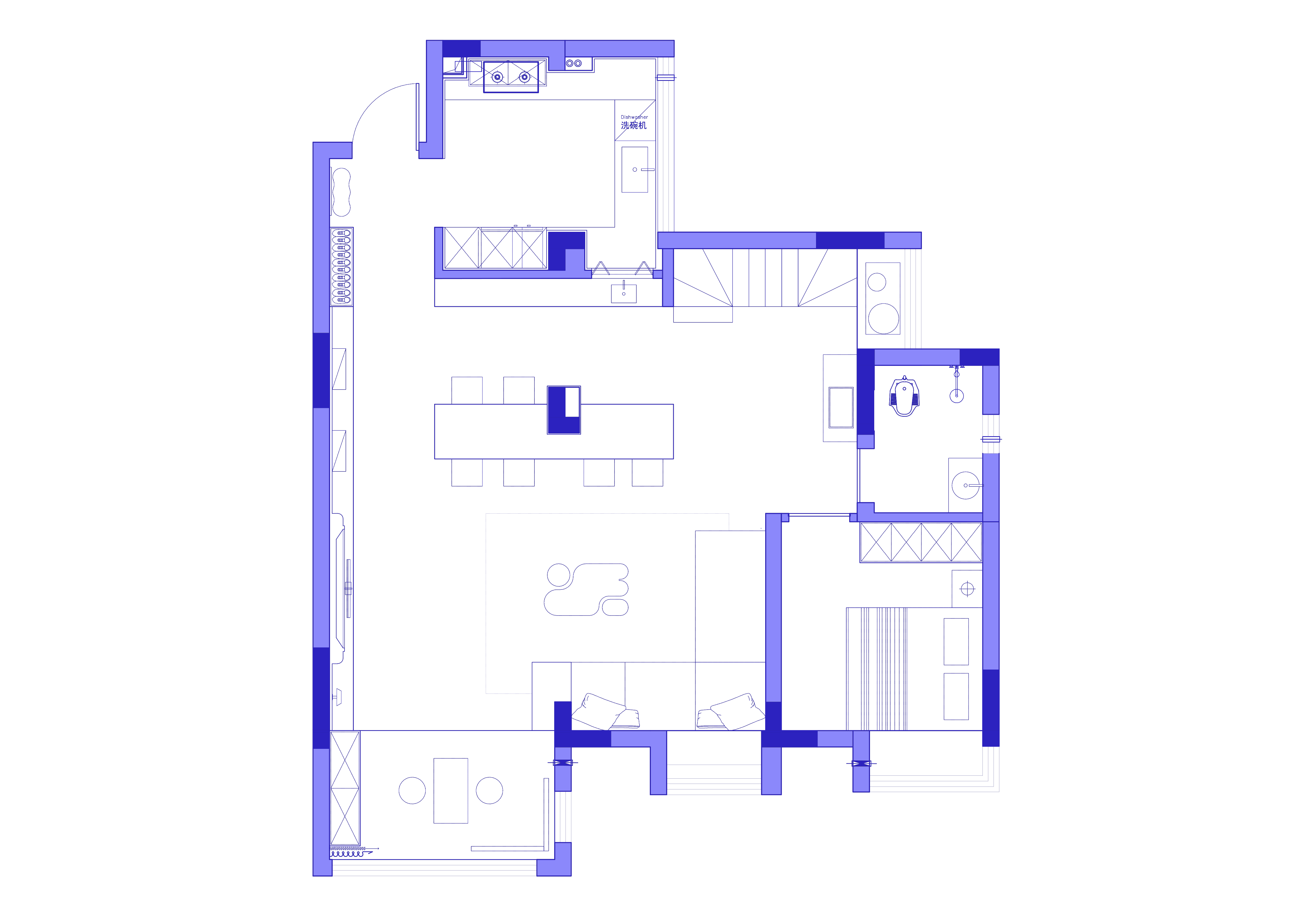 为契合业主婚后的社交愿景,一层空间做出战略性取舍——仅设一间卧室,以此换取入户、客厅、餐厨厅的极致开放与互动可能。这不仅是物理空间的释放,更是对生活重心的主动定义。拾级而上,二层则化为专属的静谧领地,主卧与阳台共同回应着对亲密与内省的深层需求。