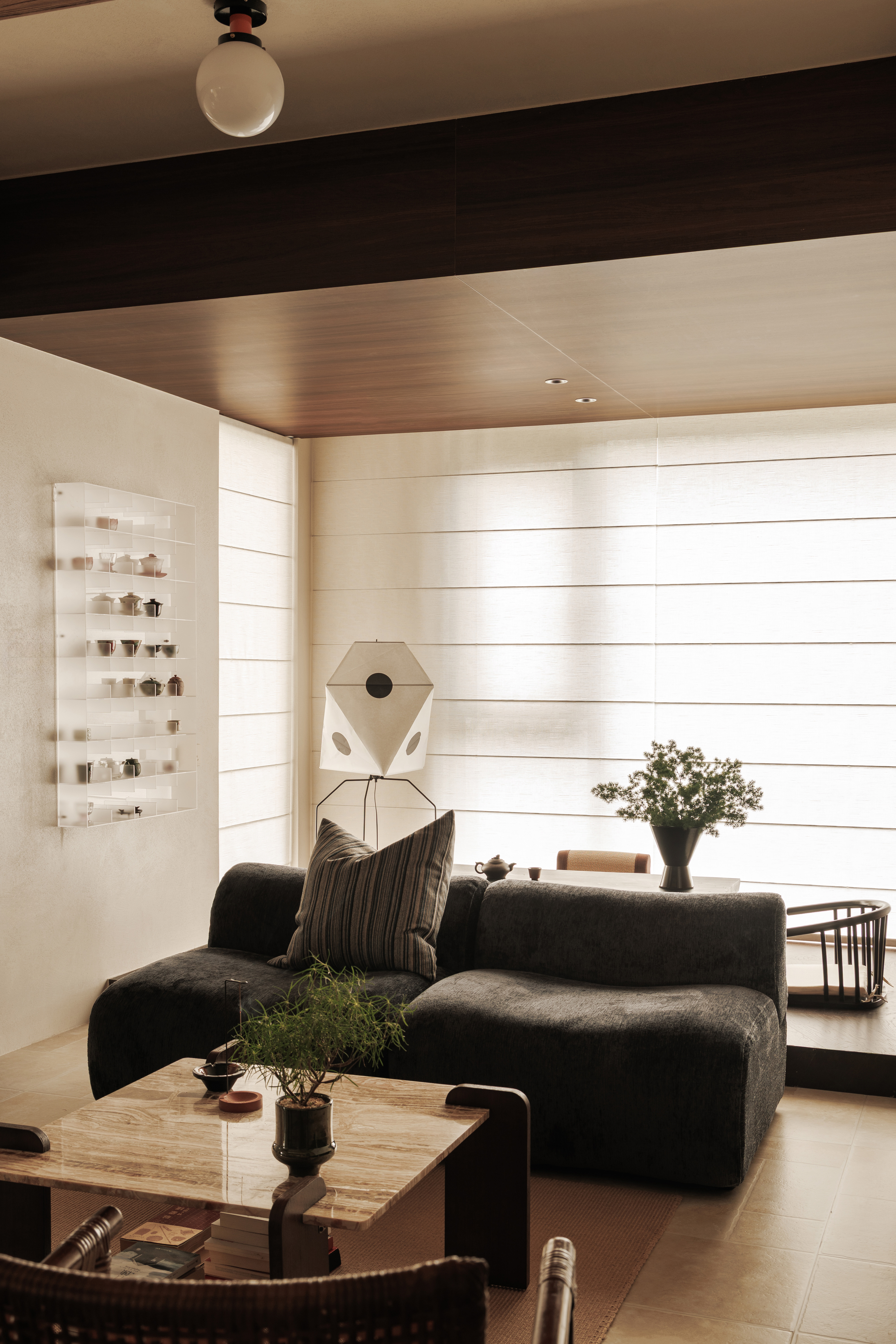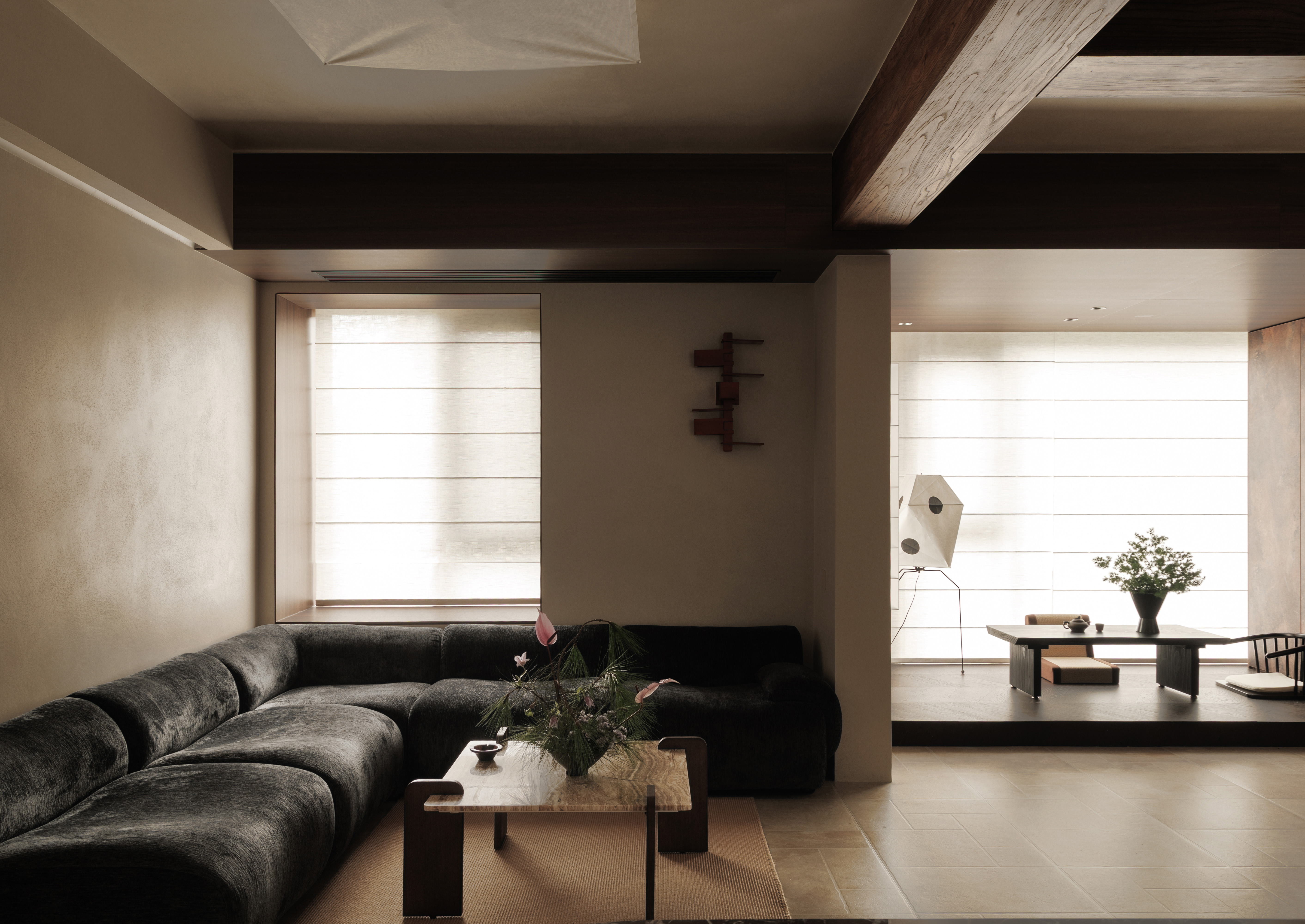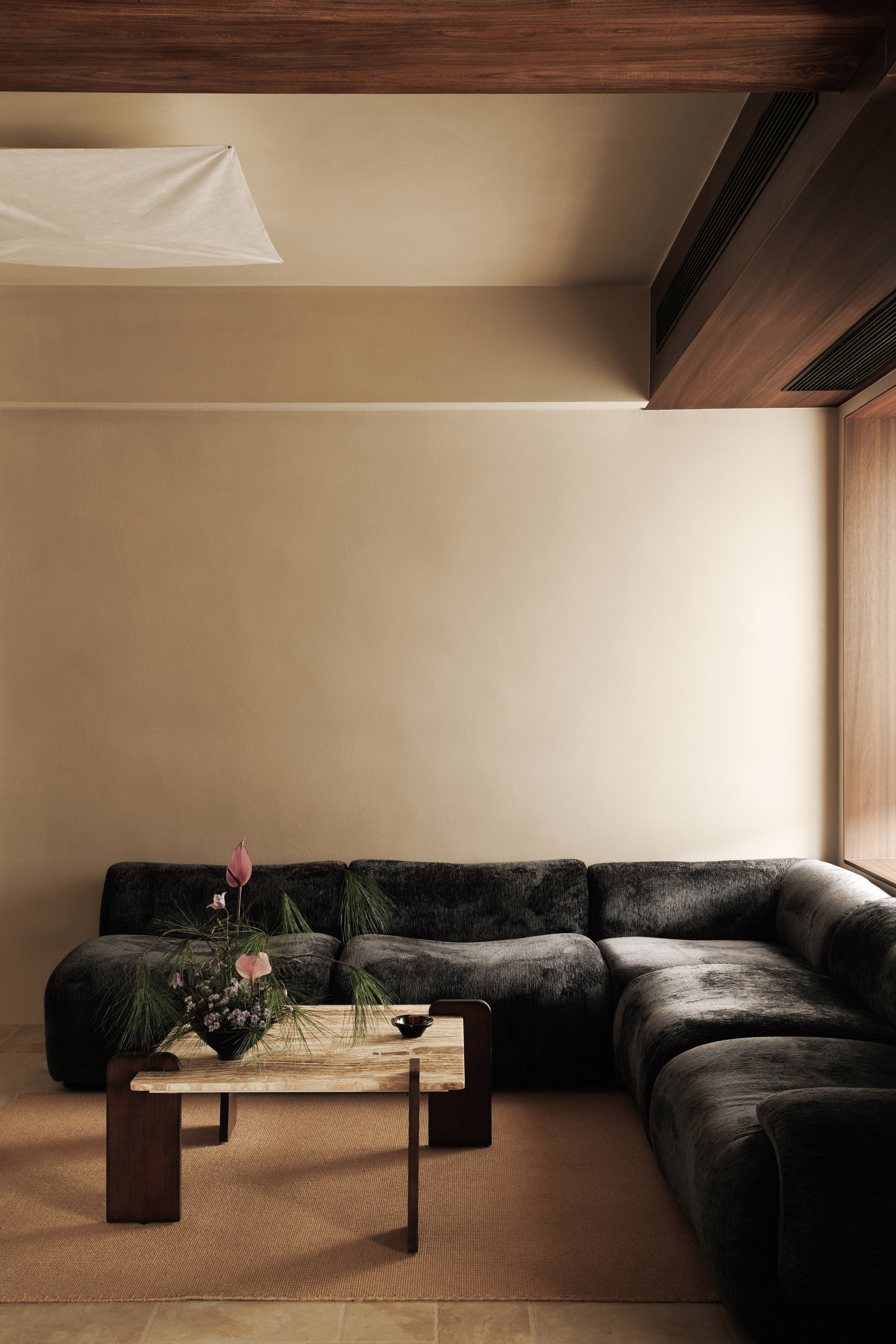 山与缦的结合,正如坚硬的石材被一层轻柔薄雾包裹,晨光穿过氤氲,洒下柔和的光线。石材与原木的粗犷肌理,并非冰冷的展示,它们承载着时间的记忆与自然的呼吸;而当它们与纱帘的朦胧、绒布的温润光泽相遇,便构成了空间中最动人的叙事——触感上,是粗糙与光滑的低语;视觉上,则是自然与人文的交融。 -