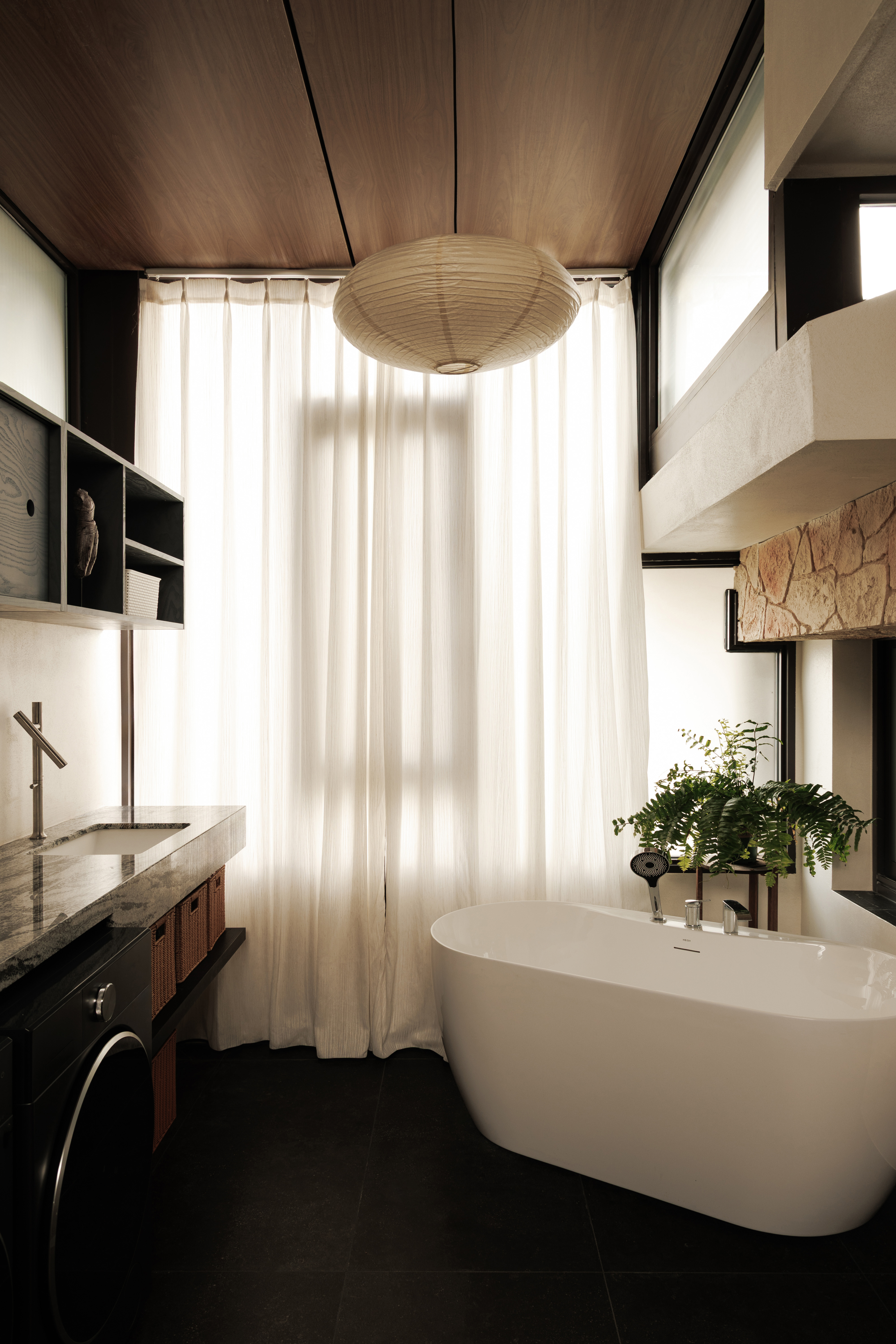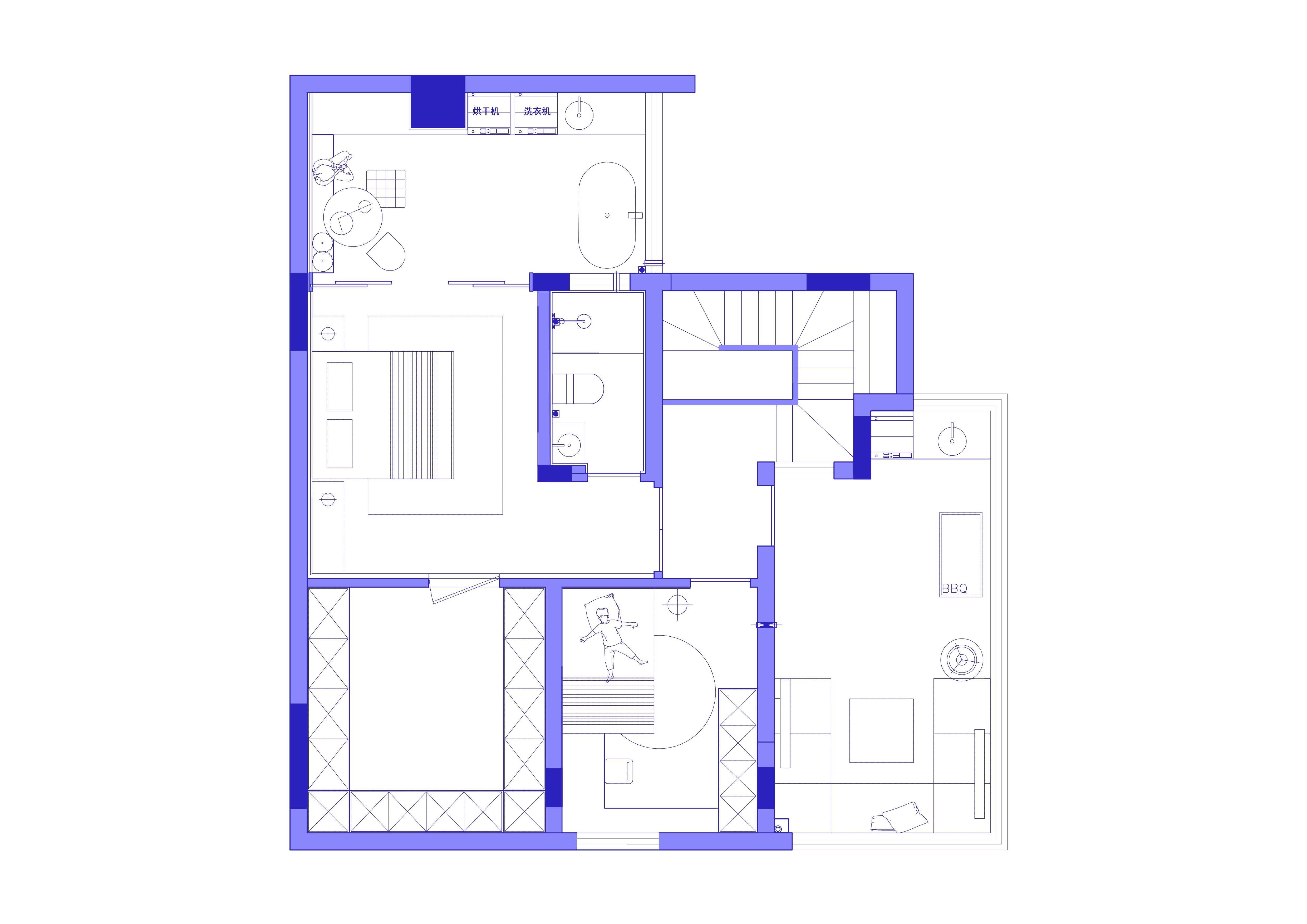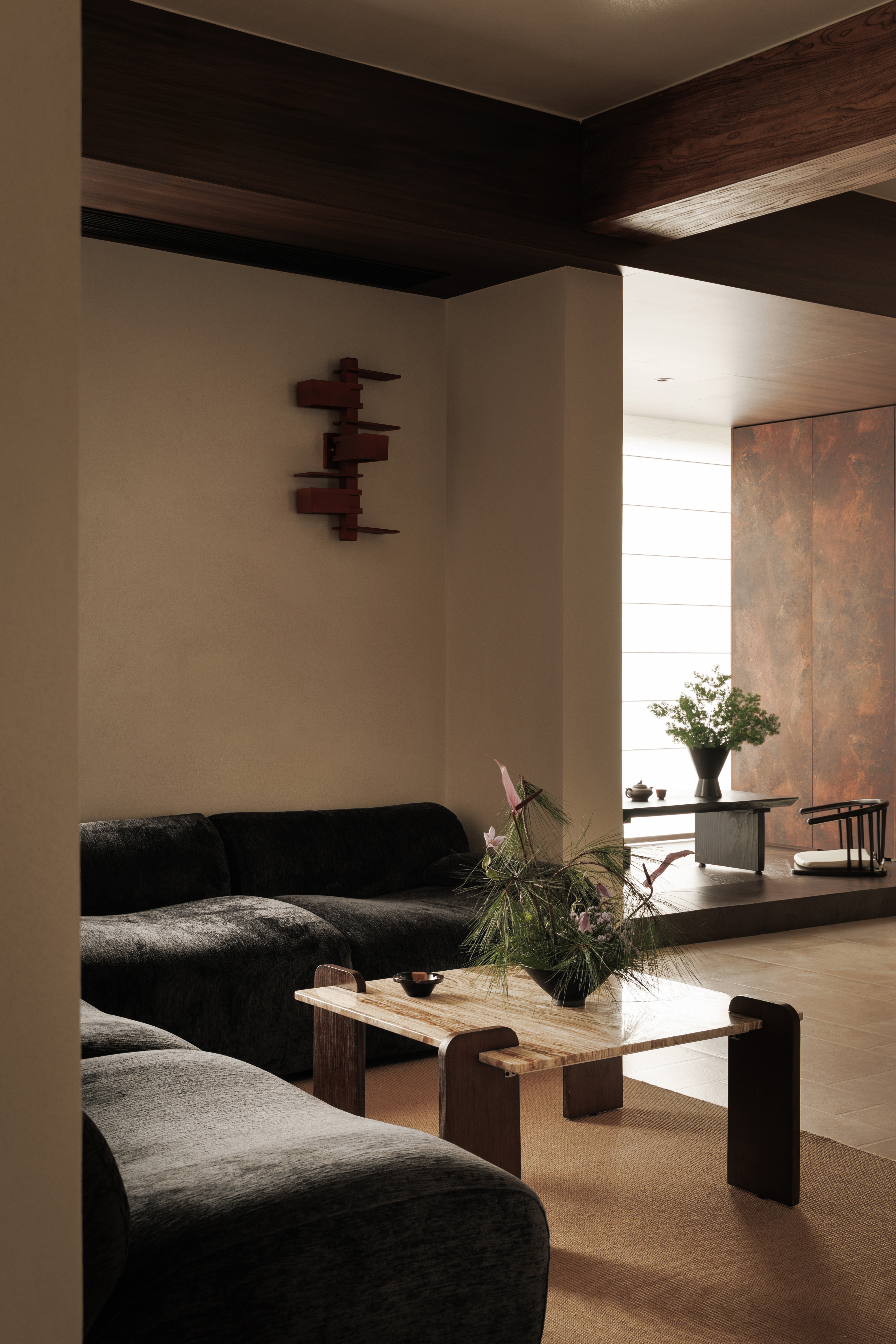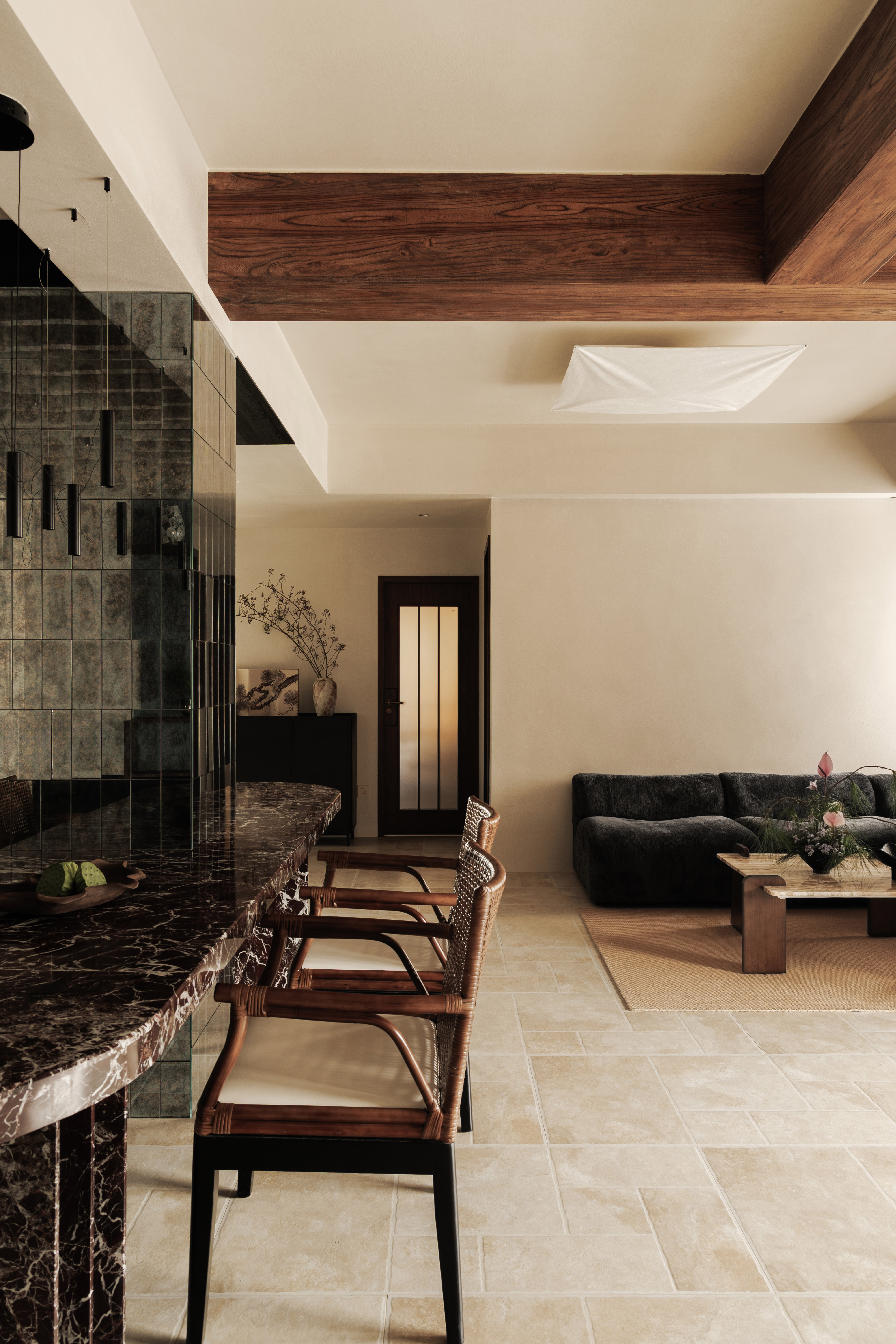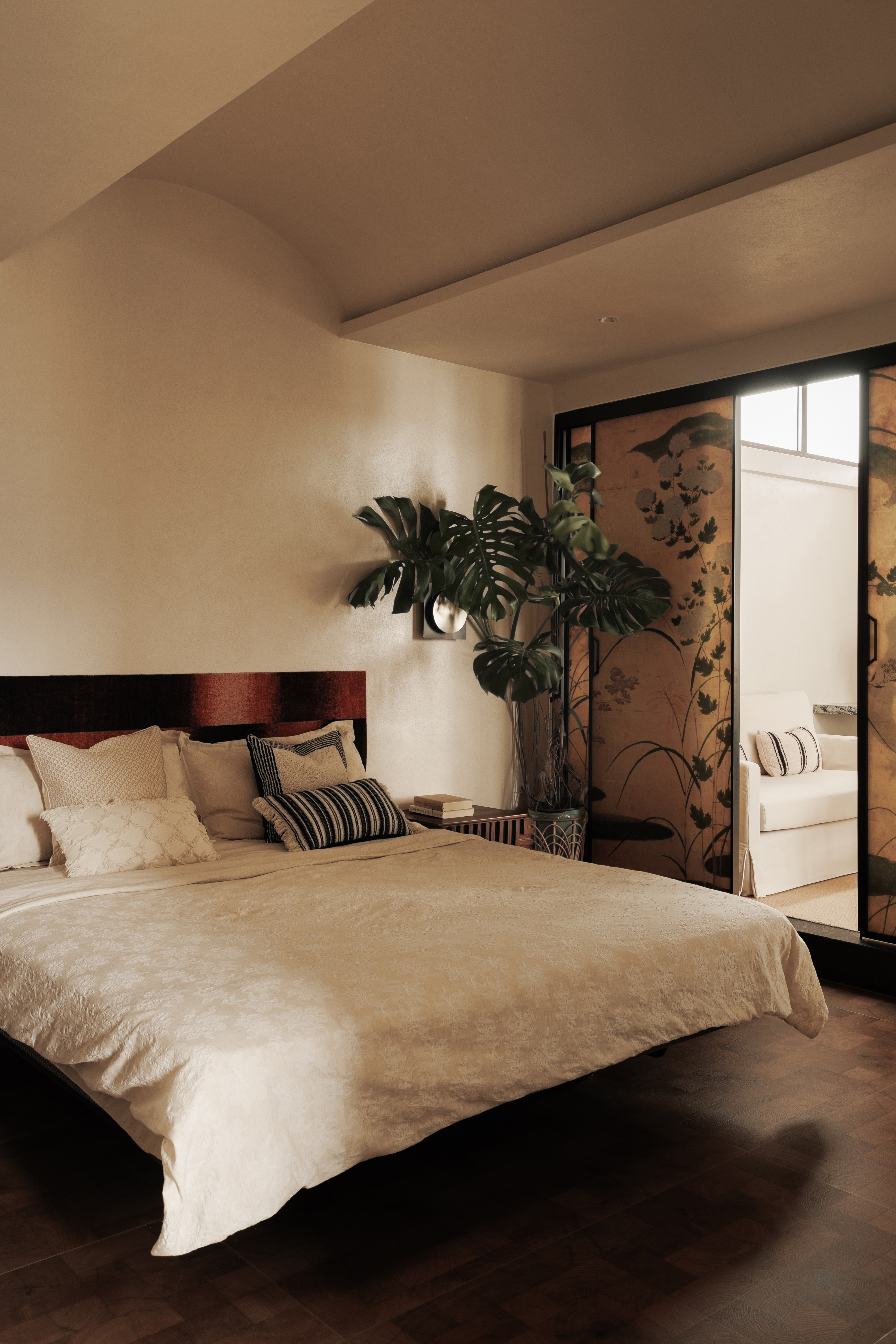 二楼主卧,被重塑为一处兼具山的庇护感与丝的舒适感的居心之所。它将冥想区、主卫与衣帽间整合于一体,功能彼此独立,气息却流畅贯通。山峦般起伏的屋顶、错落的阶梯与中式画隔断的组合阐释了“天、地、人”的象征,赋予空间深邃的文化内涵。生活动线于此自然而然地舒展,平衡了自然与人文、力量与温柔、传统与现代。 -
