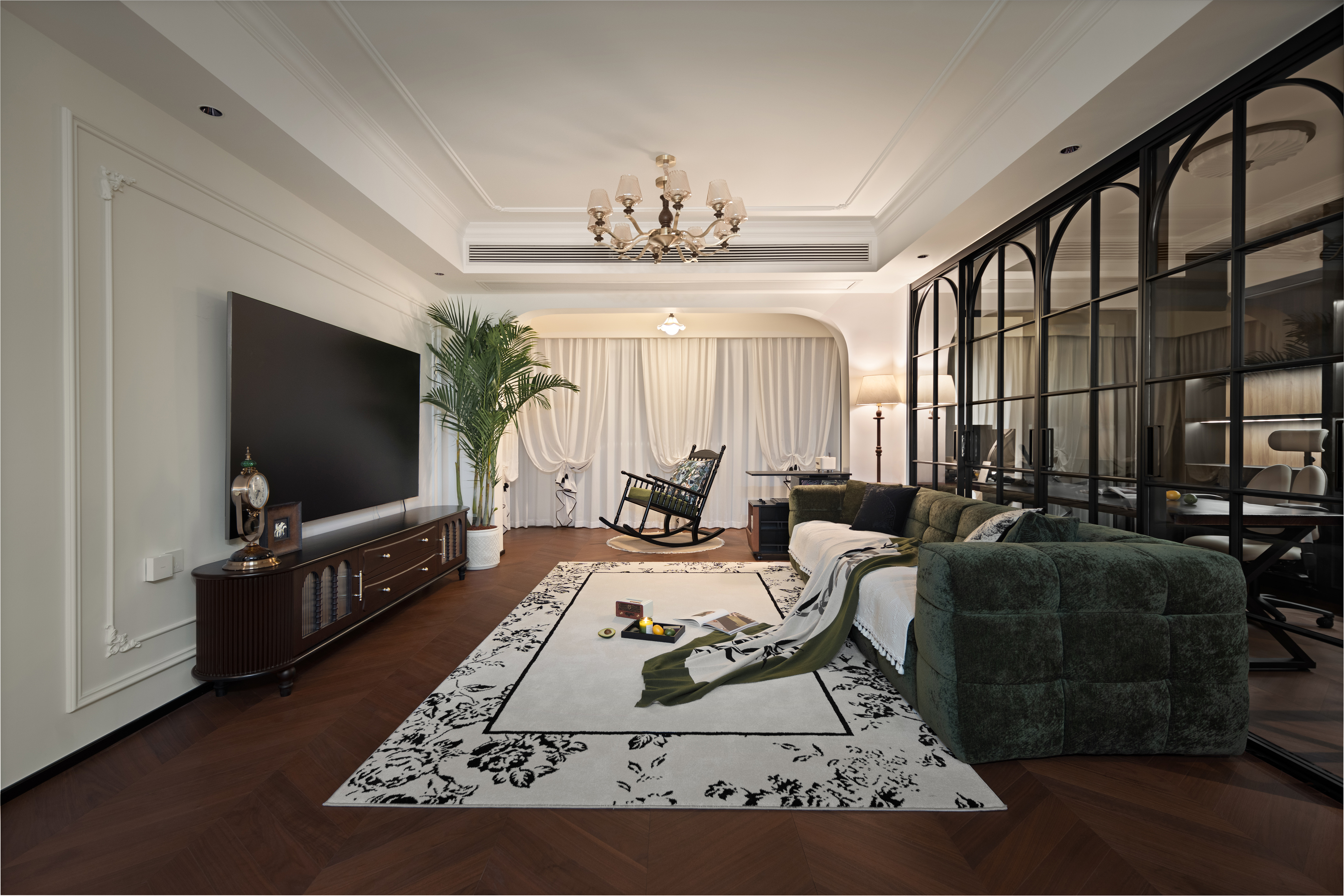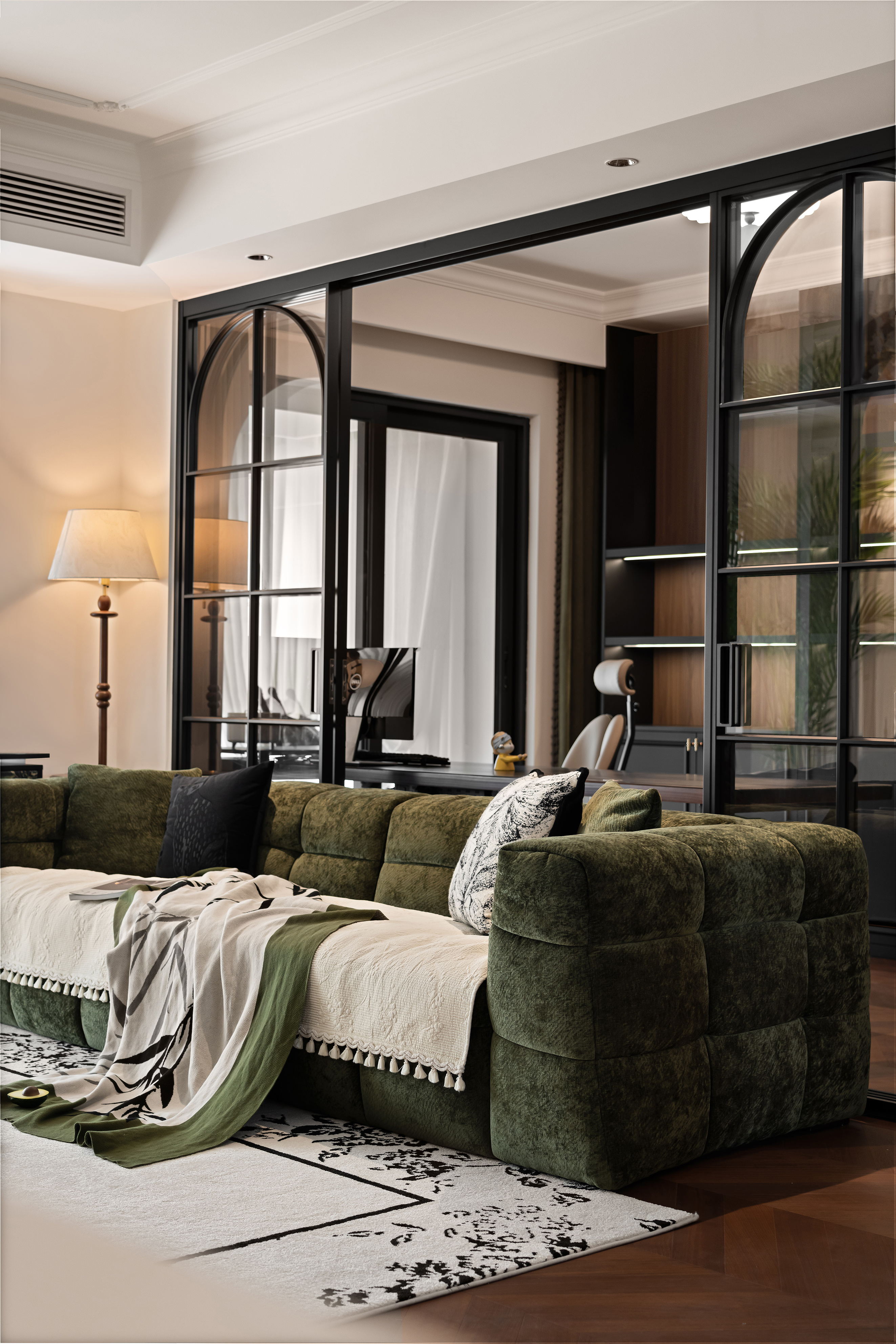 空间布局:用一个房间打开作为开放式的书房,与客厅相连,使得空间感更强,精致的隔断玻璃门,根据生活需要收放自如,让人一进到客厅,有一种“哇塞”的感觉。