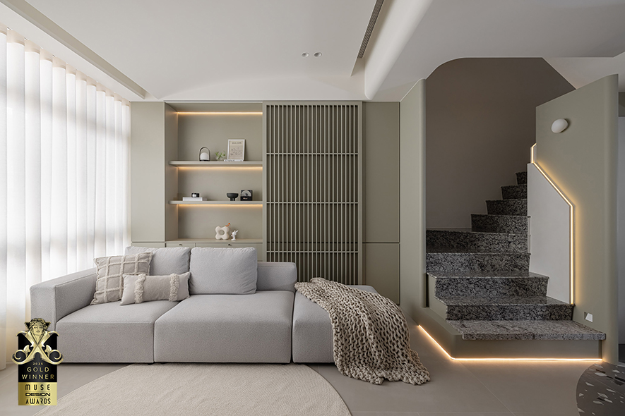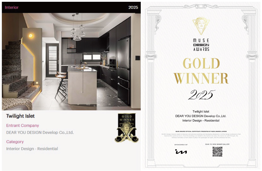 美国MUSE Design Awards致力于发掘全球设计谬思,涵盖建筑、室内、时尚等领域。2025年下半季共吸引来自124个国家、超过10万件作品参赛,由200多位专业评审严格遴选,可谓最具影响力的国际奖项之一。达誉设计团队 坚守「以人为本、环境友善」的创作初心,从细微的牆面热感应灯为长辈与幼童点亮安全路径,到隐藏式收纳最大化家庭的开阔感受;从精选低甲醛环保建材守护居住安全,到运用LED与自然光源,打造节能健康宅《暮光微屿》,每一处设计决策皆高度契合大赛「发掘兼具创新精神与人文关怀的设计」宗旨,喜获2025 MUSE Design Awards的金奖佳绩!