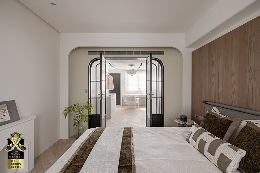 ▲睡眠区及更衣室交界处设置黑色铁件拱形对开门,并巧妙运用原有门上大樑限制,将吊隐式冷气出风口整合于樑下,在牆面色彩变化处延续拱形造型的木作设计,框出优美景深层次。