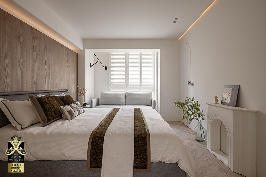 ▲主卧以淡色基调,佐以人字拼实木地板温润质感,搭配床头的深色木皮作为视觉点缀,而床尾则设置壁炉造型夜灯,营造舒适温馨的睡眠环境。
