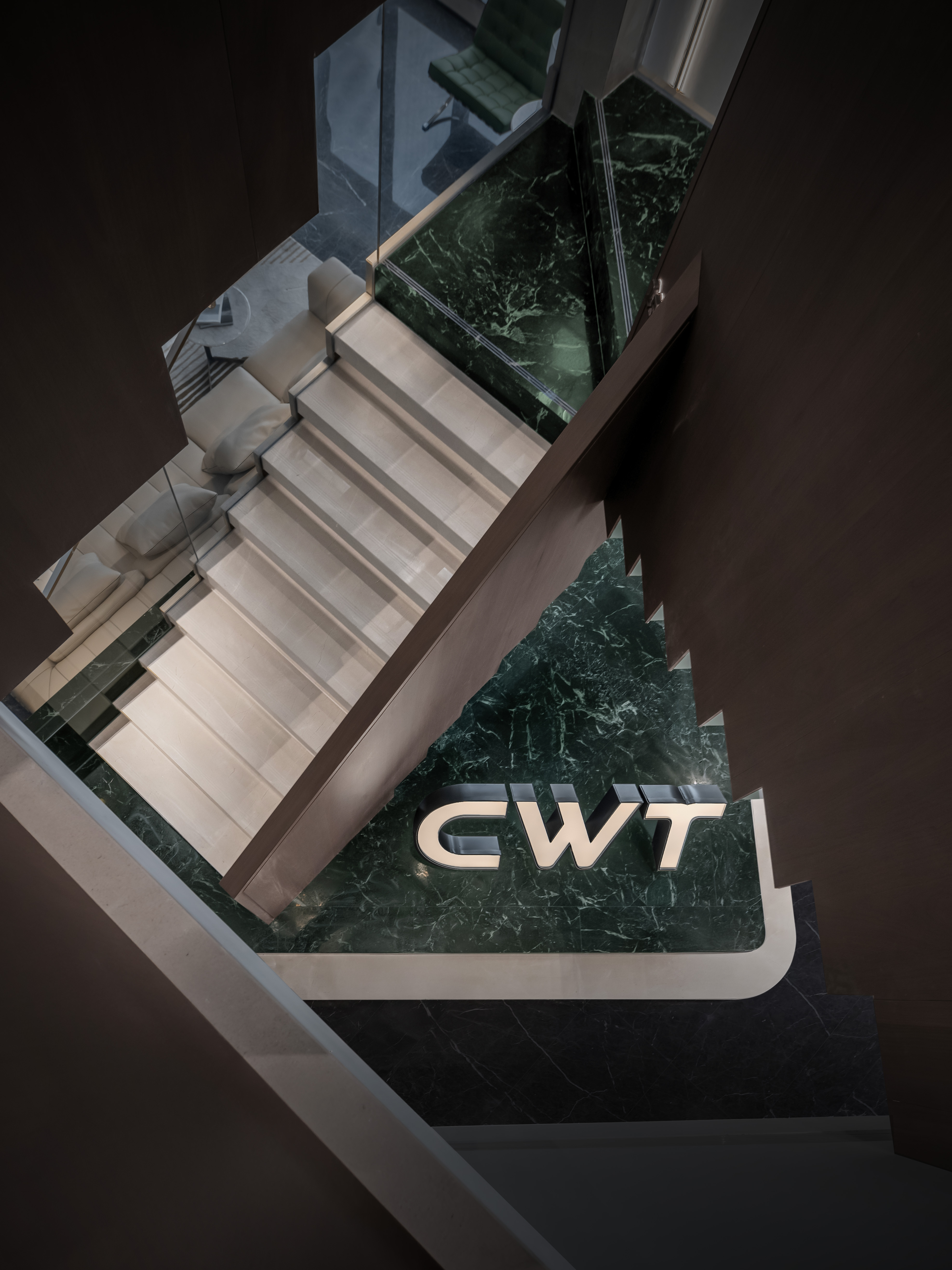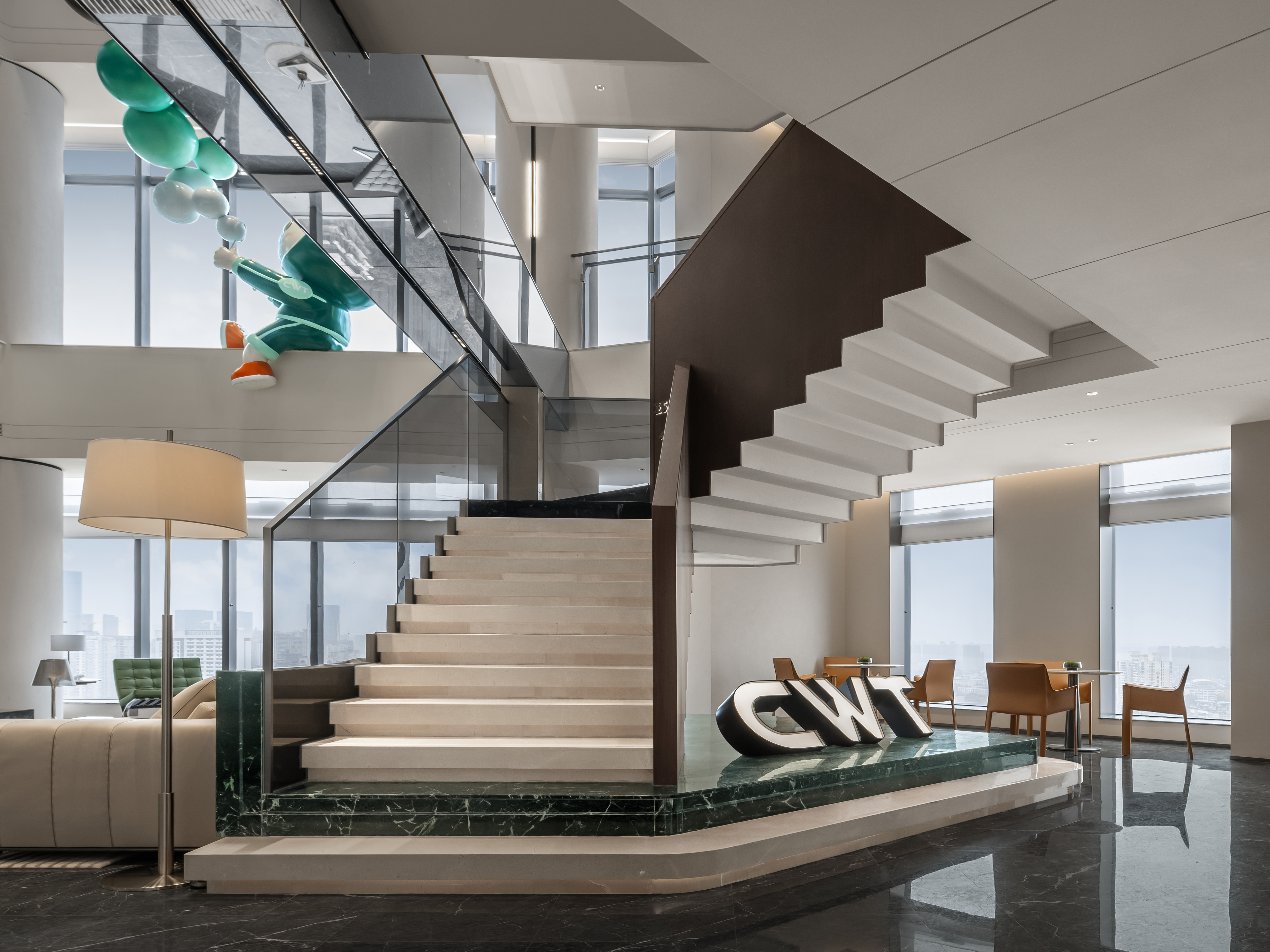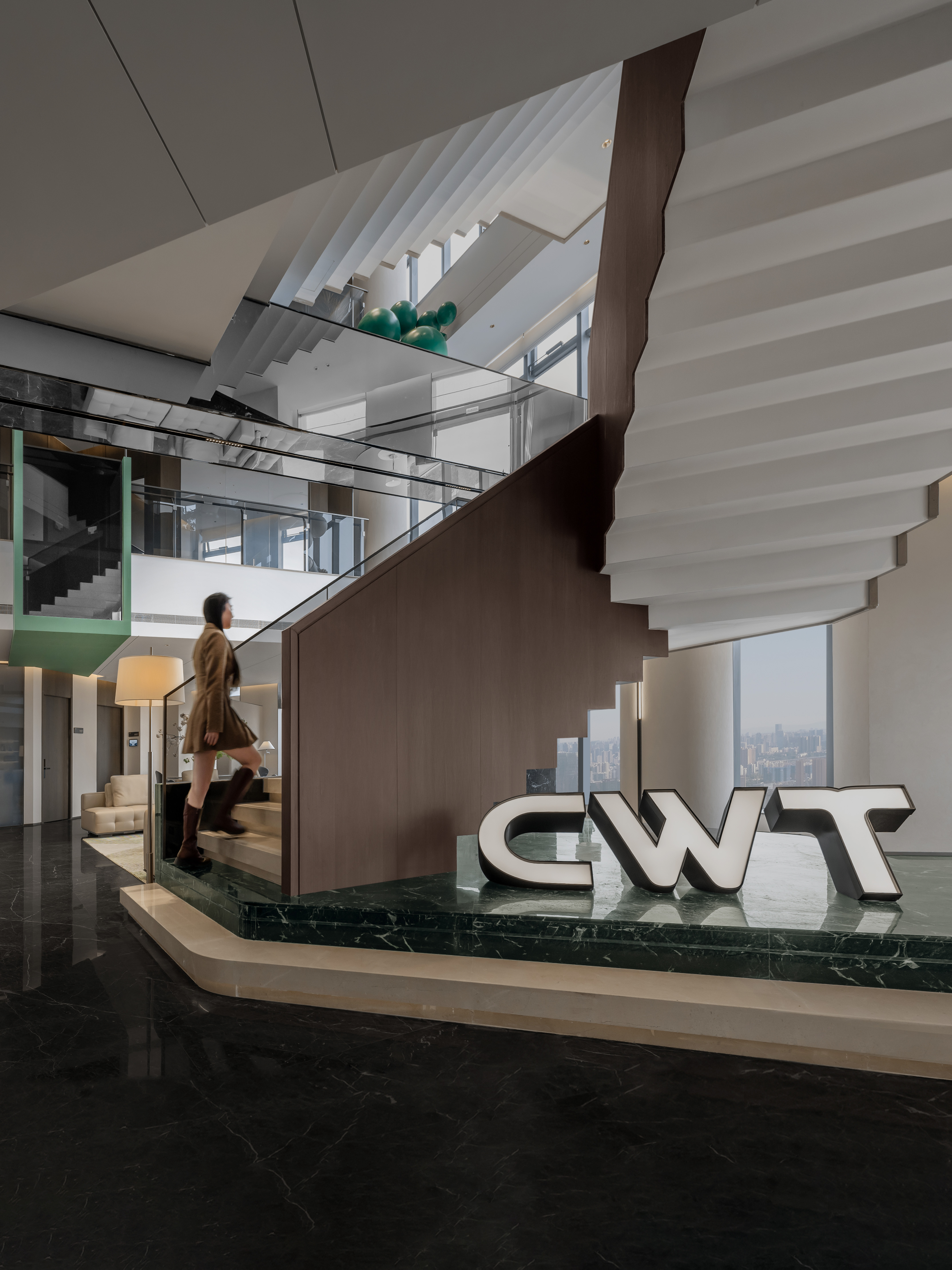 空间意境:十二米的中庭挑空区域,是空间的核心,也是CWT世界树"无界办公"理念的视觉表达。巧妙利用挑高空间,打造充满呼吸感的"树洞"。中庭顶部采用大面积玻璃天窗,阳光透过天窗洒落,中庭四周环绕着螺旋楼梯,每层楼梯的扶手采用仿古青砖纹理,与历史建筑遥相呼应。