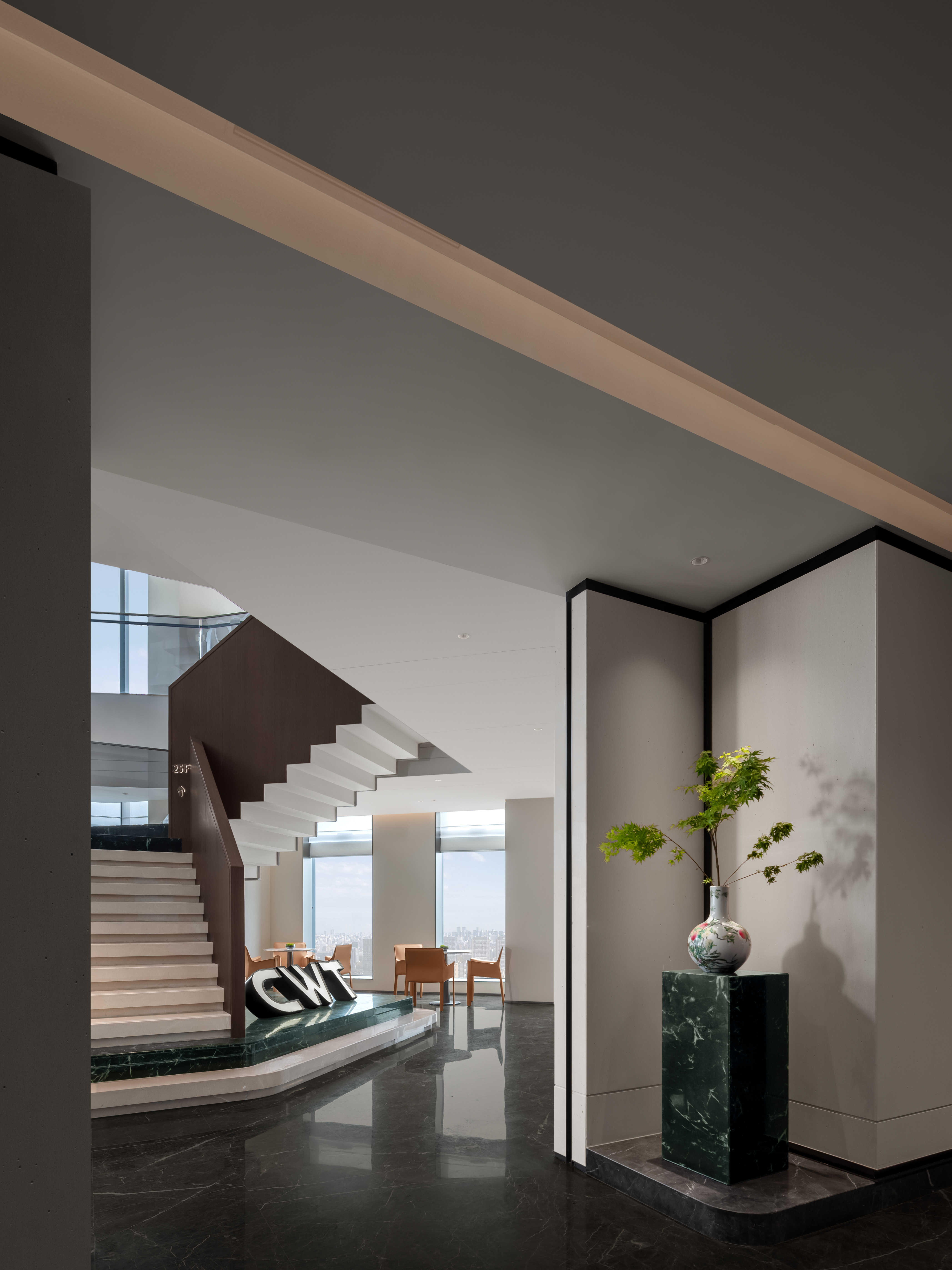 项目定位:蓝润瑞宸中心,踞守人民南路黄金中轴,裙楼聚合高端商务与创新集群,塔楼以智能调光系统、模块化空间重构办公场景,成为缝合历史与未来的城市切片。CWT世界树集团在此植入"无界办公"基因 —— 以共享空间延续"向上生长"内核,借行业沙龙、写字楼全链运营催化创新生态的根系交织,让初创团队在共享中汲取养分,于城市的土壤里向上共生。JLa设计集团 承接24-26F室内设计,从世界树集团的"根系哲学"中捕捉灵感 —— 枝叶向光而生,根系向地深耕。灵感源于成都华西坝的历史文脉,是对这片土地文化精神的致敬,空间成为"树文化"的立体注解。