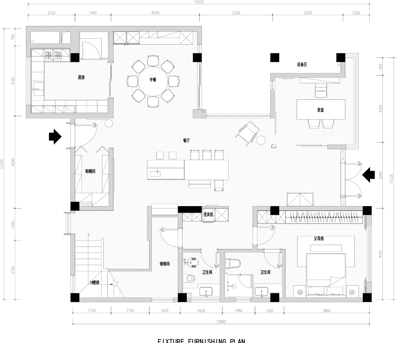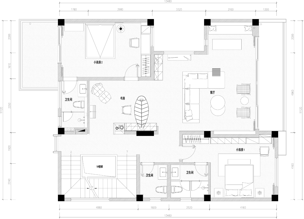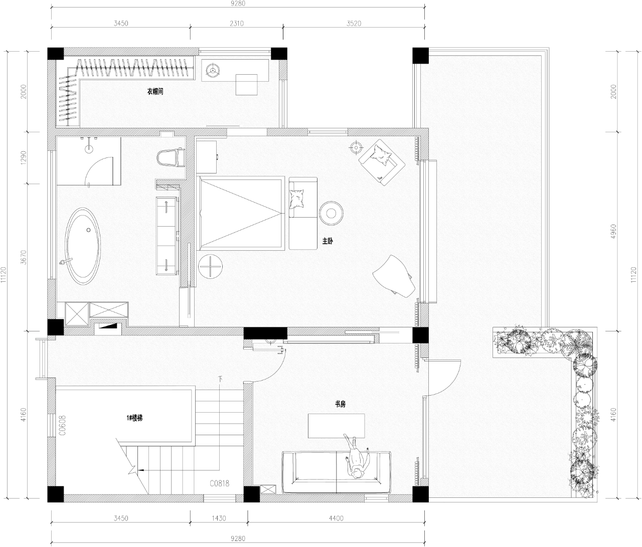 空间布局:功能规划上,我们将一层设计为父母的活动区,广东人爱喝茶,所以一层我们设计了一个公共区域的茶室,一个独立的茶室。二层地形更高,可以远眺山景,所以二层作为家庭的活动区域和两个小孩的卧室。三层则是独立的主卧套房;