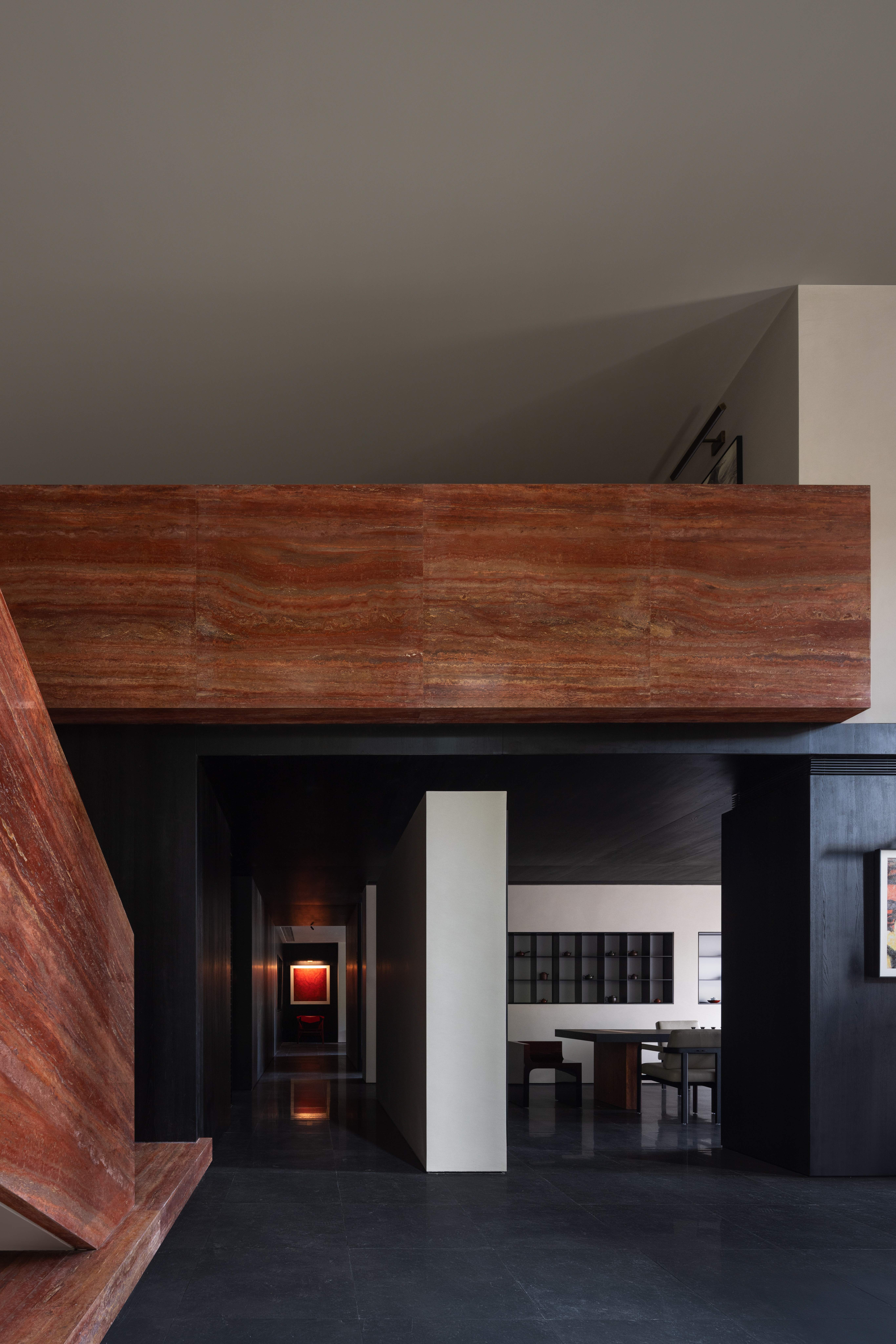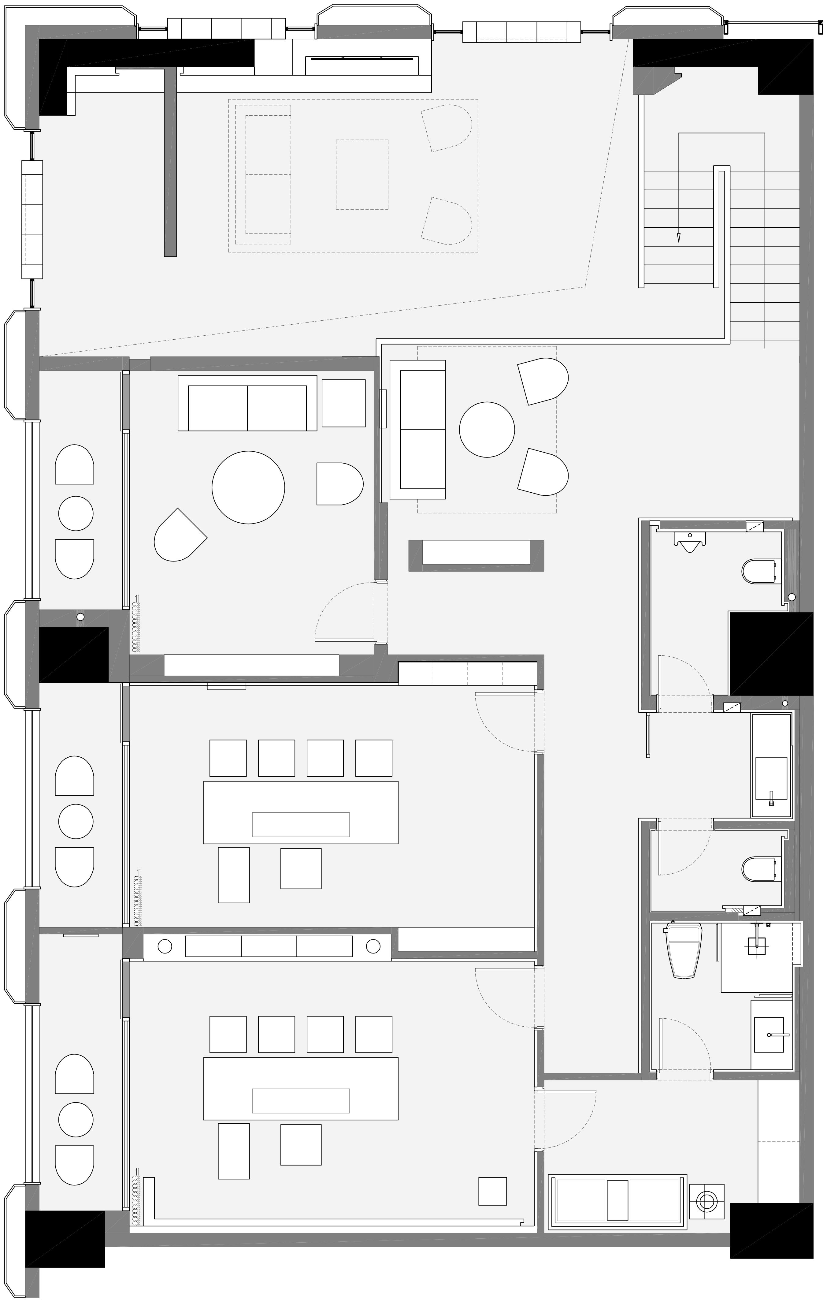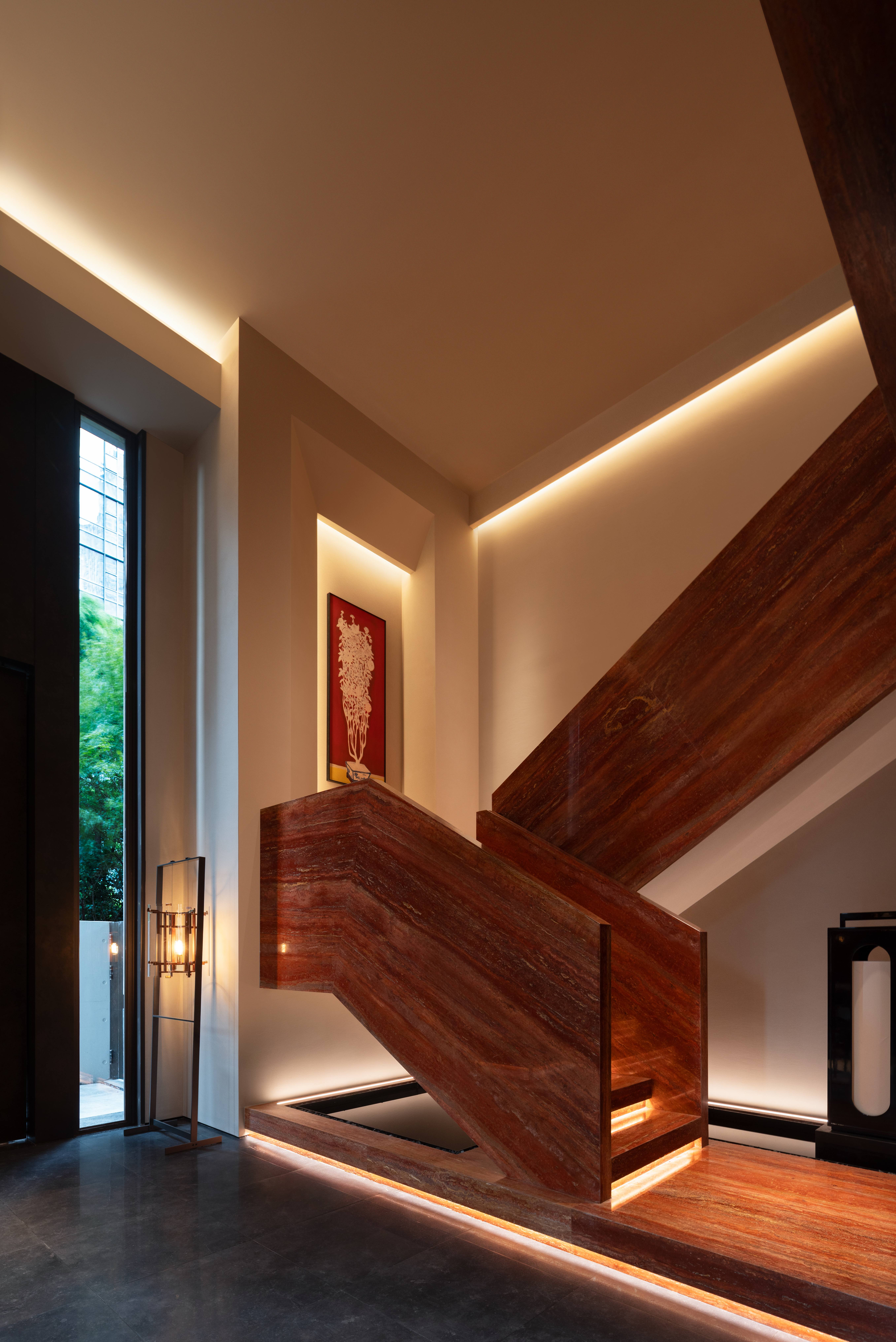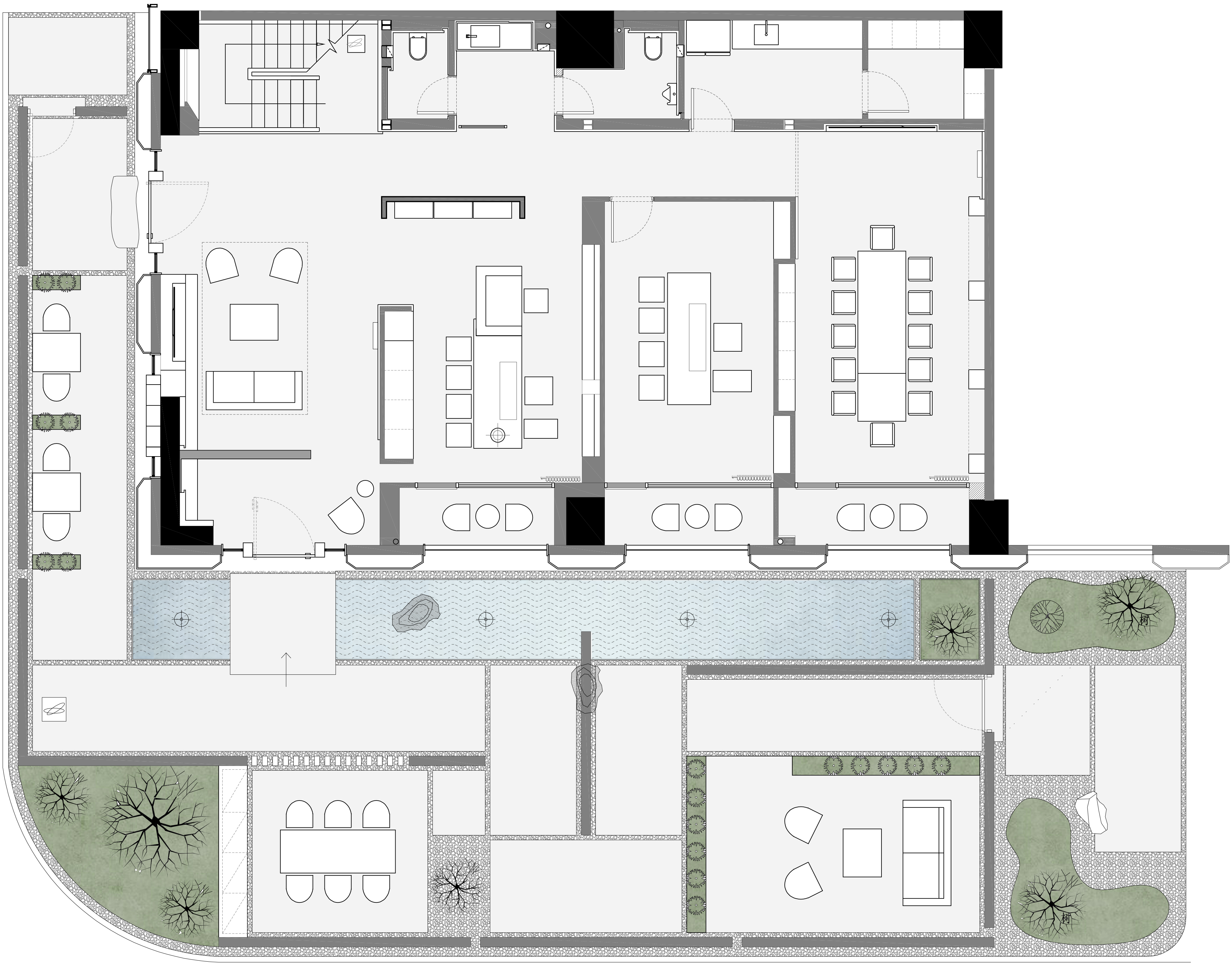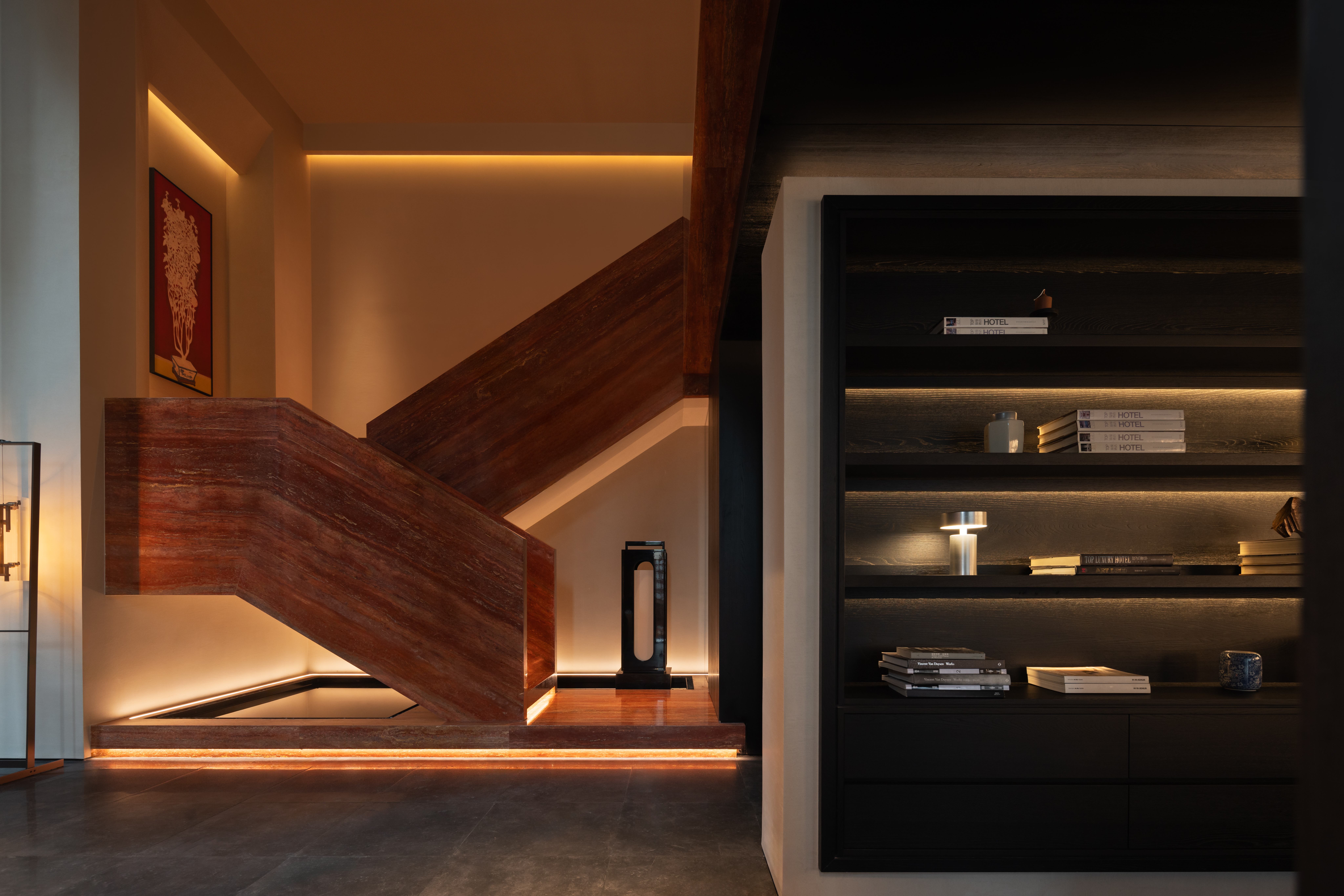 空间布局:项目纵向延展一、二层空间,周边业态丰富,真正的隔离需要从隔离周边环境开始。通过梳理入口动线,从户外庭院到室内布局,构建出专属动线。由此,场地被重新界定,内外有别、动静相隔,营造成一个独立于外部世界的小宇宙。
