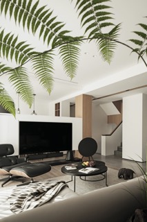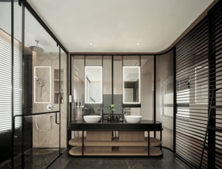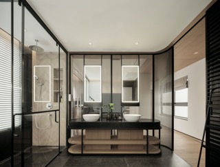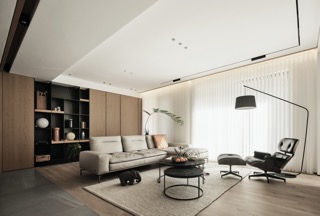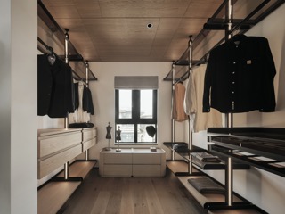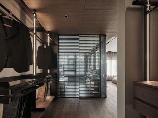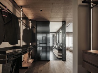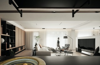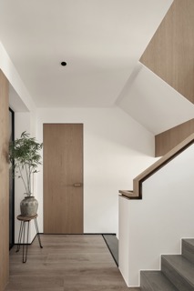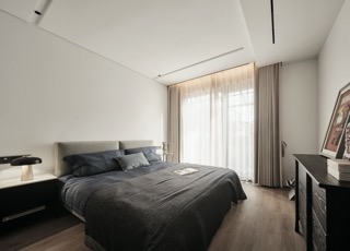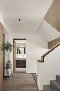 设计选材:设计师希望,当家主人在此居住三四十年,这里仍能适配一家人的各种状态。 对视觉作重新梳理,摒弃华而不实的装饰,规避繁杂的图像,使用简洁的颜色和线条,抛弃多重材料的堆砌——在理性逻辑下的减法运算下,家空间成为了主人生活的空白画布。 在这个家中,风景是动态变化的,但气质始终是平衡且平静的。天气阴沉时,空间质感交由灯光完成。选用偏向自然光的光源,在所有较暗角落安置适配光源,是设计师在物理层面完成的一种平衡 以同样的思路,主卧的房门以隐框门的形式从玄关挪入内部,直面“合院”中庭。主卧在隐形门和玻璃的围合下成为一个独立系统。通过系统中的独立小动线,家主人可依次抵达个人衣帽间、卫生间、冲淋区,以及可以看到湖景的泡浴区——主卧的内部功能在丰富紧凑之余并不会对整个居室的留白气质造成任何干扰。