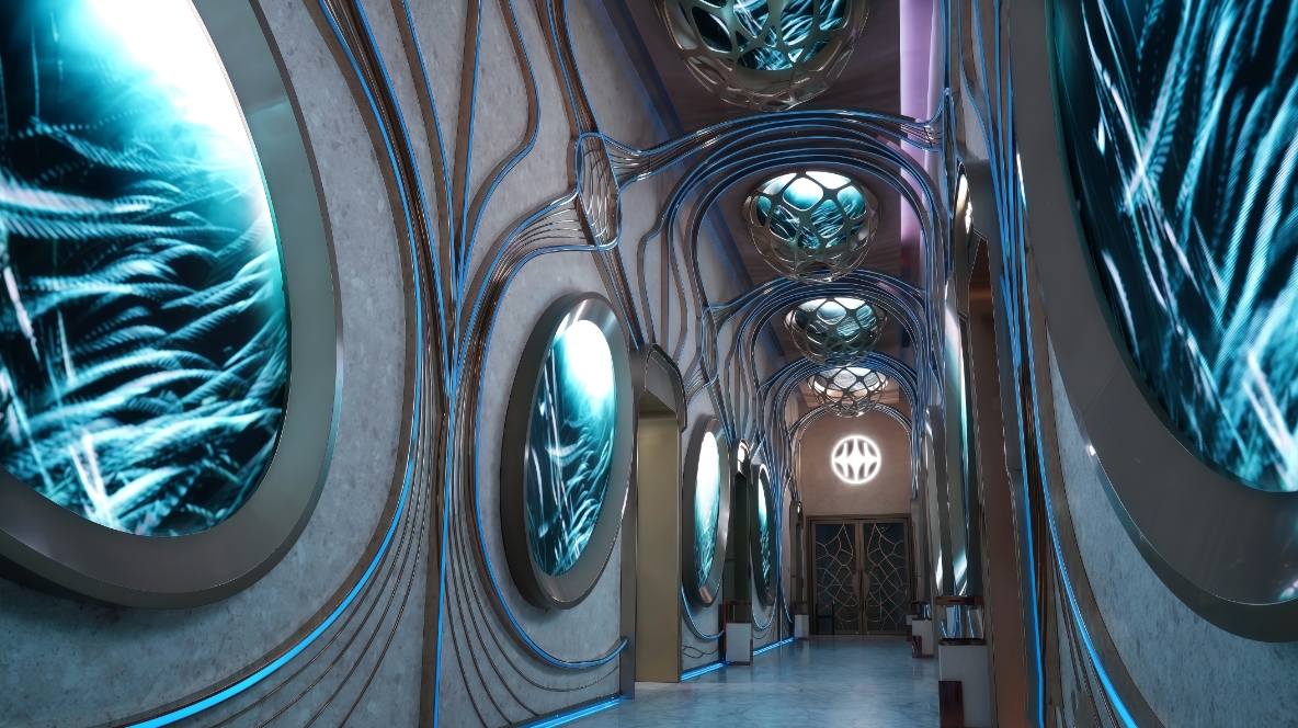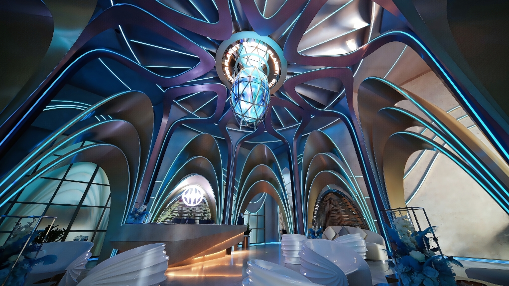 主入口处采用双厅布局作为空间过渡,摒弃传统生硬的直线直角,彻底拥抱流畅无序的曲线和波浪形态,兼顾自然形态的表达与艺术美感的呈现,注重空间功能和空间美学的平衡性。神秘的异星球空间围绕接待台展开左右双动线设计,引用长短不一、大小不同的曲线串联起所有场域动线,有效且自动分流,在起伏中转合、在连贯中流动、引导空间观赏者的视线自然移动至不同场景中。 -
