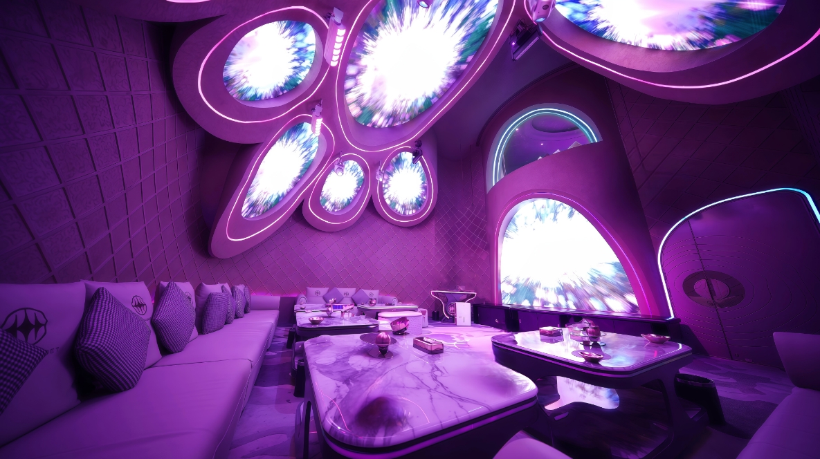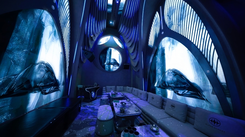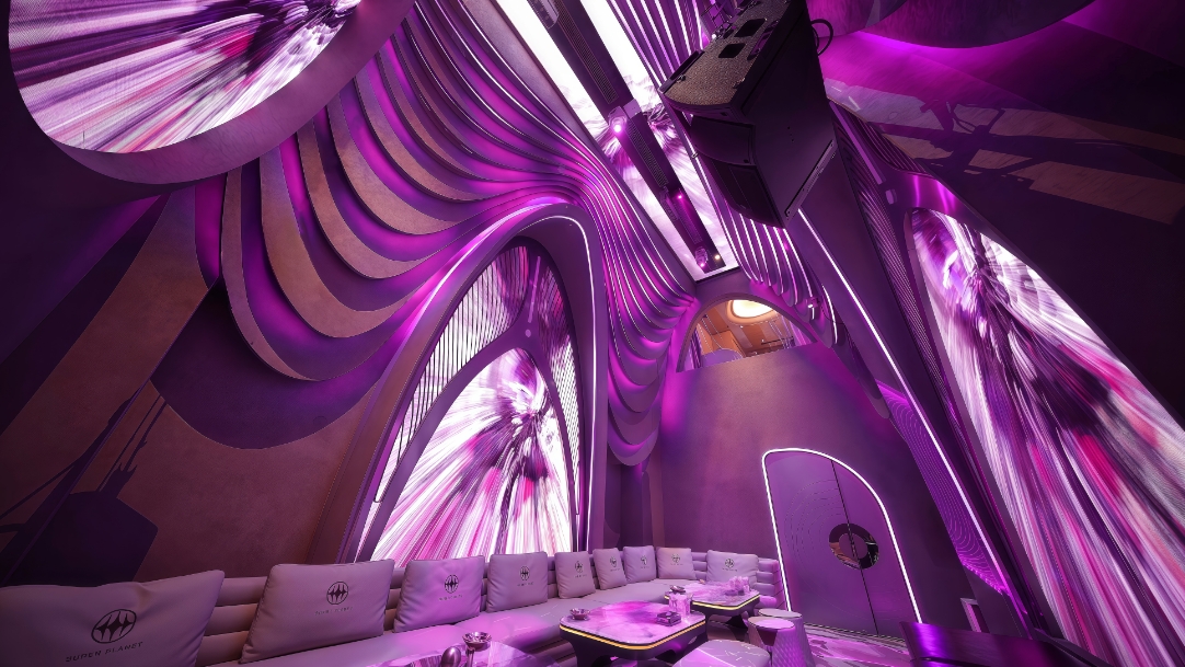 不同包房分别以多个星球体命名,采用不锈钢金属漆等现代材质,结合异形屏和舞美灯光程序,灵动的线条与多维光影交织,营造出动态丰富的视觉氛围。不规则空间与几何形态之间的对比冲突,进一步增强空间的层次感与立体感。