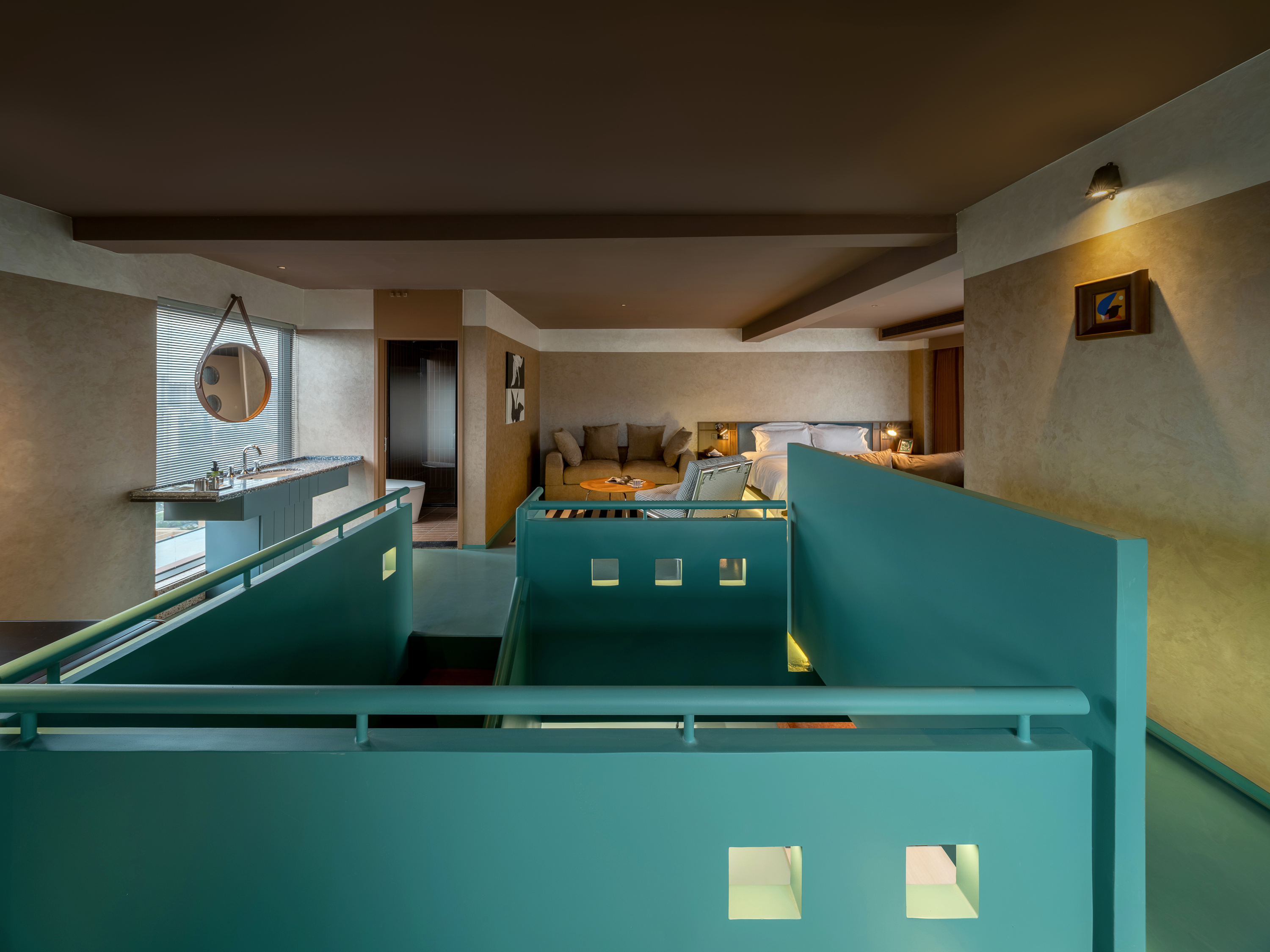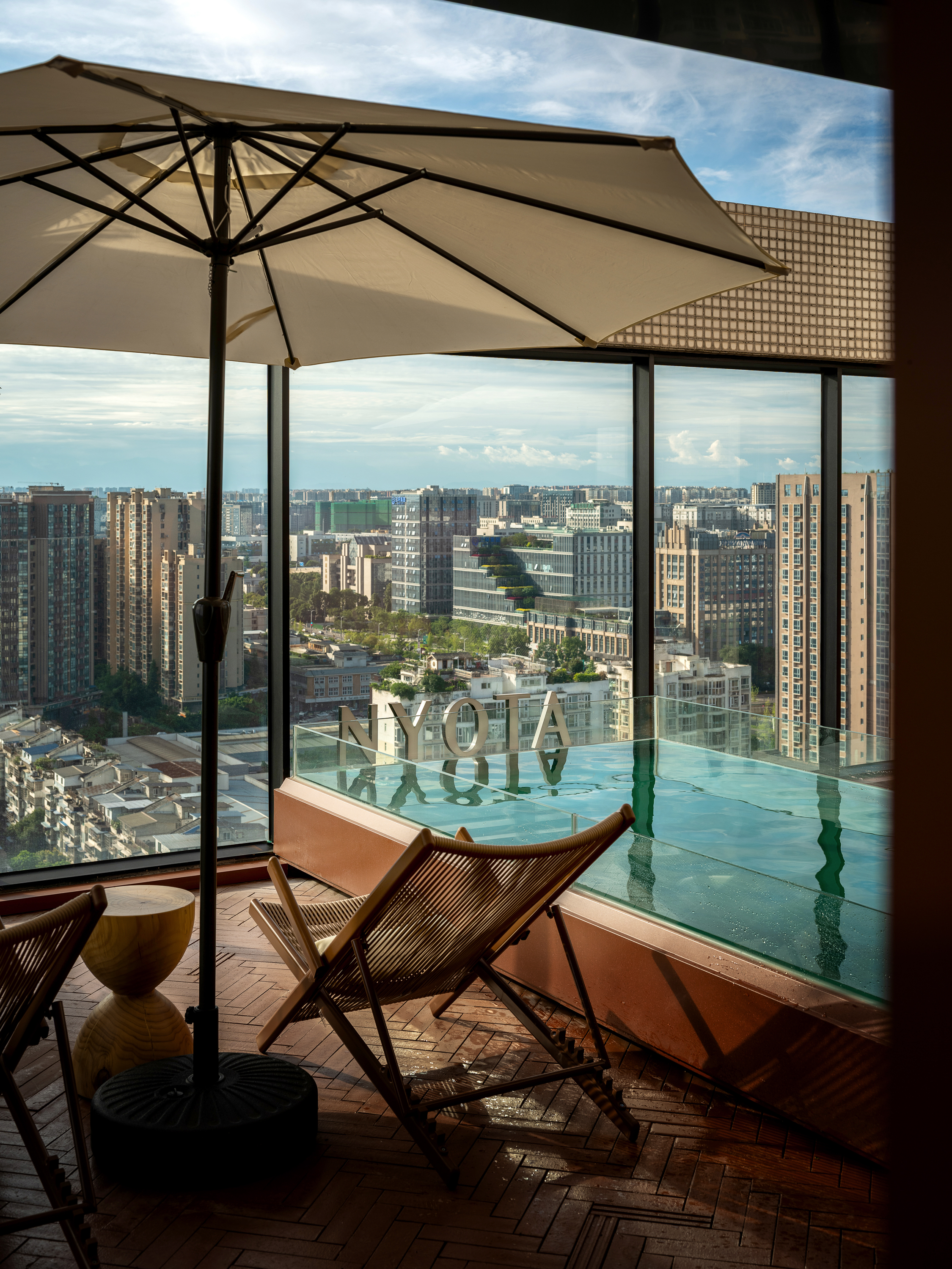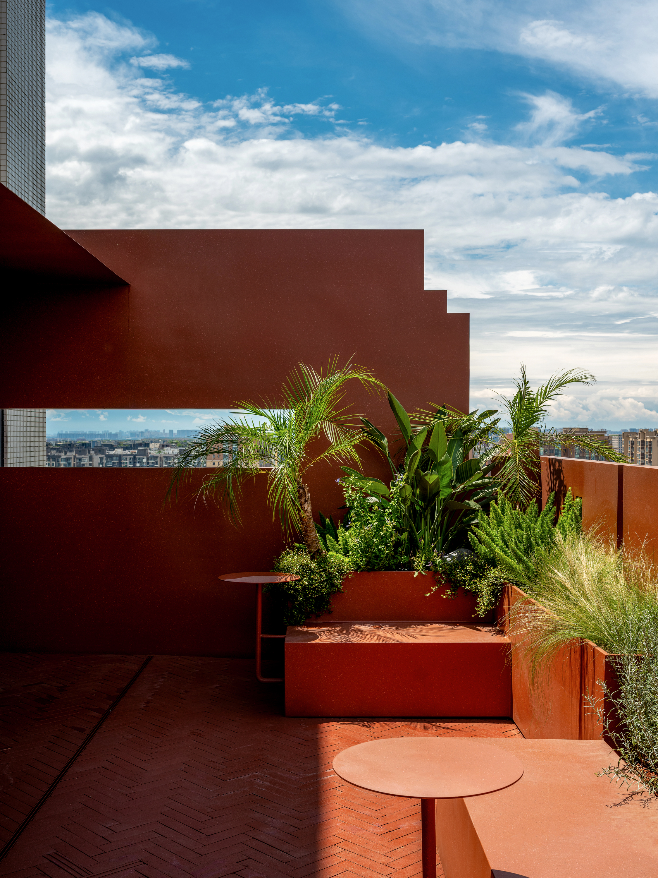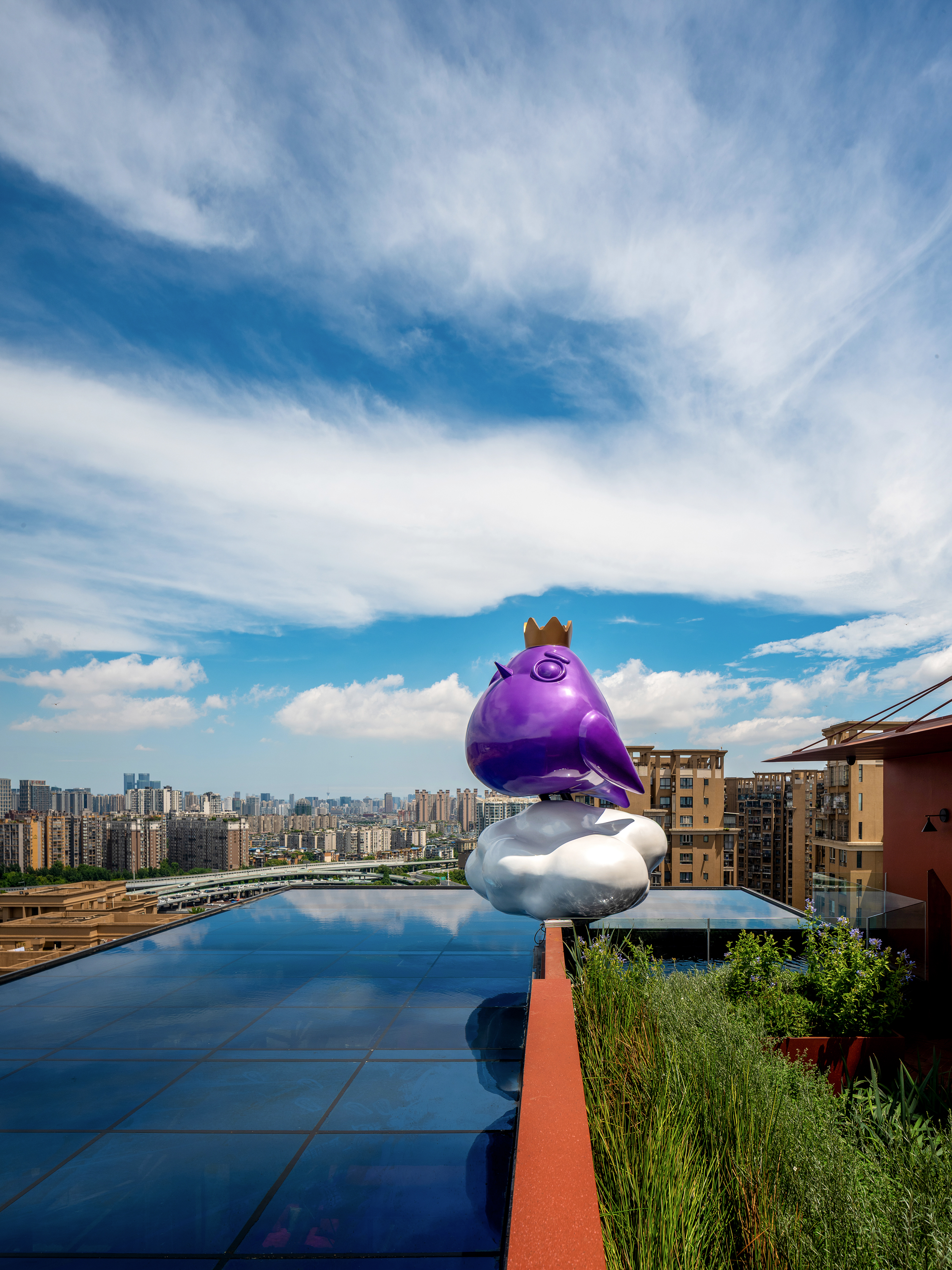 空间意境:酒店大厅在22F芸上空中露台,这里是一座森系秘密花园,棕红色砖片与野系绿植的色彩碰撞美学,白昼深呼吸,入夜微醺时,凝为杯沿盐粒与叶间月光。在酒店24F屋顶天台,我们设计了一个云雀IP,它是自由、希望与愉悦的化身,它疲惫又骄傲的姿态,恰如旅人挣脱束缚,追寻慰藉与焕新的旅程。我们以此为灵感,在云端为每一位宾客打造了一方远离喧嚣的自由天地。愿您在困惑中找到归宿,在宁静中重获力量,开启一段充满希望与美好的时光。