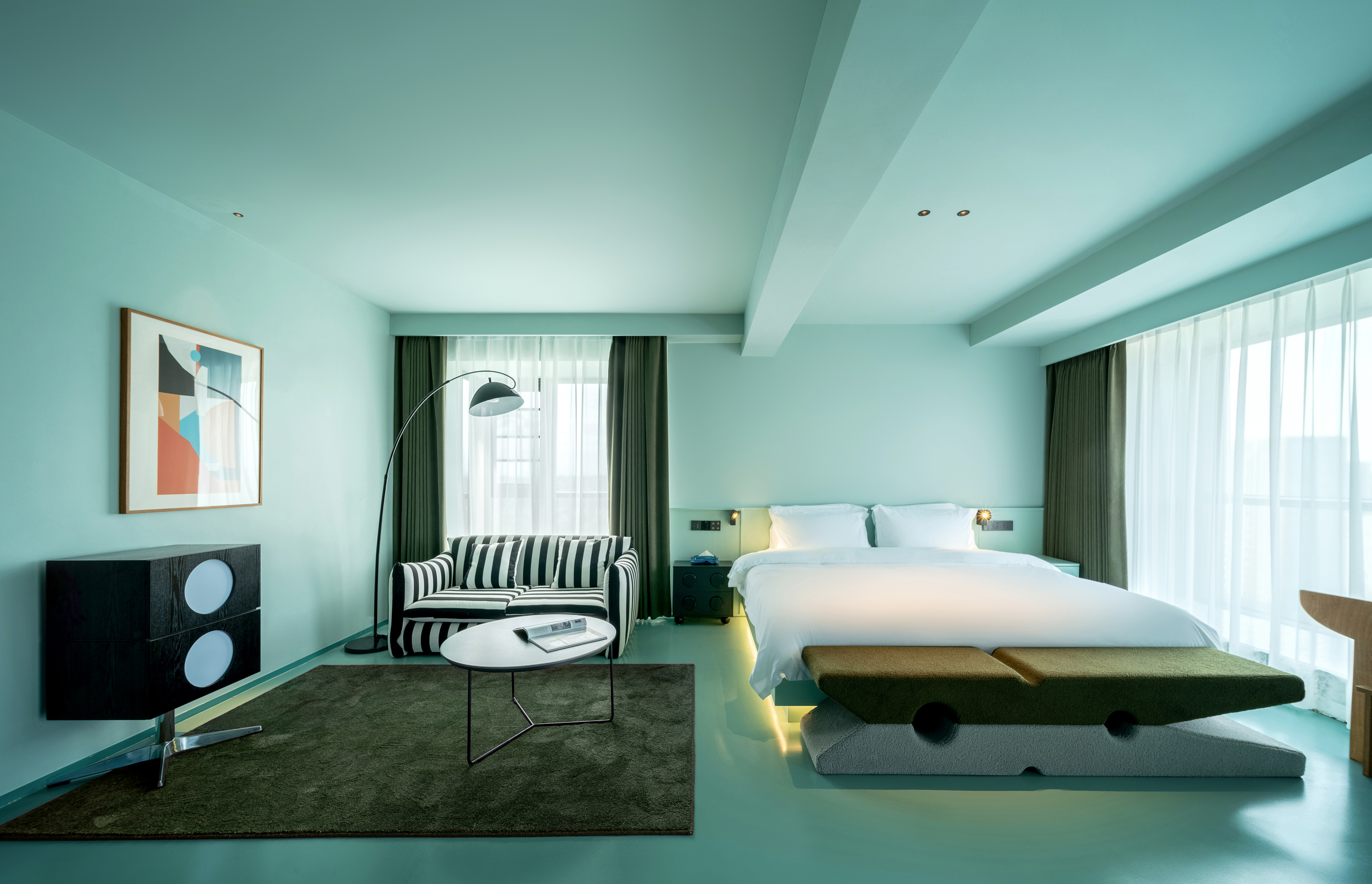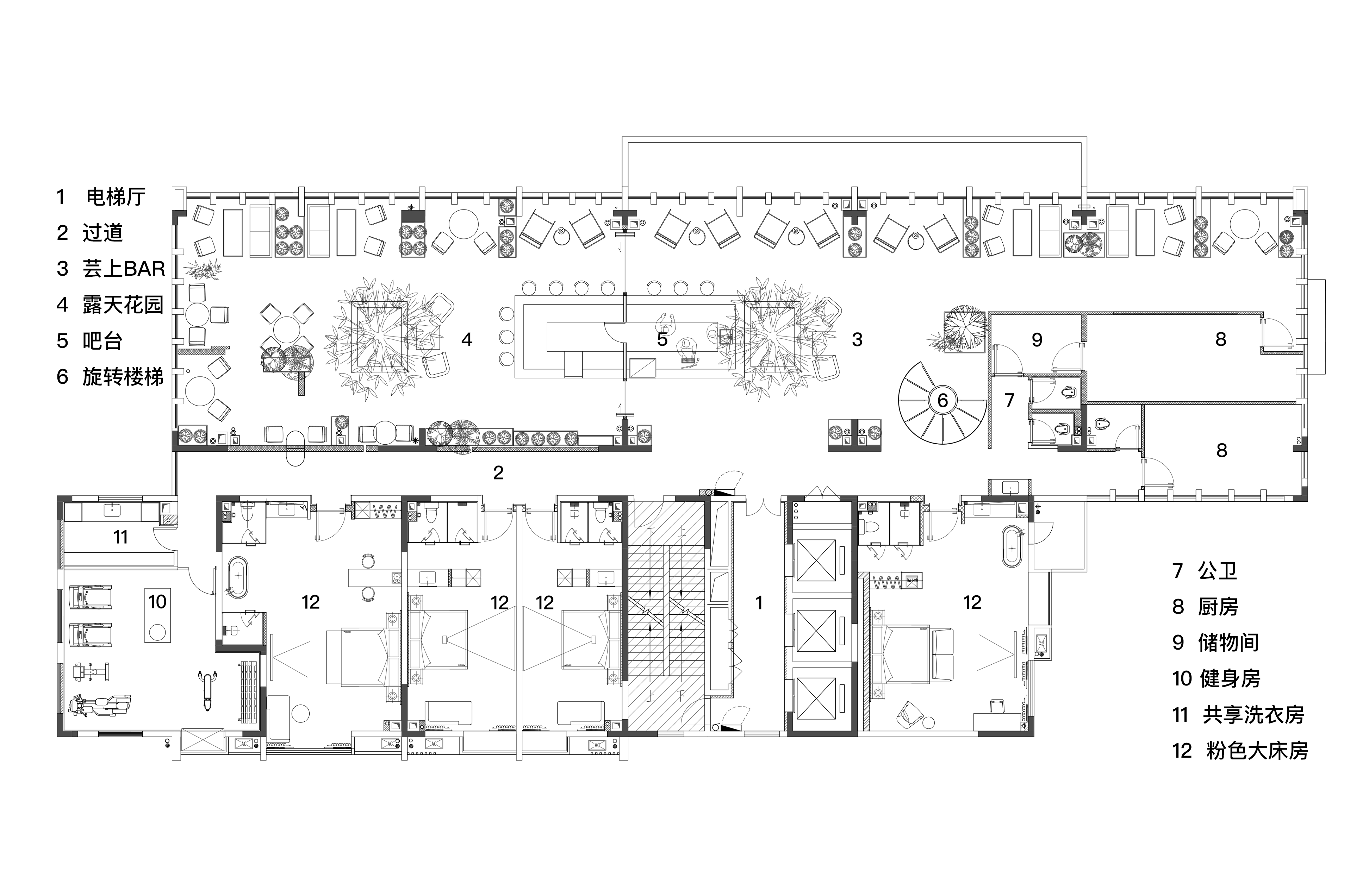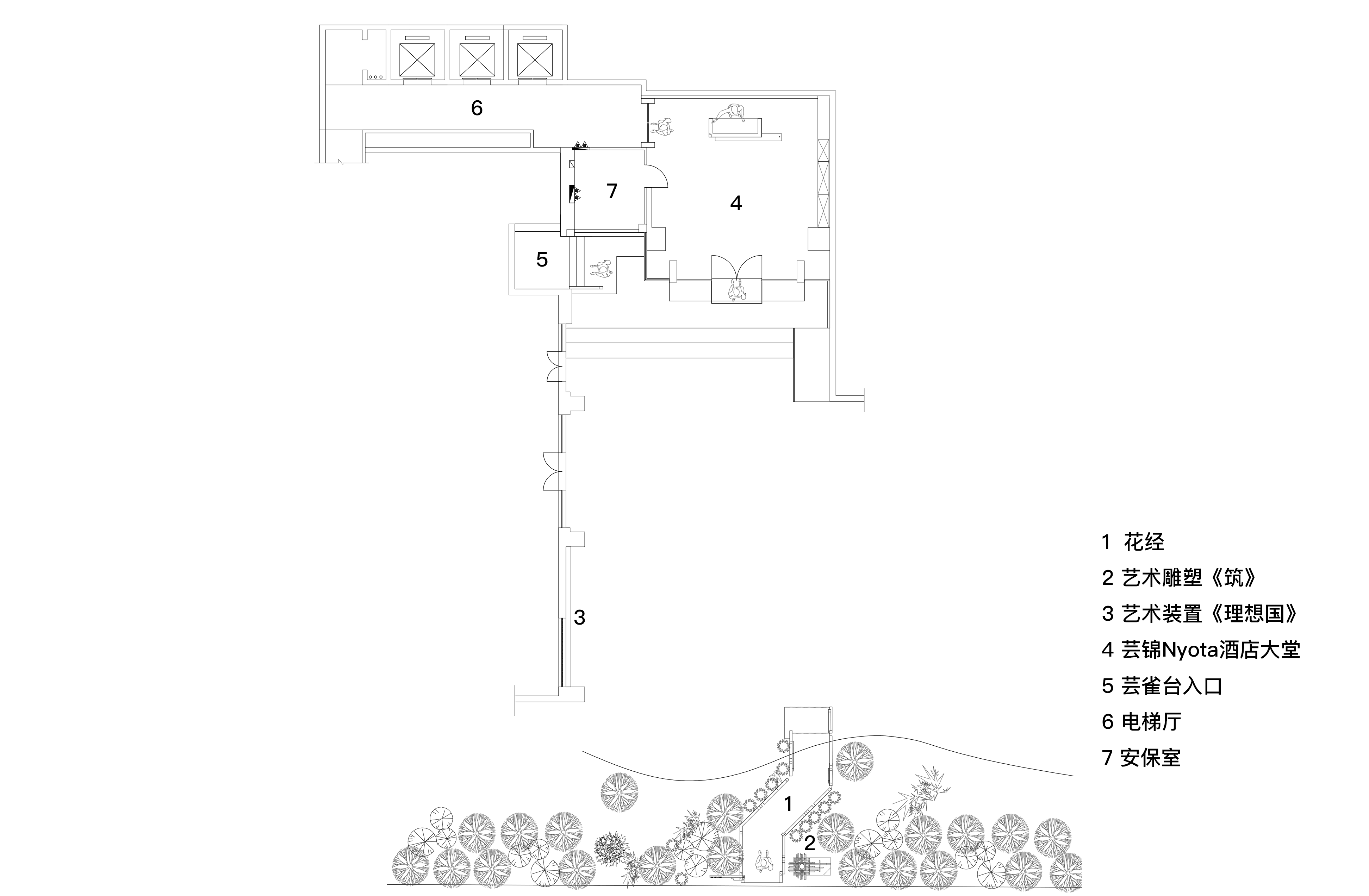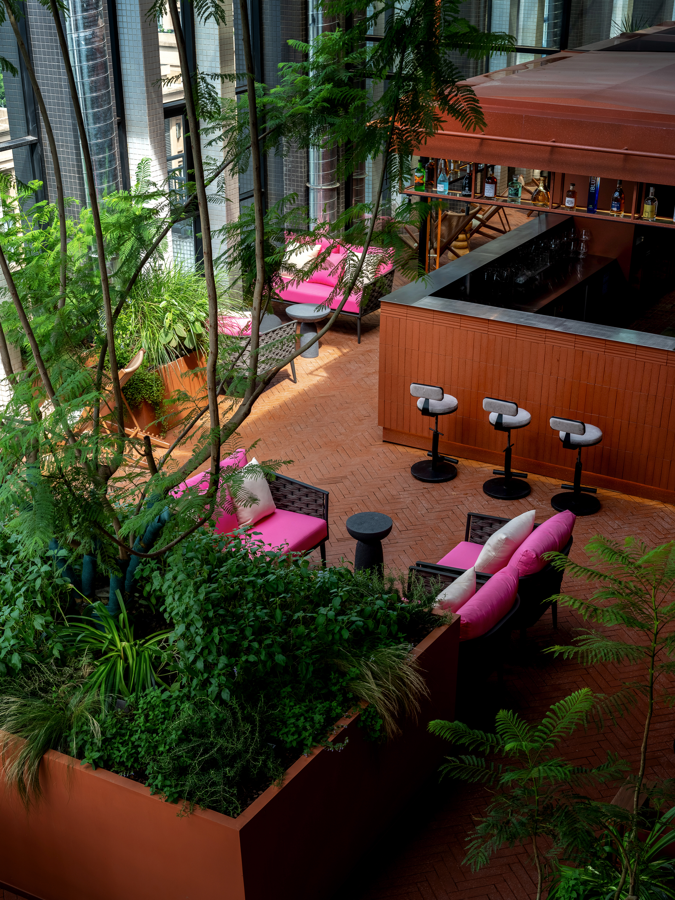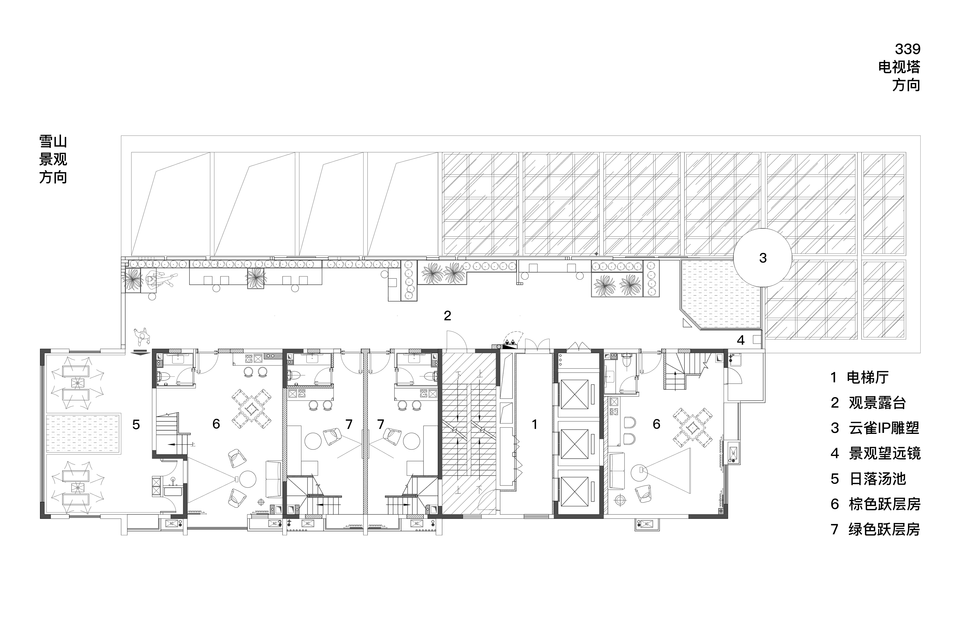 空间意境:酒店大厅在22F芸上空中露台,这里是一座森系秘密花园,棕红色砖片与野系绿植的色彩碰撞美学,白昼深呼吸,入夜微醺时,凝为杯沿盐粒与叶间月光。在酒店24F屋顶天台,我们设计了一个云雀IP,它是自由、希望与愉悦的化身,它疲惫又骄傲的姿态,恰如旅人挣脱束缚,追寻慰藉与焕新的旅程。我们以此为灵感,在云端为每一位宾客打造了一方远离喧嚣的自由天地。愿您在困惑中找到归宿,在宁静中重获力量,开启一段充满希望与美好的时光。