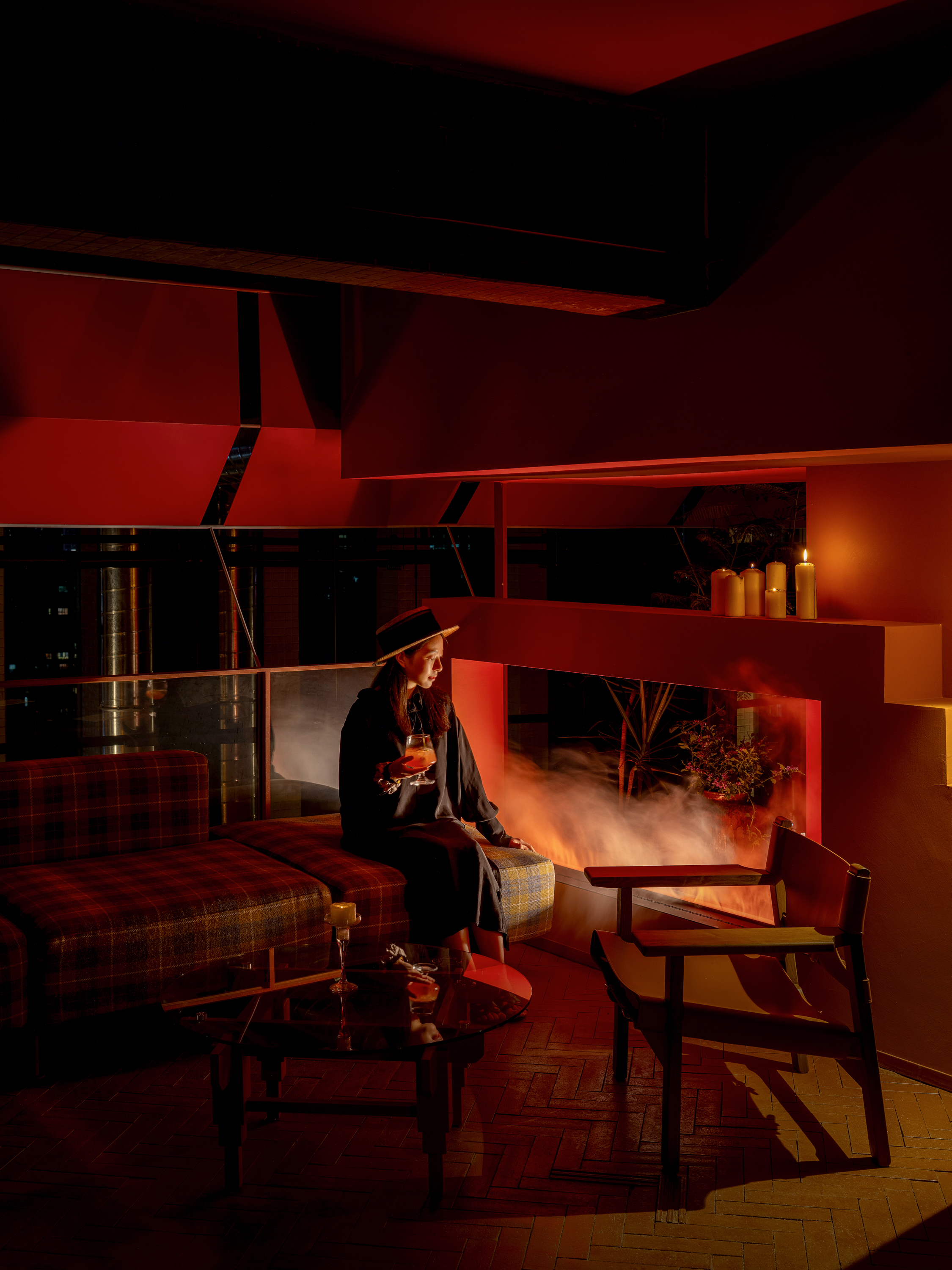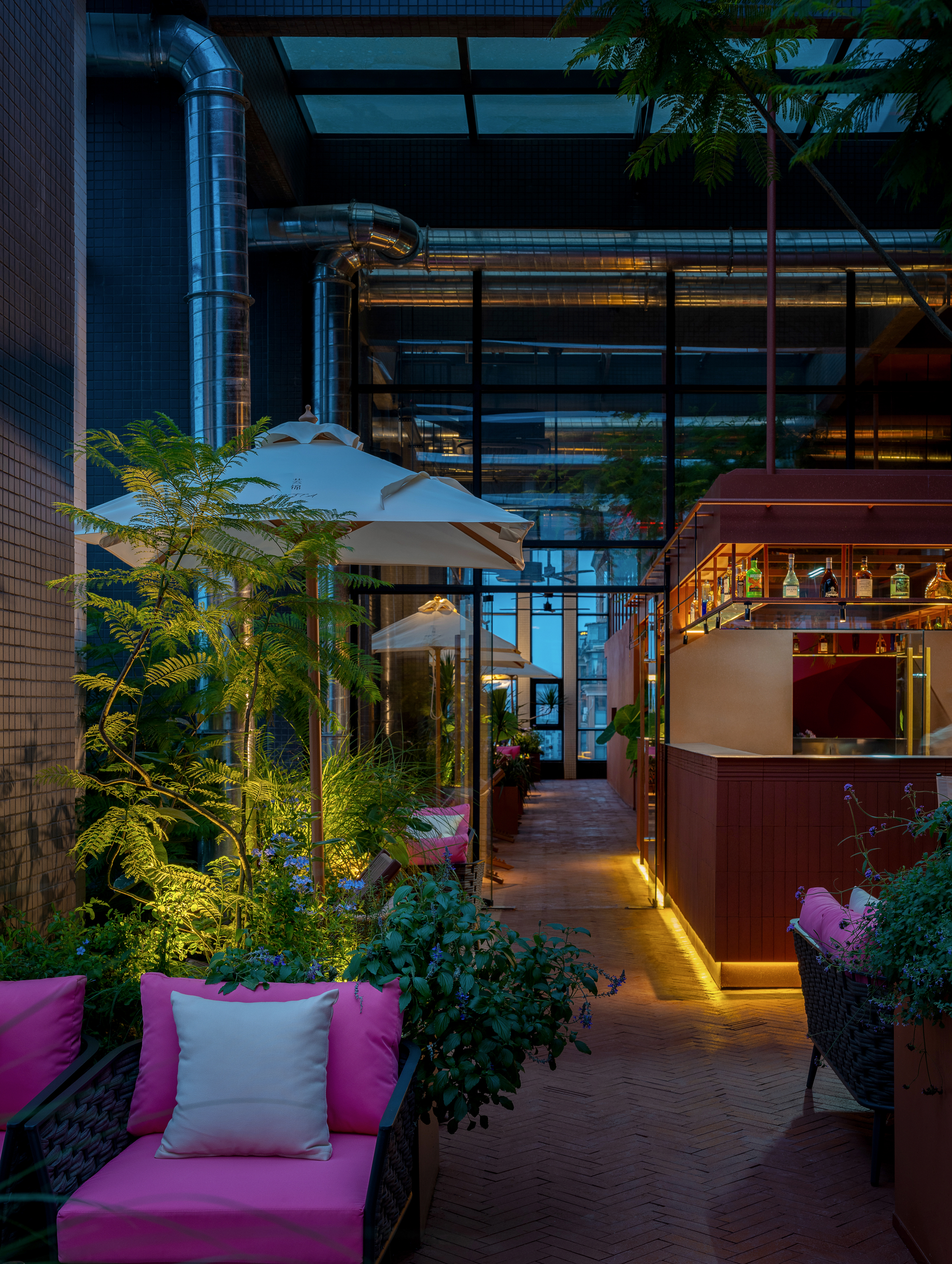 空间布局:烟火之上,砌起一座红色“桥梁”,与四周的绿草野花交织成美妙的滤网,阻隔街道喧嚣,成为酒店与市井的柔性边界。复刻了登临云端寻花而入的仪式感:弯腰穿过烟火,挺直遇见云端,凝结为可触碰的视觉寓言。