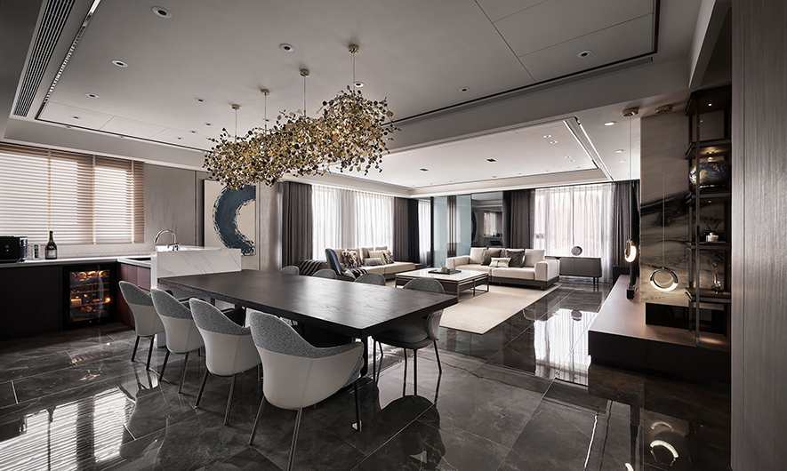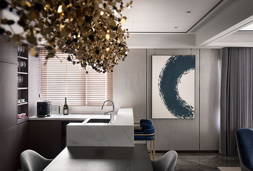 ▲餐厨区餐桌连结白色石纹吧台,提供轻食准备兼休閒的理想场所。一幅蓝灰渐层的抽象画作与另一侧的圆弧水墨画,为该区注入艺术气息,同时再次呼应上空四颗吊灯,强调「圆满」之意。