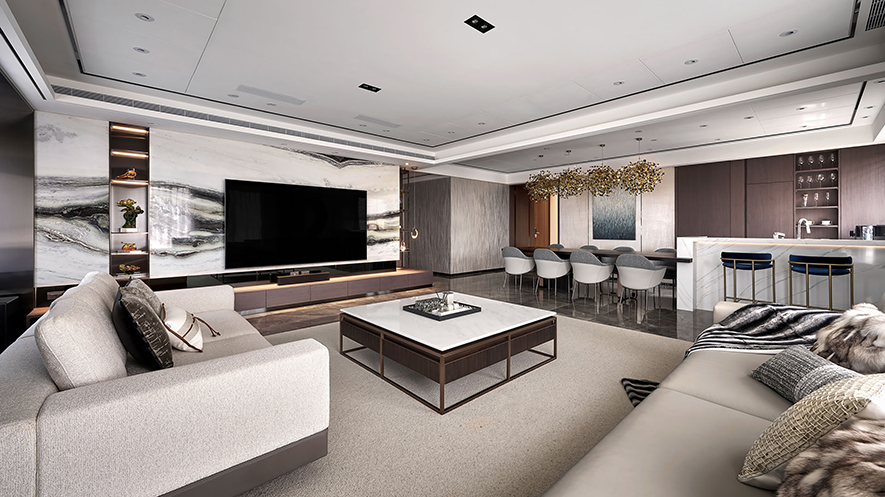 42此次 简兆芝室内设计 主持设计师 简兆芝 以家宅作品《璞玉天成》参赛,透过延展户外河流美景为屋内主牆的灵动纹理,勾勒长龙盘卧意象并寄託吉祥祝福,更淬鍊出石材奢华精緻的时髦风范,结合漫室暖灰的和柔温馨,成就优雅兼具暖意的崭新设计,与APDC大赛创新宗旨相契,赢获本届赛事评审团青睐,突破第一阶段审查、取得入围资格!