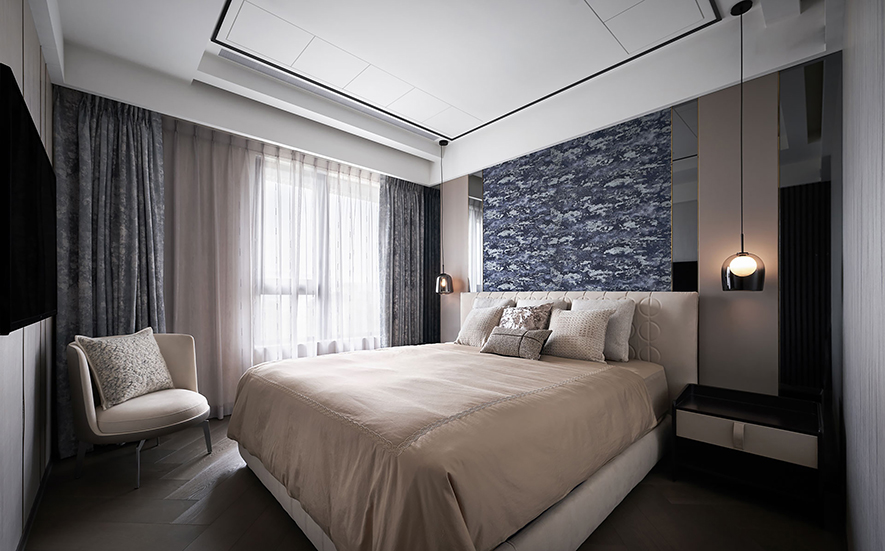 ▲主卧以灰白色为基底,营造宁静沉稳之感,床头背牆选用深浅交织抽象壁纸,与同色系磁吸丝绒窗帘形成和谐对话,两者在材质视觉效果上相得益彰,为卧室增添层次分明艺术感。