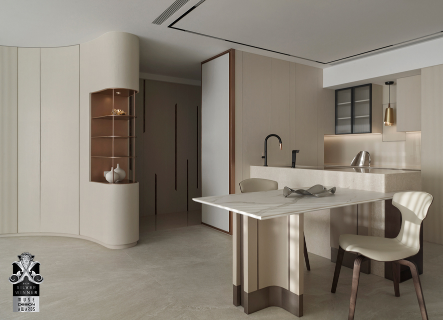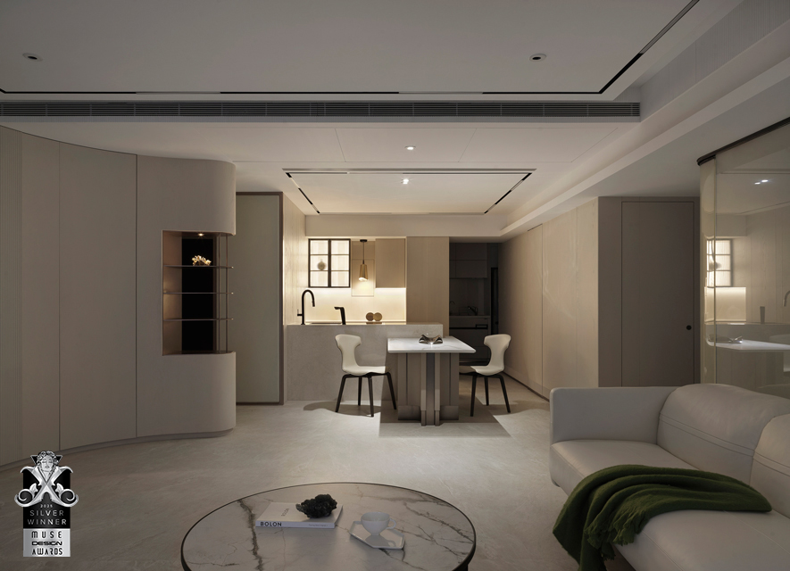 澄境设计 设计总监 郑抿丹 以米色为主调,结合圆弧曲线与异材质搭配,打造轻盈、纯淨的居住空间,设计上兼顾美学与实用性,运用灵活布局提升居家舒适度,为一家四口提供温馨、优雅的居住体验,作品《弧光柔艺》受到本届赛事评审瞩目,喜获银奖佳绩!