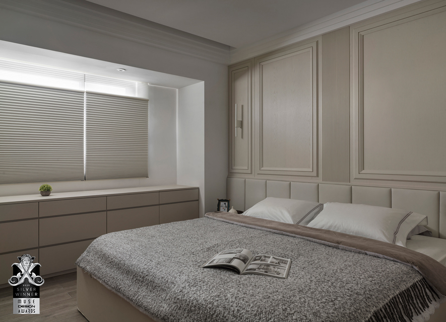 ▲主卧延续公领域的米色及线板造型,温暖调性与简洁画面构筑舒心酣眠场所;窗畔梳妆桌旁设置内含插座的储纳柜,贴合生活习惯,提升日常便利性。