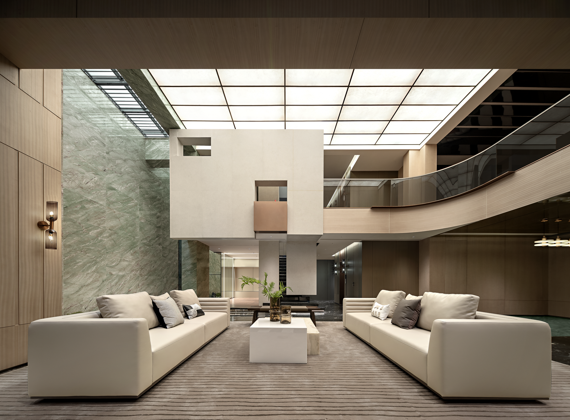 设计选材:客厅沙发线条带有现代东方的硬朗建筑细节,援引其价值内核,同时凌冽的花绿色大理石增添了一分冷静淡泊的气质,用淡雅而自然来表达婉转而流畅的气度。