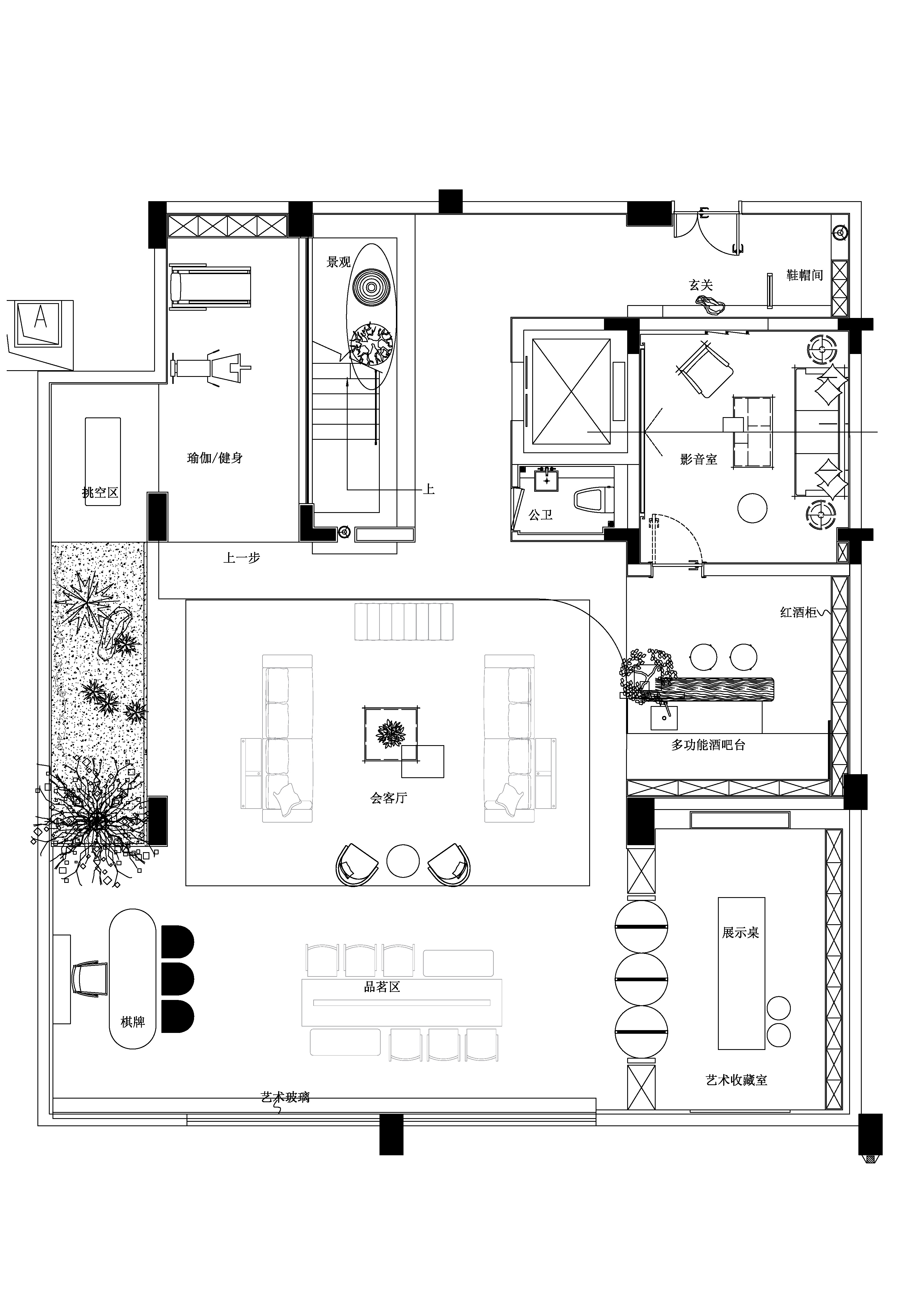 空间布局:空间以雅度为弦,结成脆亮悠长的清雅腔调,空间兀自盛开,自然的质感与艺术线条融为一体,奠定了整个空间的基调。木色如水般流泻,经由弧线切割横向线条向左右延展,大理石像山脉的纹理铺展开来,亲历那难以瞬时尽揽的空间丰富与错综,空间以建筑细节的体块排布出疏密节奏,大气俨然中,营造多维体验,亦不失自然朴质的美学风韵。
