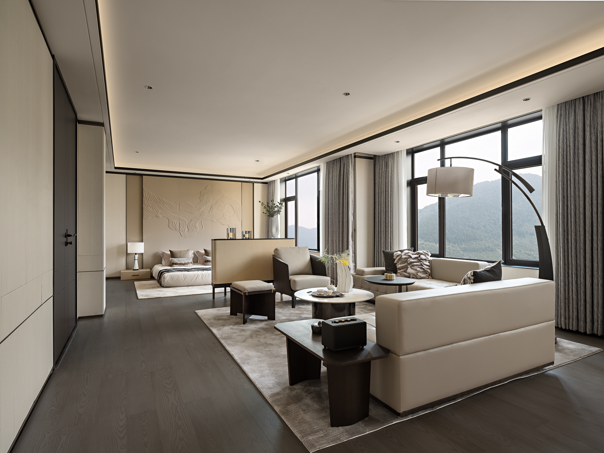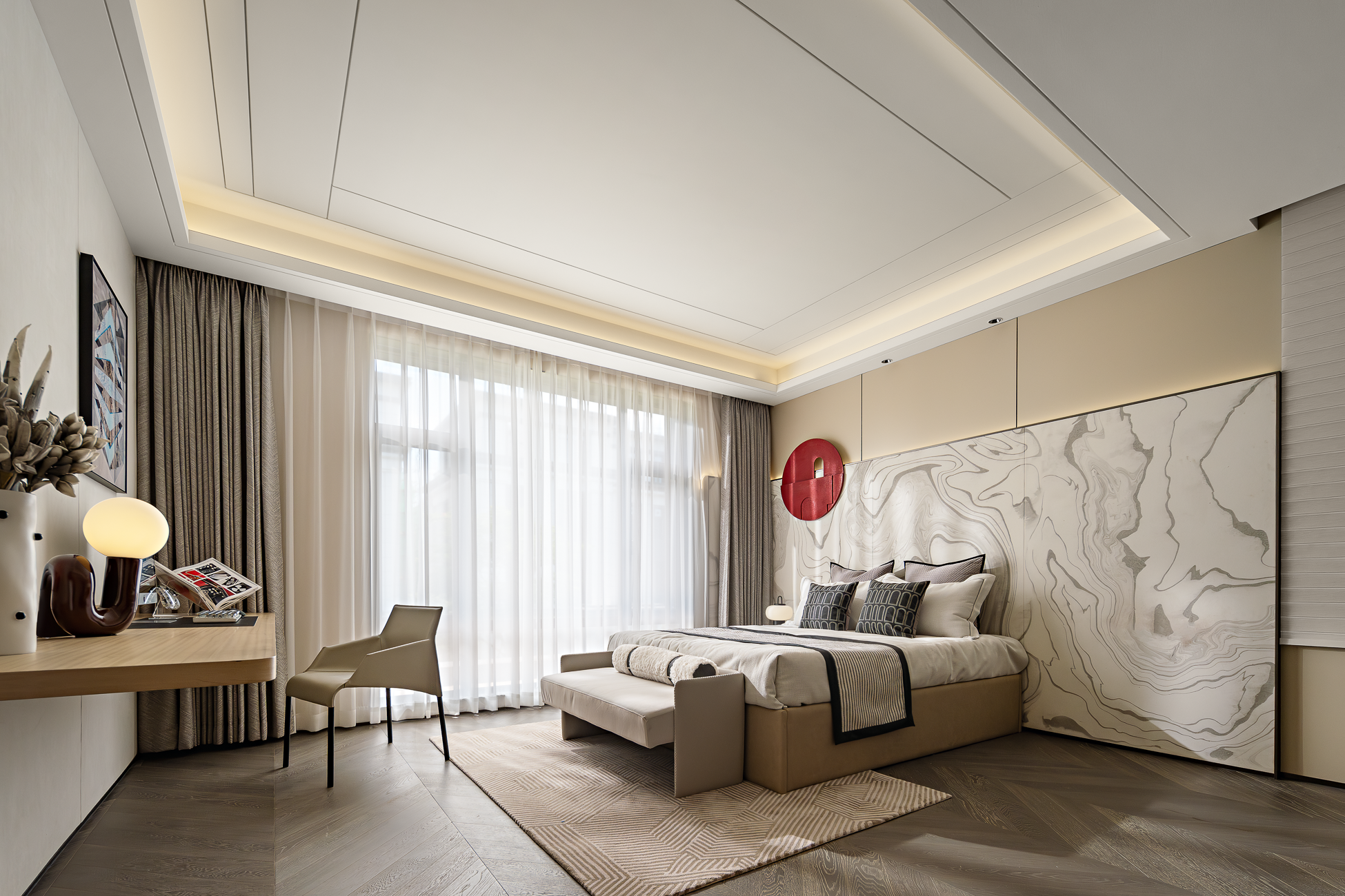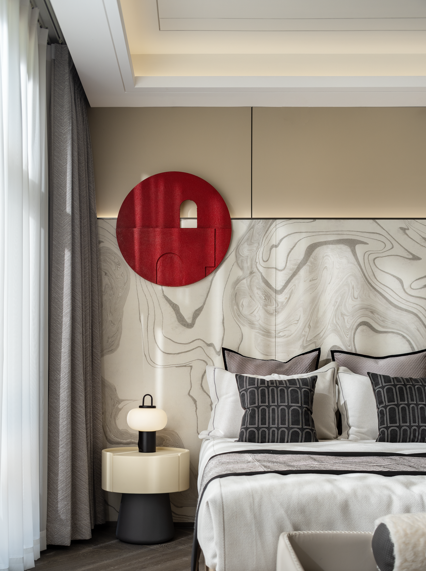 当归家的疲惫逐渐停止翻涌,家具、空间都笼罩进朦胧的睡意里,卧室变得柔软且有包裹感,简约的家具和装饰,融入柔和的弧线灯和雅致的色调,让环境光的漫反射更加柔和,营造一种放松的氛围。背屏浮雕营造内敛温雅的氛围,仿佛提醒人们去除尘世的浮华,细品生活与艺术的点滴优雅。