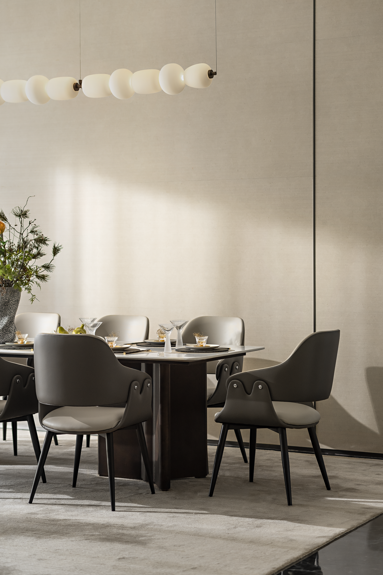 “开放式”厨房并厨入餐,顺势利用间隔结构打造对景趣味。稳重的灰色与皮革材质餐椅,隐含着生活的厚度,以圆润弧形倒角削弱生硬感,同白色构件组构的吊灯相映。充满烟火气的务实派,着眼感知着人间烟火气息的暖意,在杯酒美食萦绕的每一缕幽香中,绘满生活的画卷,三餐共享,四季相伴。