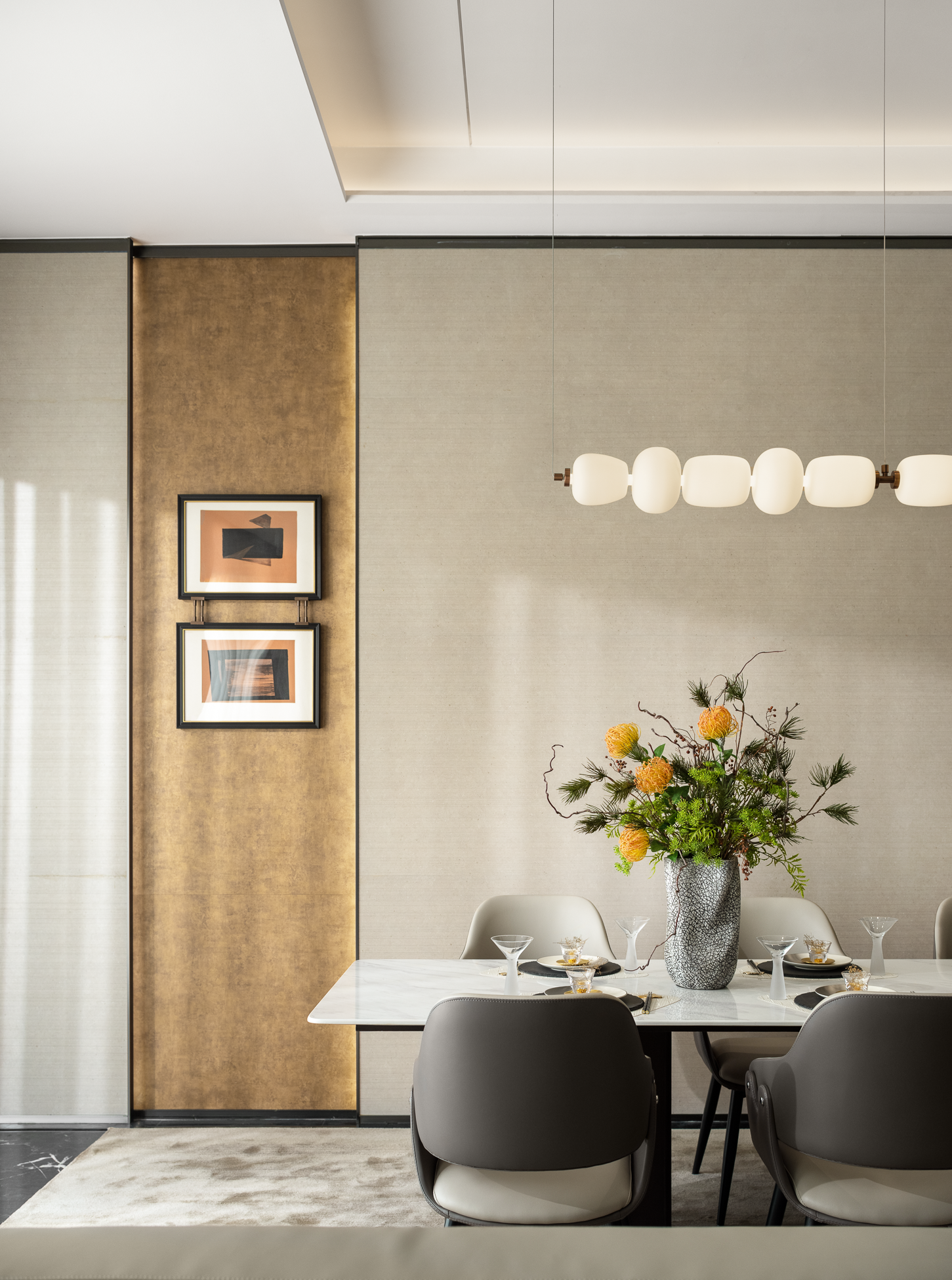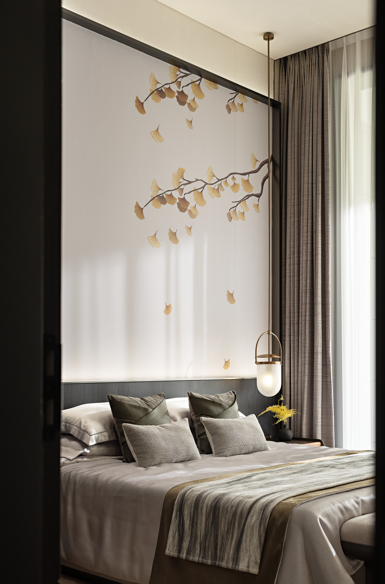 奢的肌理与雅的气盾相得益彰,金色的银杏叶于墙面零落飘逸,刻写在空间场景生动的细节之中,搭配极具现代东方设计感的家具,柔和的光影让整个空间变得朴实静谧,如一幅淡雅的画。 -