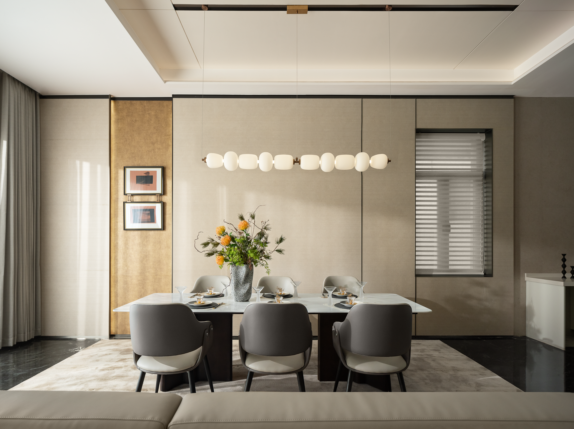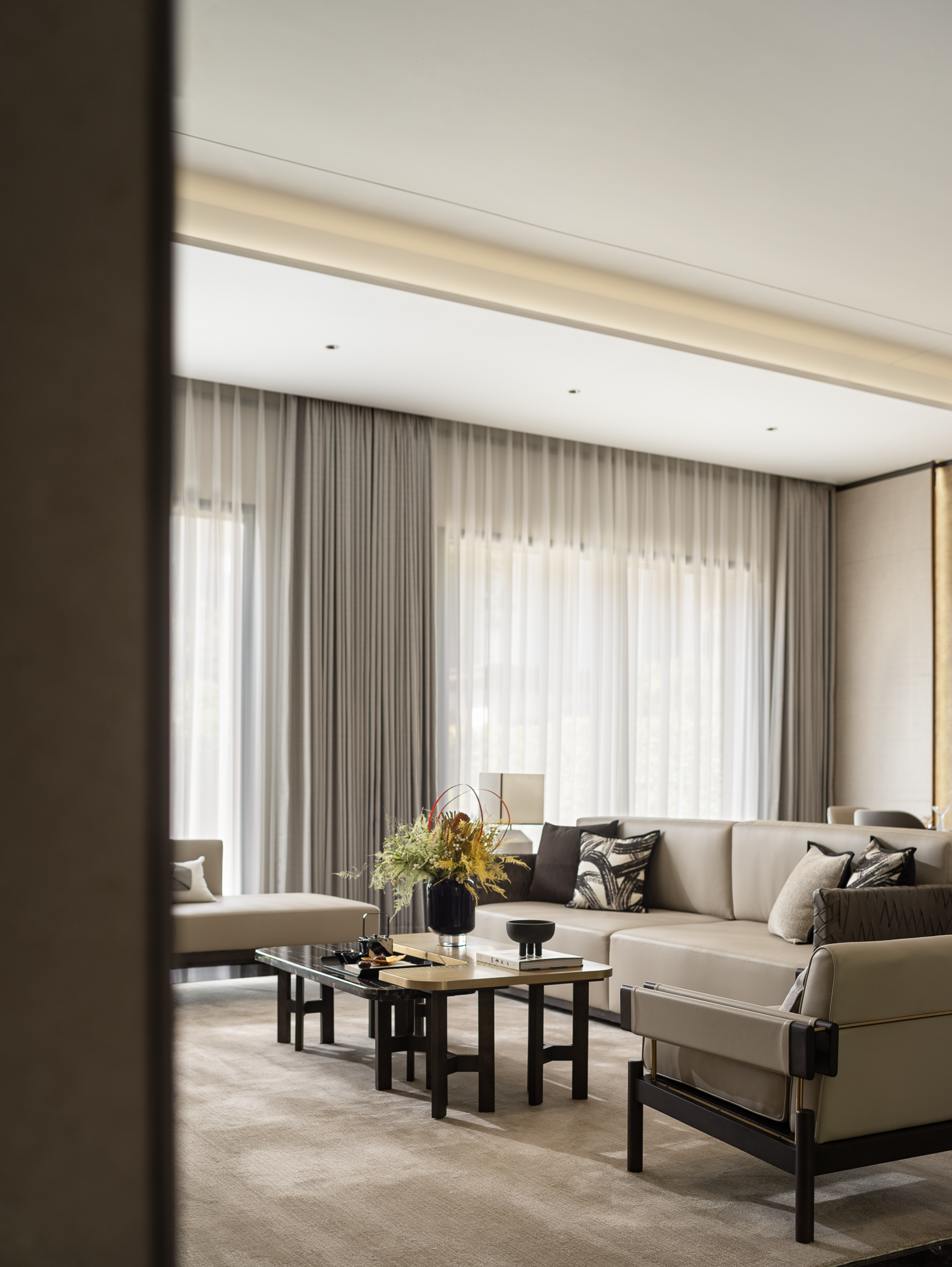 空间意境:吞吐自如、大气开阔的格局,东方意蕴与现代风尚的碰撞,突破地域和时空在客厅中得以升华,重塑现代东方之美。纵向贯通的大面积落地玻璃窗,带来了优渥的采光与通风,与自然的云生日落相望相接。