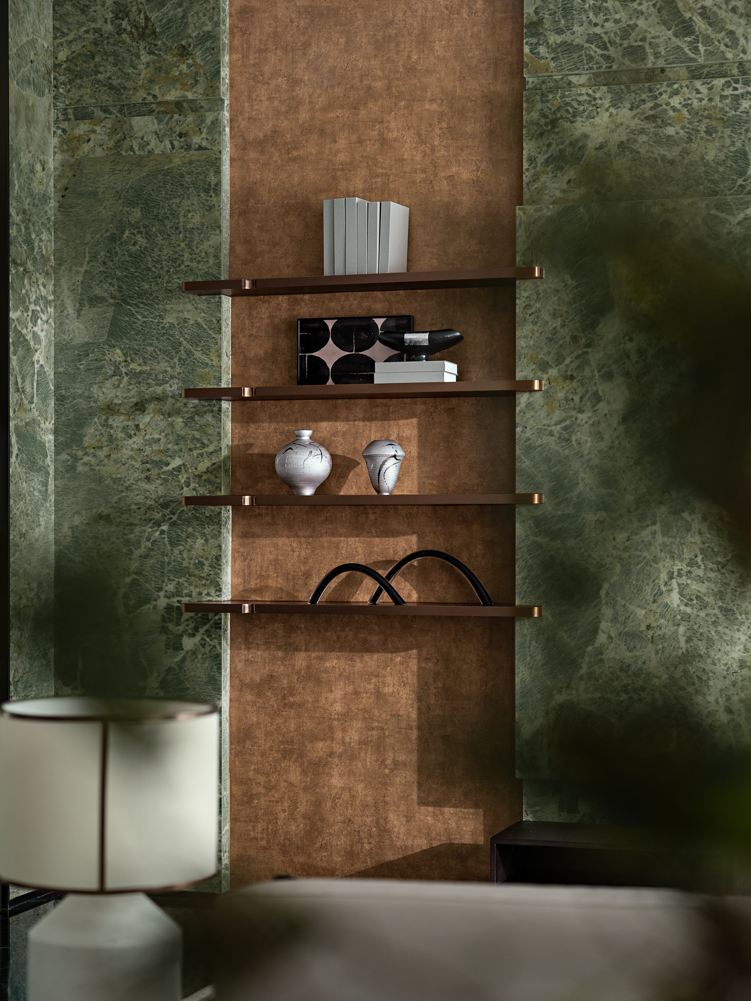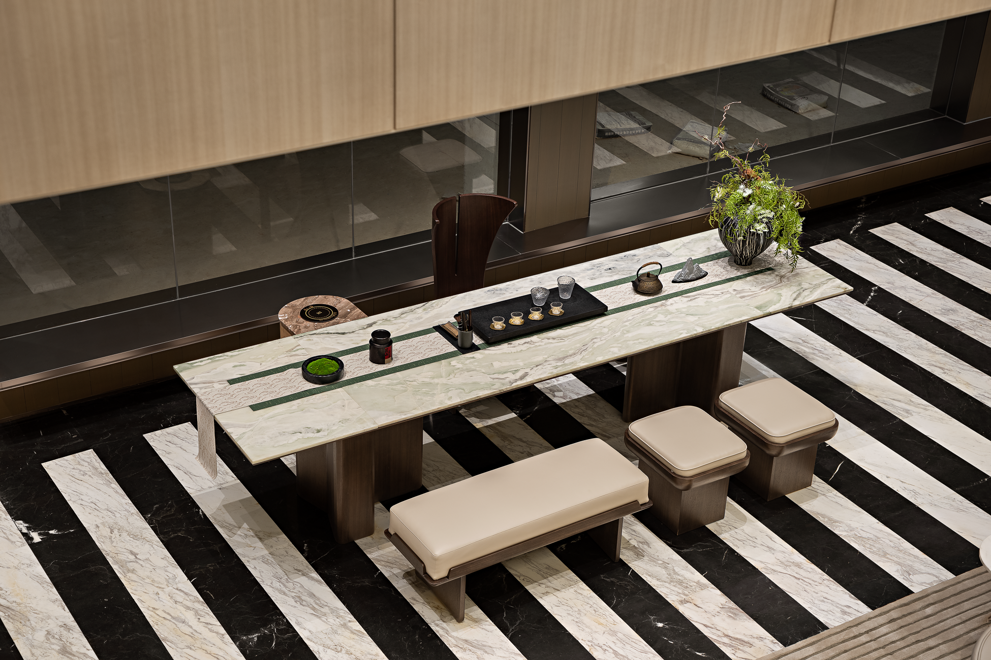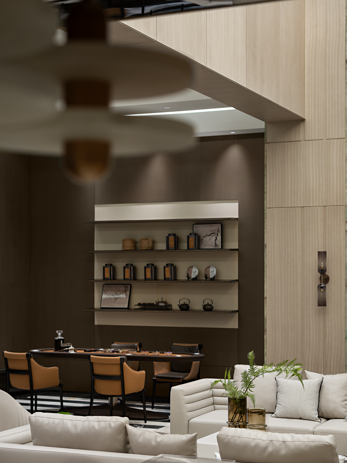 沙发背后隐匿着一处多功能茶室空间,设计塑造为一处以社交为核心的“第三空间”,为生活方式开辟诸多可能性。茶室涵摄了感官、情绪与记忆的交织拓展至“群体”与“时间”的维度,当空间沉静,将雅趣生活与器物融合,形成宁静高古之意。