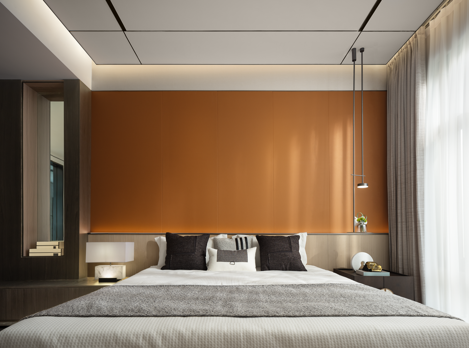 影影绰绰的那一抹橘红,是一片闲适空间里的妙笔生花,沉浸于这简洁木质调的现代东方气息与宁静的美学氛围中,悠然一方天地,自是一番“偷得浮生半日闲”的从容。
