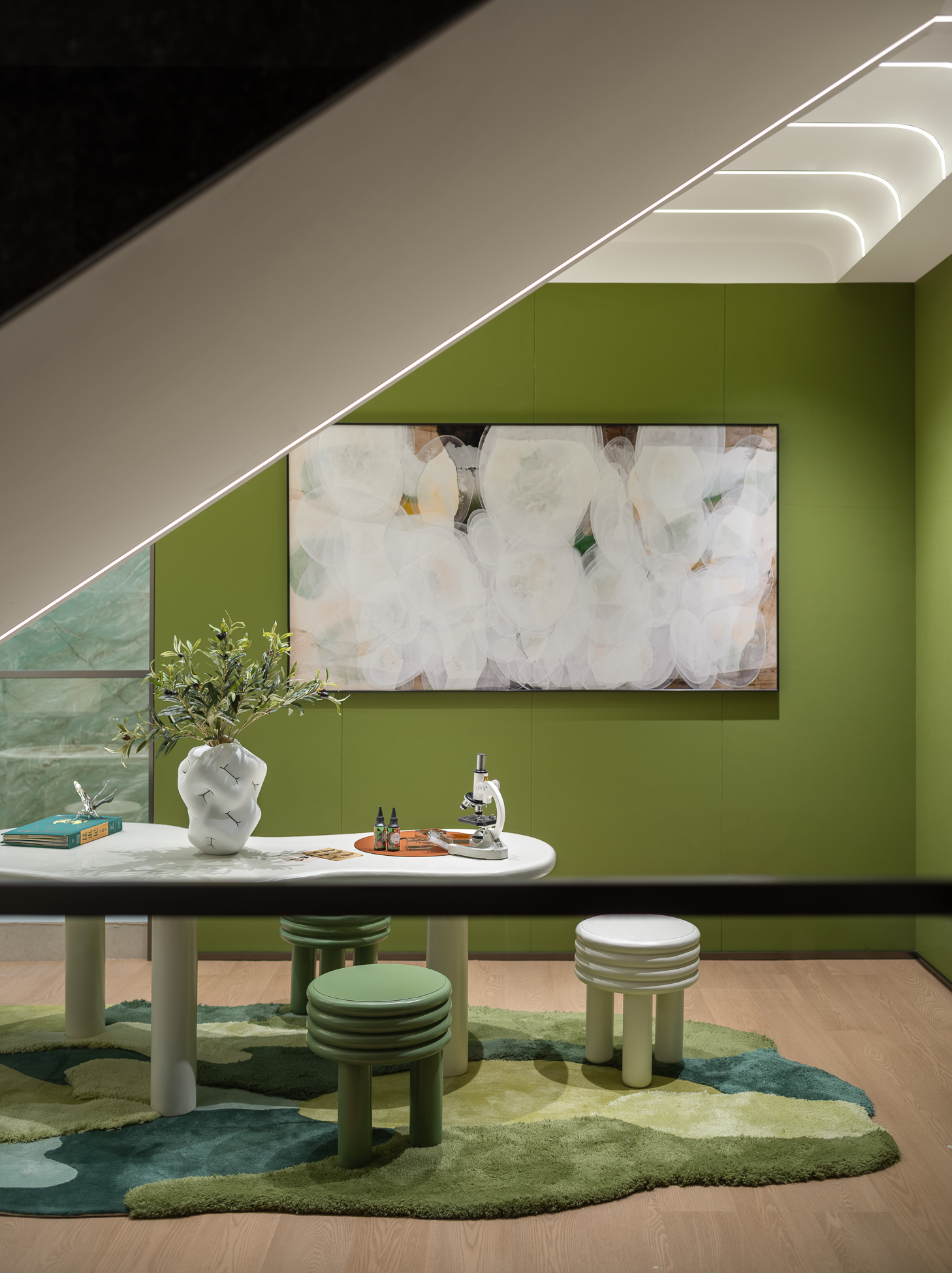 城市因人而筑,空间因人而融,人与人的共鸣于此聚集。设计以社交属性为交点,多维感受与休闲功能交融铺展开来,转译为颜色鲜绿的休闲区,白色挂画呼应桌椅,于时光中不断流动出清新之境,成为生活瞬间的日常凝聚,处处皆雅意,时时皆妙趣。
