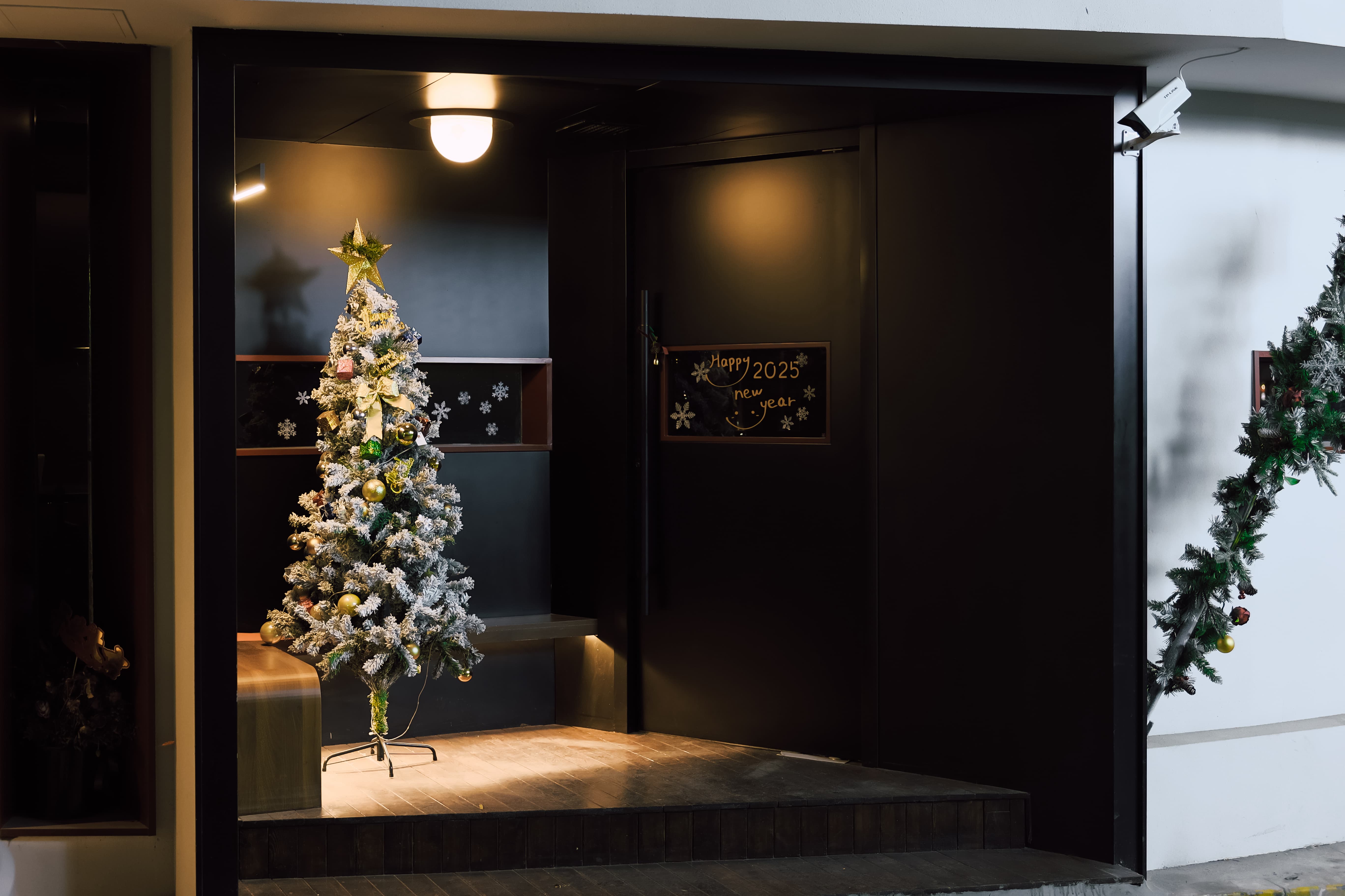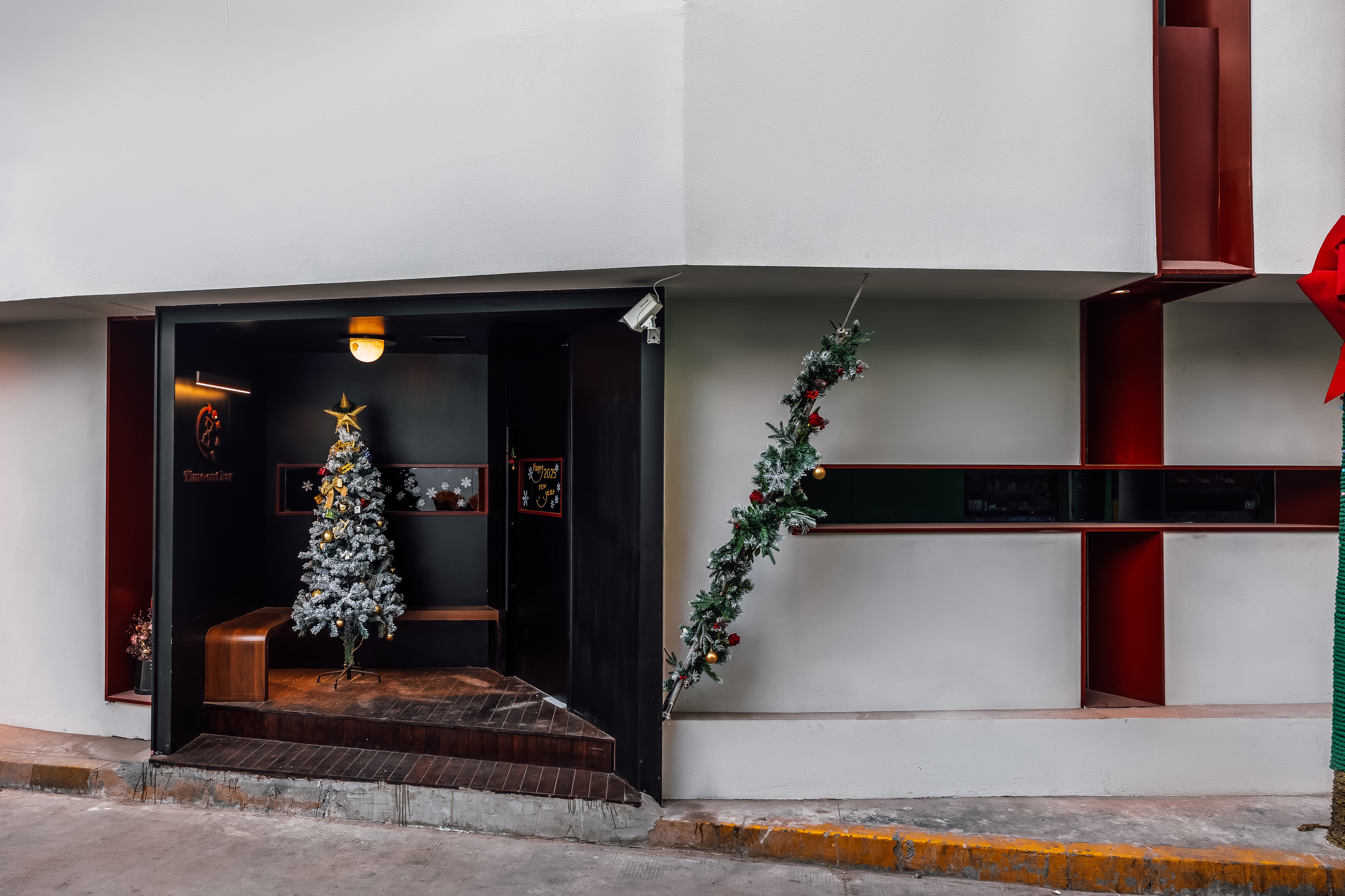 空间意境:设计灵感来自于体块的碰撞与融合,黑色门厅类似一个方盒,搭配暗红色的偏轴门,带来视觉的冲击,入口采用回退手法,让入口处成为适合的吸烟处,也因独特的造型与跳色,营造出不同的效果,所谓每个角度都有不一样的感觉.长条型的窗户带来了室内的隐私又带有种种神秘感,竖向的窗户就像是门口电杆的倒影一样,完美解决了公共设施的突兀感。