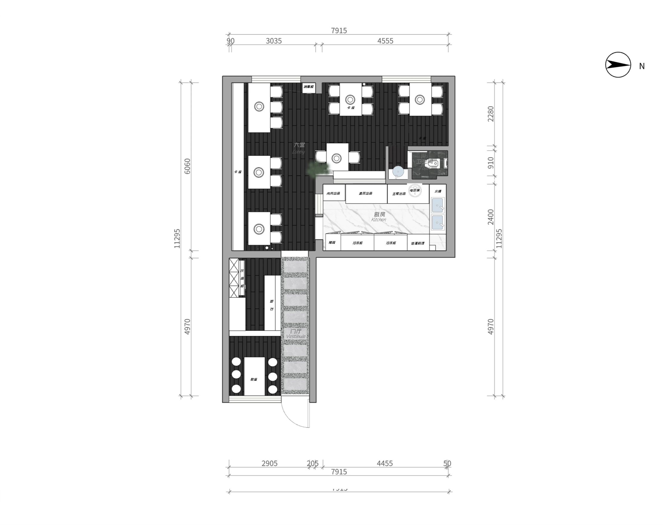 设计选材:●地面黑色木纹砖,墙面黑色PU石与水泥漆,吊顶上方有烟道,考虑美观将顶部整体刷黑,同时也满足深色调风格,卡座上方这几格栅灯,起到造型作用的同时,为就餐区增加采光。